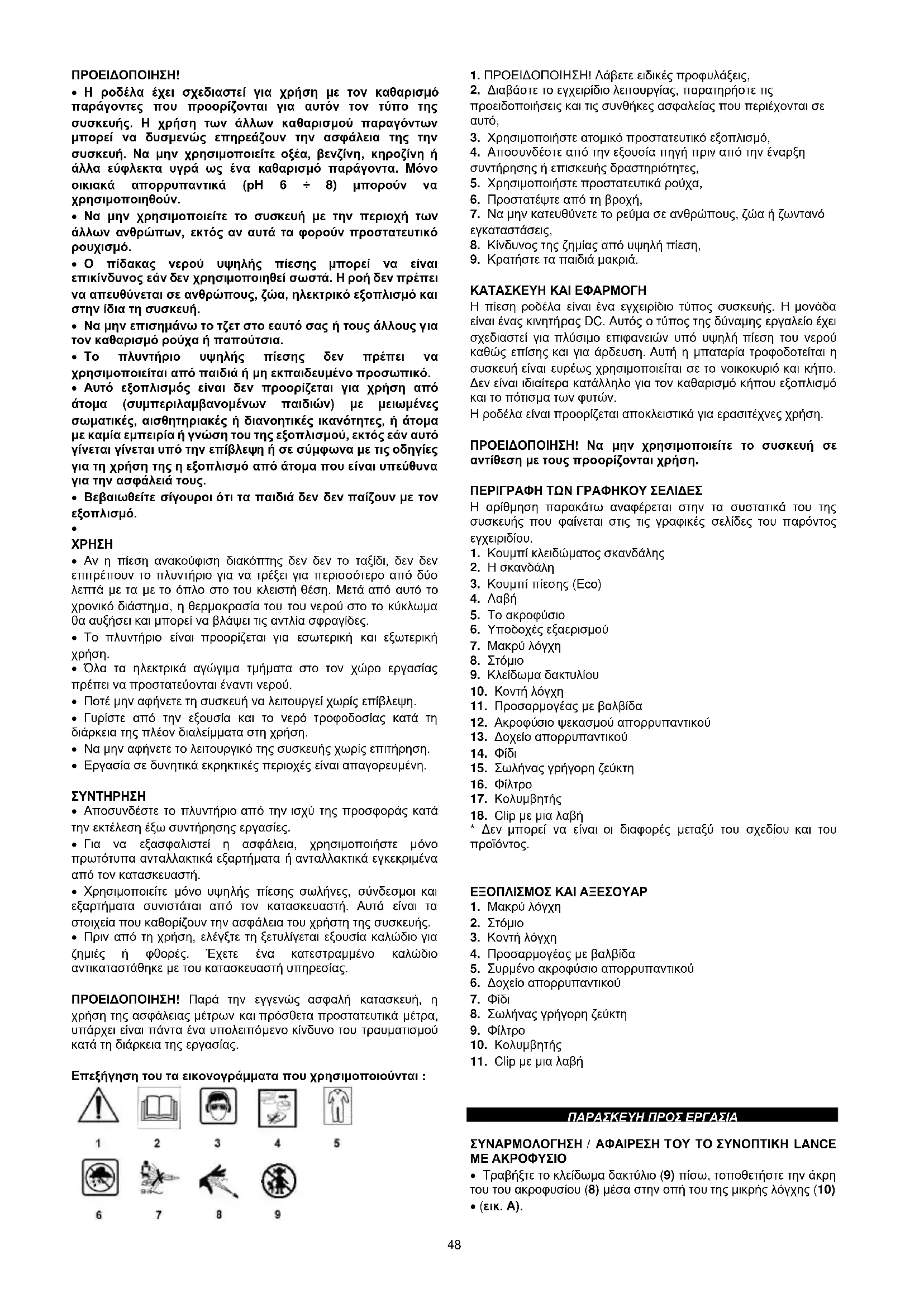 ΜΕΤΑΦΡΑΣΗ ΤΟΥ ΤΟ ΑΡΧΙΚΟ ΕΓΧΕΙΡΙΔΙΟ ΕΠΑΝΑΦΟΡΤΙΖΟΜΕΝΗ ΠΙΕΣΗ CLEANER 58G083 ΠΡΟΣΟΧΗ: ΠΡΙΝ ΧΡΗΣΙΜΟΠΟΙΗΣΕΤΕ ΤΗ ΣΥΣΚΕΥΗ, ΔΙΑΒΑΣΤΕ ΠΡΟΣΕΚΤΙΚΑ ΤΟ ΕΓΧΕΙΡΙΔΙΟ ΚΑΙ ΚΡΑΤΗΣΤΕ ΑΥΤΟ ΤΟ ΕΓΧΕΙΡΙΔΙΟ ΓΙΑ ΠΕΡΑΙΤΕΡΩ ΑΝΑΦΟΡΑ. ΛΕΠΤΟΜΕΡΗΣ ΚΑΝΟΝΙΣΜΟΣ ΑΣΦΑΛΕΙΑΣ ΟΡΟΙ ΑΣΦΑΛΕΙΑΣ ΓΙΑ ΠΛΥΝΤΗΡΙΟ ΠΙΕΣΗΣ ΠΡΟΕΙΔΟΠΟΙΗΣΗ! Τηρείτε τους κανονισμούς ασφαλείας κατά τη χρήση της συσκευής. Για σας τη δική ασφαλείας και ότι από τρίτα μέρη, παρακαλούμε διαβάστε αυτό το εγχειρίδιο πριν από την έναρξη εργασιών. Παρακαλείστε να σώσει αυτό το εγχειρίδιο για μελλοντική αναφορά.48 ΠΡΟΕΙΔΟΠΟΙΗΣΗ!