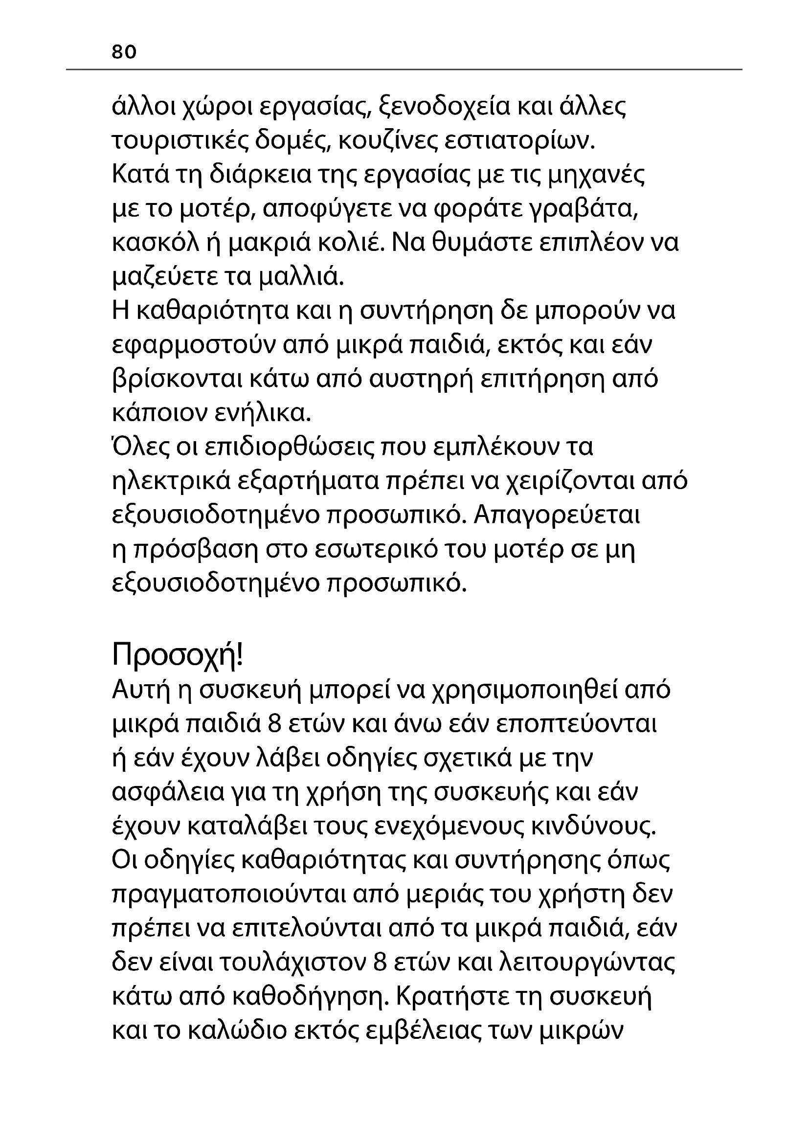 Έχει μελετηθεί η χρήση του προϊόντος σε οικιακό περιβάλλον ή στο εσωτερικό χώρων εργασίας, όπως: Χώροι κουζίνας σε μαγαζιά, γραφεία και80 άλλοι χώροι εργασίας, ξενοδοχεία και άλλες τουριστικές δομές, κουζίνες εστιατορίων. Κατά τη διάρκεια της εργασίας με τις μηχανές με το μοτέρ, αποφύγετε να φοράτε γραβάτα, κασκόλ ή μακριά κολιέ. Να θυμάστε επιπλέον να μαζεύετε τα μαλλιά. Η καθαριότητα και η συντήρηση δε μπορούν να εφαρμοστούν από μικρά παιδιά, εκτός και εάν βρίσκονται κάτω από αυστηρή επιτήρηση από κάποιον ενήλικα. Όλες οι επιδιορθώσεις που εμπλέκουν τα ηλεκτρικά εξαρτήματα πρέπει να χειρίζονται από εξουσιοδοτημένο προσωπικό. Απαγορεύεται η πρόσβαση στο εσωτερικό του μοτέρ σε μη εξουσιοδοτημένο προσωπικό.