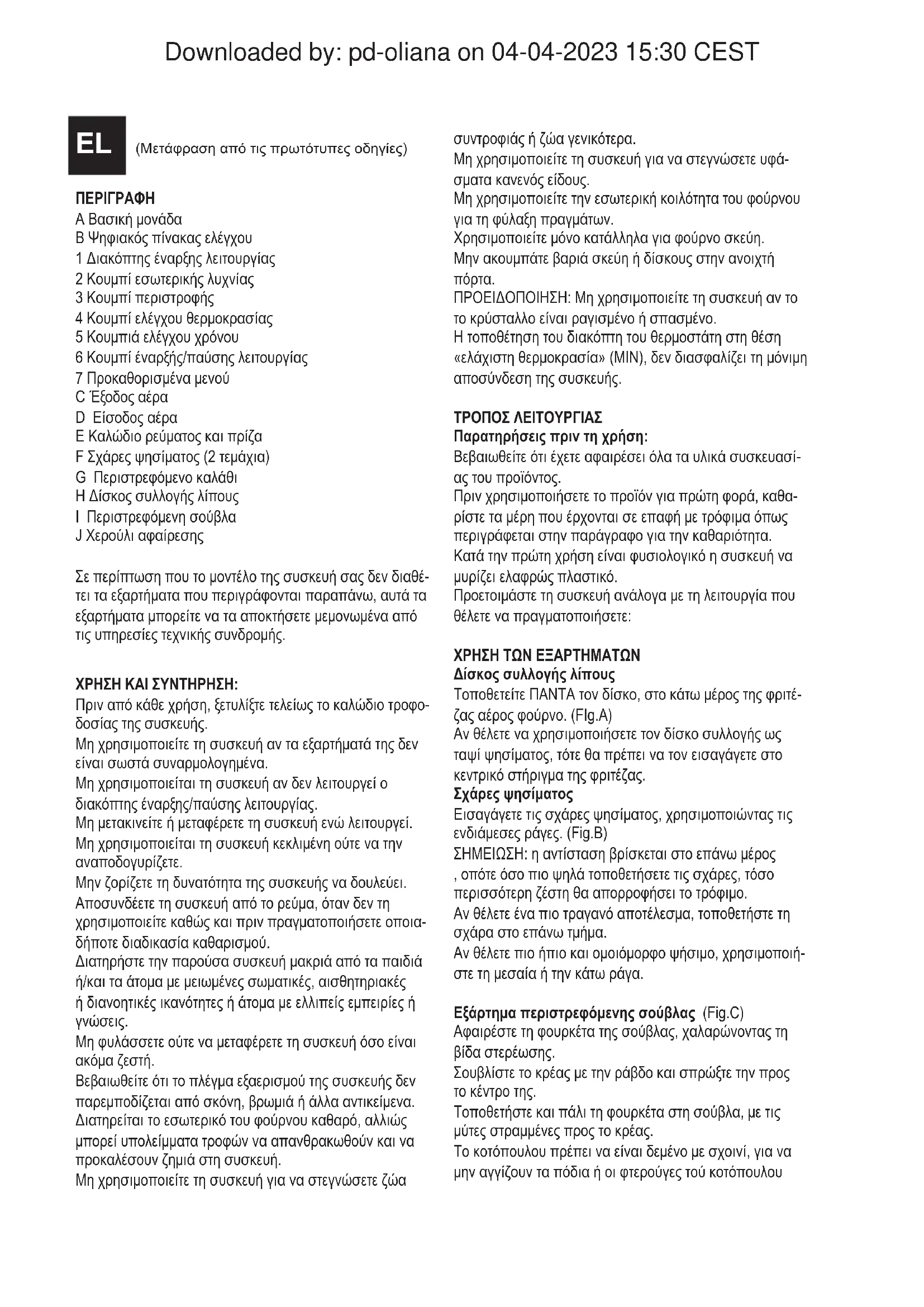 ΠΡΟΕΙΔΟΠΟΙΗΣΗ: Μη χρησιμοποιείτε τη συσκευή αν το το κρύσταλλο είναι ραγισμένο ή σπασμένο. Η τοποθέτηση του διακόπτη του θερμοστάτη στη θέση «ελάχιστη θερμοκρασία» (MIN), δεν διασφαλίζει τη μόνιμη αποσύνδεση της συσκευής. ΤΡΌΠΌΣ ΛΕΙΤΌΥΡΓΙΑΣ Παρατηρήσεις πριν τη χρήση: Βεβαιωθείτε ότι έχετε αφαιρέσει όλα τα υλικά συσκευασί- ας του προϊόντος. Πριν χρησιμοποιήσετε το προϊόν για πρώτη φορά, καθα- ρίστε τα μέρη που έρχονται σε επαφή με τρόφιμα όπως περιγράφεται στην παράγραφο για την καθαριότητα. Κατά την πρώτη χρήση είναι φυσιολογικό η συσκευή να μυρίζει ελαφρώς πλαστικό. Προετοιμάστε τη συσκευή ανάλογα με τη λειτουργία που θέλετε να πραγματοποιήσετε: ΧΡΉΣΉ ΤΩΝ ΕΞΑΡΤΉΜΑΤΩΝ Δίσκος συλλογής λίπους Τοποθετείτε ΠΑΝΤΑ τον δίσκο, στο κάτω μέρος της φριτέ- ζας αέρος φούρνο. (FIg.A) Αν θέλετε να χρησιμοποιήσετε τον δίσκο συλλογής ως ταψί ψησίματος, τότε θα πρέπει να τον εισαγάγετε στο κεντρικό στήριγμα της φριτέζας. Σχάρες ψησίματος Εισαγάγετε τις σχάρες ψησίματος, χρησιμοποιώντας τις ενδιάμεσες ράγες. (Fig.B) ΣΗΜΕΙΩΣΗ: η αντίσταση βρίσκεται στο επάνω μέρος , οπότε όσο πιο ψηλά τοποθετήσετε τις σχάρες, τόσο περισσότερη ζέστη θα απορροφήσει το τρόφιμο. Αν θέλετε ένα πιο τραγανό αποτέλεσμα, τοποθετήστε τη σχάρα στο επάνω τμήμα. Αν θέλετε πιο ήπιο και ομοιόμορφο ψήσιμο, χρησιμοποιή- στε τη μεσαία ή την κάτω ράγα. Εξάρτημα περιστρεφόμενης σούβλας (Fig.C) Αφαιρέστε τη φουρκέτα της σούβλας, χαλαρώνοντας τη βίδα στερέωσης. Σουβλίστε το κρέας με την ράβδο και σπρώξτε την προς το κέντρο της. Τοποθετήστε και πάλι τη φουρκέτα στη σούβλα, με τις μύτες στραμμένες προς το κρέας. Το κοτόπουλου πρέπει να είναι δεμένο με σχοινί, για να μην αγγίζουν τα πόδια ή οι φτερούγες τού κοτόπουλου EL (Μετάφραση από τις πρωτότυπες οδηγίες) Downloaded by: pd-oliana on 04-04-2023 15:30 CESTτις αντιστάσεις θερμότητας, κατά το ψήσιμο, και για να μπορεί να γυρίζει σωστά. Γλιστρήστε και τις δύο φουρκέτες να μπουν σίγουρα μέσα στο κρέας και σφίξτε τις βίδες στήριξής τους. Τοποθετήστε την ράβδο με το κρέας στον φούρνο. Ενεργοποιήστε το κουμπί περιστροφής (3) για να μαγει- ρευτεί ομοιόμορφα το τρόφιμο. Μετά το ψήσιμο, χαλαρώστε τις βίδες στήριξης των φουρκετών και βγάλτε το κρέας, γλιστρώντας το προς την άκρη της σούβλας. Περιστρεφόμενο καλάθι Το περιστρεφόμενο καλάθι μπορεί να χρησιμοποιείται για να τηγανίσετε πατάτες (450g κατεψυγμένες, 400g κα- νονικές ή φούρνου), λαχανικά, κρέας, κροκέτες, nuggets, ψαροκροκέτες , μεταξύ άλλων κατεψυγμένων προϊόντων. ΣΗΜΕΙΩΣΗ: για να επιτύχετε ομοιόμορφο ψήσιμο, ΜΗ ΓΕΜΙΖΕΤΕ υπερβολικά το καλάθι. Βεβαιωθείτε ότι το καλάθι έχει κλείσει καλά, προτού αρχίσετε τη διαδικασία ψησίματος. Για να τοποθετήσετε το καλάθι στη συσκευή, πρώτα βάλτε την αριστερή άκρη (Σχ. D) του καλαθιού και στη συνέχεια κουμπώστε τη δεξιά άκρη στη θέση της (Σχ. E). Ενεργοποιήστε το κουμπί της περιστροφής (3)
