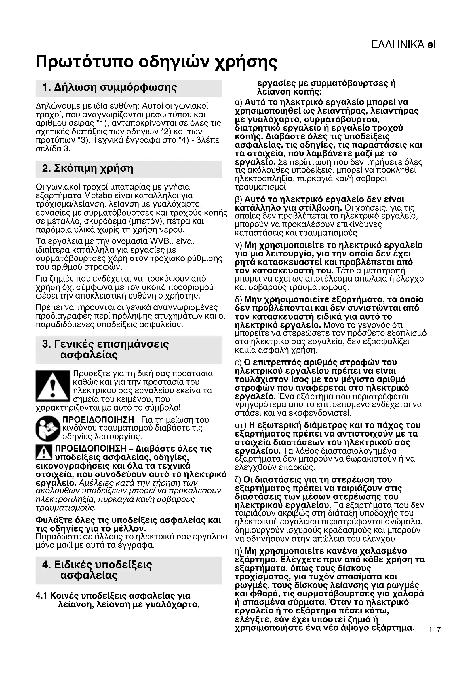 Πρωτότυπο οδηγιών χρήσης Δηλώνουμε με ιδία ευθύνη: Αυτοί οι γωνιακοί τροχοί, που αναγνωρίζονται μέσω τύπου και αριθμού σειράς *1), ανταποκρίνονται σε όλες τις σχετικές διατάξεις των οδηγιών *2) και των προτύπων *3). Τεχνικά έγγραφα στο *4) - βλέπε σελίδα 3. Οι γωνιακοί τροχοί μπαταρίας με γνήσια εξαρτήματα Metabo είναι κατάλληλοι για τρόχισμα/λείανση, λείανση με γυαλόχαρτο, εργασίες με συρματόβουρτσες και τροχούς κοπής σε μέταλλο, σκυρόδεμα (μπετόν), πέτρα και παρόμοια υλικά χωρίς τη χρήση νερού. Τα εργαλεία με την ονομασία WVB.. είναι ιδιαίτερα κατάλληλα για εργασίες με συρματόβουρτσες χάρη στον τροχίσκο ρύθμισης του αριθμού στροφών. Για ζημιές που ενδέχεται να προκύψουν από χρήση όχι σύμφωνα με τον σκοπό προορισμού φέρει την αποκλειστική ευθύνη ο χρήστης. Πρέπει να τηρούνται οι γενικά αναγνωρισμένες προδιαγραφές περί πρόληψης ατυχημάτων και οι παραδιδόμενες υποδείξεις ασφαλείας. Προσέξτε για τη δική σας προστασία, καθώς και για την προστασία του ηλεκτρικού σας εργαλείου εκείνα τα σημεία του κειμένου, που χαρακτηρίζονται με αυτό το σύμβολο! ΠΡΟΕΙΔΟΠΟΙΗΣΗ - Για τη μείωση του κινδύνου τραυματισμού διαβάστε τις οδηγίες λειτουργίας. ΠΡΟΕΙΔΟΠΟΙΗΣΗ – Διαβάστε όλες τις υποδείξεις ασφαλείας, οδηγίες, εικονογραφήσεις και όλα τα τεχνικά στοιχεία, που συνοδεύουν αυτό το ηλεκτρικό εργαλείο. Αμέλειες κατά την τήρηση των ακόλουθων υποδείξεων μπορεί να προκαλέσουν ηλεκτροπληξία, πυρκαγιά και/ή σοβαρούς τραυματισμούς. Φυλάξτε όλες τις υποδείξεις ασφαλείας και τις οδηγίες για το μέλλον. Παραδώστε σε άλλους το ηλεκτρικό σας εργαλείο μόνο μαζί με αυτά τα έγγραφα.