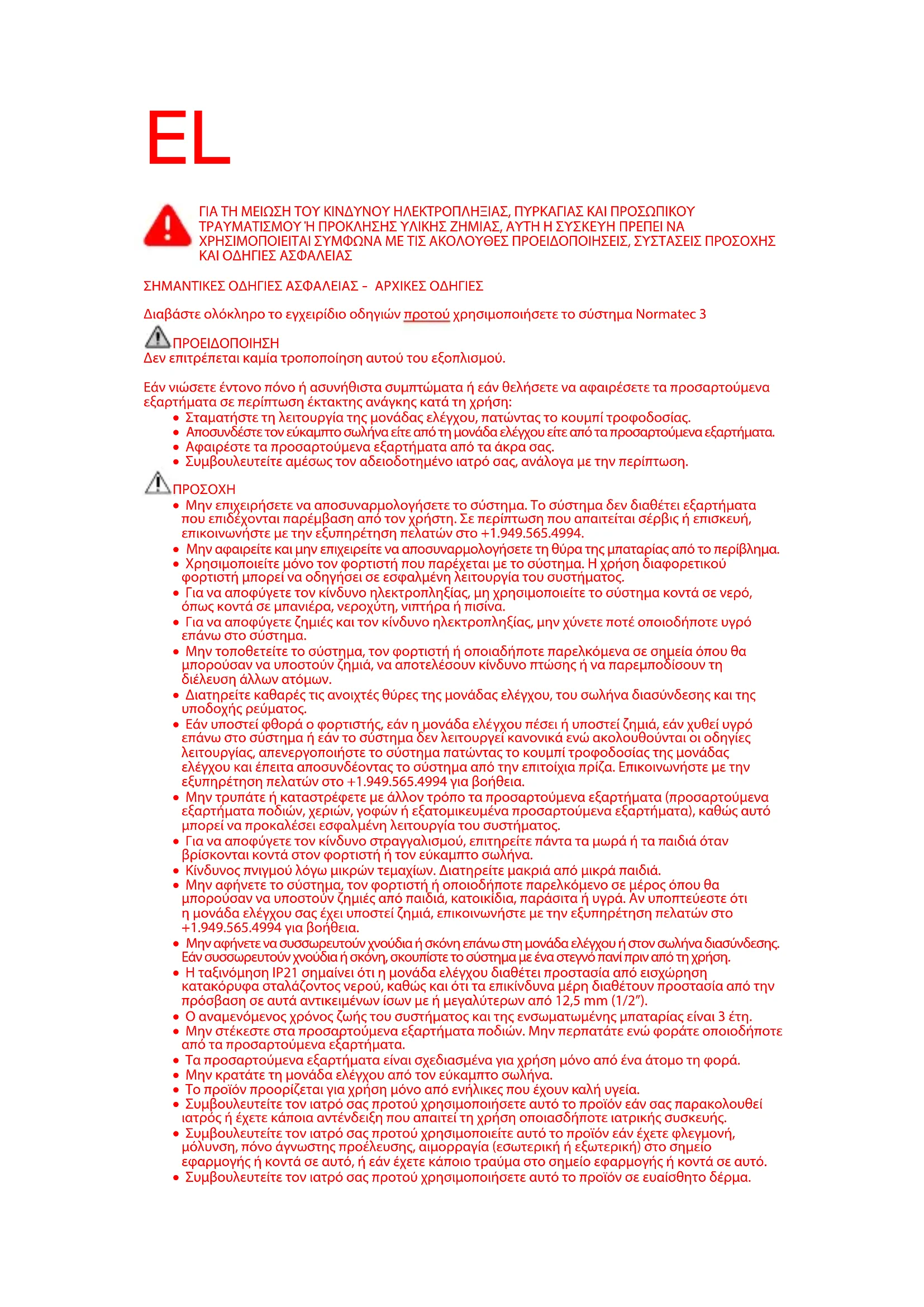 Στη μονάδα ελέγχου ΕΝΔΕΙΞΕΙΣ ΧΡΗΣΗΣΕΝΔΕΙΞΕΙΣ ΧΡΗΣΗΣ Το Normatec 3 είναι μια συσκευή μαλάξεων με πίεση αέρα που προορίζεται για την προσωρινή ανακούφιση από μικρές μυϊκές ενοχλήσεις ή/και πόνους και την προσωρινή αύξηση της κυκλοφορίας στην περιοχή όπου εφαρμόζεται η θεραπεία. ΚΙΝΔΥΝΟΙ ΚΑΙ ΟΦΕΛΗ ΤΟΥ ΣΥΣΤΗΜΑΤΟΣ NORMATEC 3 Οι κίνδυνοι και τα οφέλη της χρήσης του συστήματος Normatec 3 είναι παρόμοια με εκείνα του μασάζ. Εάν οι μαλάξεις του Normatec 3 σάς προκαλούν δυσάρεστη αίσθηση, μπορείτε να μειώσετε την ένταση ή να διακόψετε τη συνεδρία. Τα οφέλη περιλαμβάνουν την προσωρινή ανακούφιση από μικρές μυϊκές ενοχλήσεις, καθώς και την αυξημένη κυκλοφορία στην περιοχή που υποβάλλεται σε θεραπεία. Εάν έχετε ερωτήσεις, καλέστε την εξυπηρέτηση πελατών στο +1.949.565.4994.1. Κουμπί τροφοδοσίας