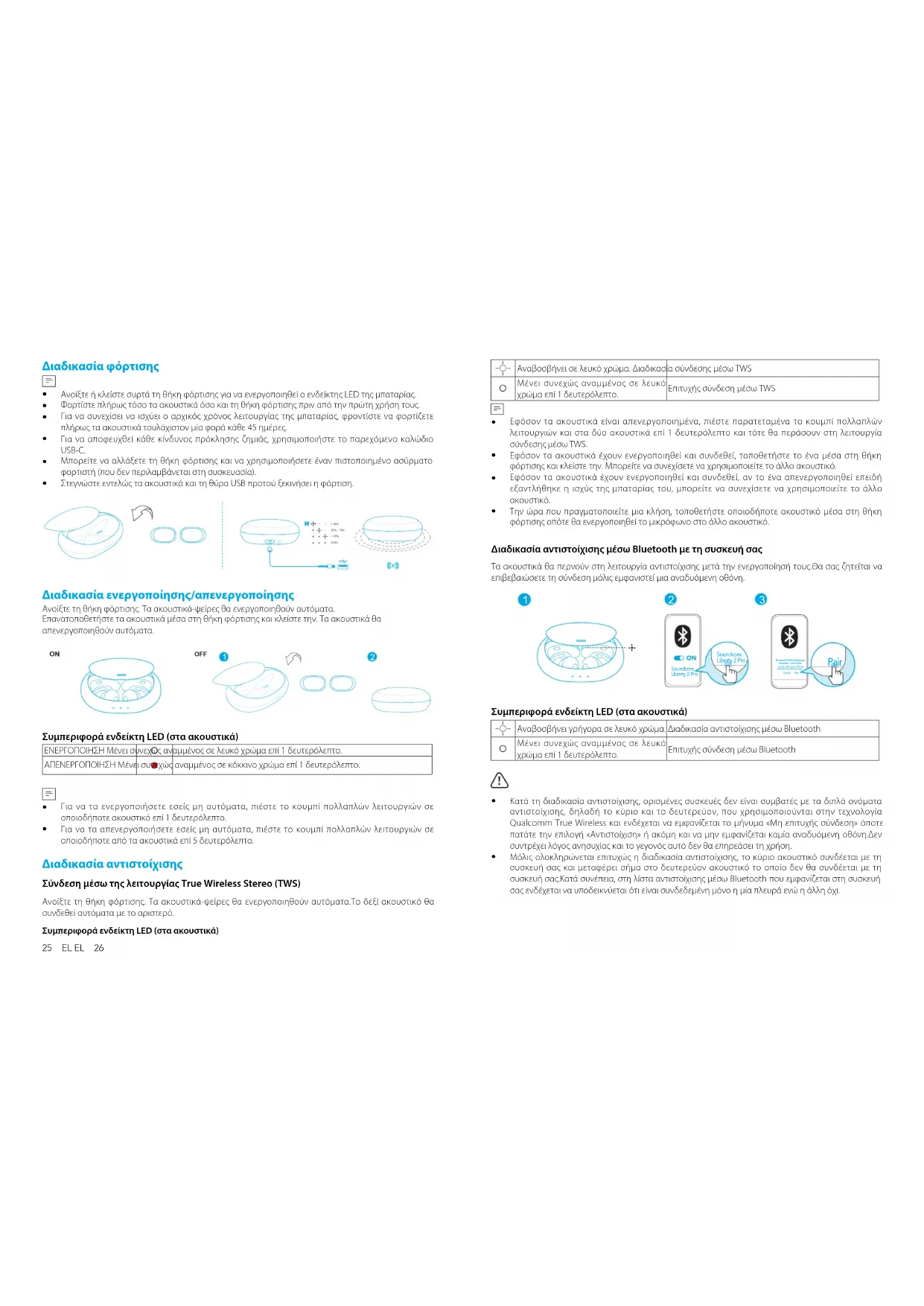 Για να τα απενεργοποιήσετε εσείς μη αυτόματα, πιέστε το κουμπί πολλαπλών λειτουργιών σε οποιοδήποτε από τα ακουστικά επί 5 δευτερόλεπτα. Διαδικασία αντιστοίχισης Σύνδεση μέσω της λειτουργίας True Wireless Stereo (TWS) Ανοίξτε τη θήκη φόρτισης. Τα ακουστικά-ψείρες θα ενεργοποιηθούν αυτόματα.Το δεξί ακουστικό θα συνδεθεί αυτόματα με το αριστερό. Συμπεριφορά ενδείκτη LED (στα ακουστικά) Αναβοσβήνει σε λευκό χρώμα. Διαδικασία σύνδεσης μέσω TWS Μένει συνεχώς αναμμένος σε λευκό χρώμα επί 1 δευτερόλεπτο. Επιτυχής σύνδεση μέσω TWS