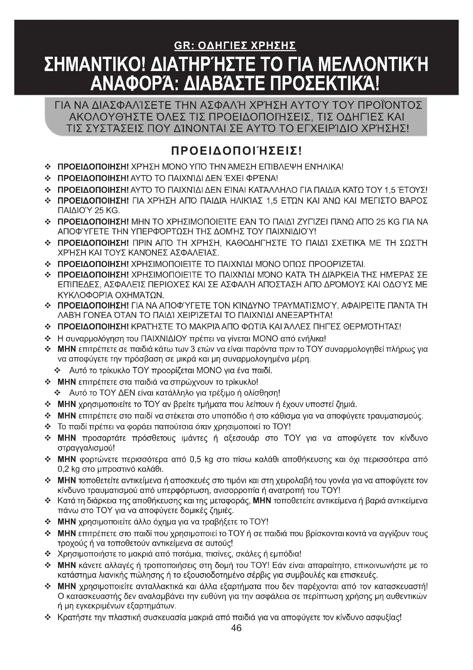 - Kontrolloni periodikisht gjendjen e secilës pjesë. - Mos e zhytni lodrën në ujë. Pastroni me një leckë të butë të lagur me ujë ose me pastrues të lëngshëm neutral. - Mos e pastroni me produkte që përmbajnë gërryes, amoniak, zbardhues ose alkool. - Lubrifikoni rregullisht mekanizmat lëvizës. - Shmangni përdorimin në sipërfaqe me rërë. - Mos e ruani lodrën në vende të nxehta ose pranë burimeve të nxehtësisë për të shmangur deformimin. - Ruajeni në një vend të pastër dhe të thatë, larg diellit direkt, shiut, lagështisë dhe ndryshimeve të papritura të temperaturës. - Gjithmonë thajeni plotësisht para se ta ruani, për të shmangur mykun nëse është e lagur. - Për probleme gjatë përdorimit normal, kontaktoni një qendër shërbimi të autorizuar. 45ΓΙΑ ΝΑ ΔΙΑΣΦΑΛΊΣΕΤΕ ΤΗΝ ΑΣΦΑΛΉ ΧΡΉΣΗ ΑΥΤΟΎ ΤΟΥ ΠΡΟΪΌΝΤΟΣ ΑΚΟΛΟΥΘΉΣΤΕ ΌΛΕΣ ΤΙΣ ΠΡΟΕΙΔΟΠΟΙΉΣΕΙΣ, ΤΙΣ ΟΔΗΓΊΕΣ ΚΑΙ ΤΙΣ ΣΥΣΤΆΣΕΙΣ ΠΟΥ ΔΊΝΟΝΤΑΙ ΣΕ ΑΥΤΌ ΤΟ ΕΓΧΕΙΡΊΔΙΟ ΧΡΉΣΗΣ! GR: ΟΔΗΓΙΕΣ ΧΡΗΣΗΣ ΣΗΜΑΝΤΙΚΟ! ΔΙΑΤΗΡΉΣΤΕ ΤΟ ΓΙΑ ΜΕΛΛΟΝΤΙΚΉ ΑΝΑΦΟΡΆ: ΔΙΑΒΆΣΤΕ ΠΡΟΣΕΚΤΙΚΆ! ΠΡΟΕΙΔΟΠΟΙΉΣΕΙΣ! ΠΡΟΕΙΔΟΠΟΙΗΣΗ! ΧΡΉΣΗ ΜΌΝΟ ΥΠΌ ΤΗΝ ΆΜΕΣΗ ΕΠΊΒΛΕΨΗ ΕΝΉΛΙΚΑ! ΠΡΟΕΙΔΟΠΟΙΗΣΗ! ΑΥΤΌ ΤΟ ΠΑΙΧΝΊΔΙ ΔΕΝ ΈΧΕΙ ΦΡΈΝΑ! ΠΡΟΕΙΔΟΠΟΙΗΣΗ! ΑΥΤΌ ΤΟ ΠΑΙΧΝΊΔΙ ΔΕΝ ΕΊΝΑΙ ΚΑΤΆΛΛΗΛΟ ΓΙΑ ΠΑΙΔΙΆ ΚΆΤΩ ΤΟΥ 1,5 ΈΤΟΥΣ! ΠΡΟΕΙΔΟΠΟΙΗΣΗ! ΓΙΑ ΧΡΉΣΗ ΑΠΌ ΠΑΙΔΙΆ ΗΛΙΚΊΑΣ 1,5 ΕΤΏΝ ΚΑΙ ΆΝΩ ΚΑΙ ΜΈΓΙΣΤΟ ΒΆΡΟΣ ΠΑΙΔΙΟΎ 25 KG. ΠΡΟΕΙΔΟΠΟΙΗΣΗ! ΜΗΝ ΤΟ ΧΡΗΣΙΜΟΠΟΙΕΊΤΕ ΕΆΝ ΤΟ ΠΑΙΔΊ ΖΥΓΊΖΕΙ ΠΆΝΩ ΑΠΌ 25 KG ΓΙΑ ΝΑ ΑΠΟΦΎΓΕΤΕ ΤΗΝ ΥΠΕΡΦΌΡΤΩΣΗ ΤΗΣ ΔΟΜΉΣ ΤΟΥ ΠΑΙΧΝΙΔΙΟΎ! ΠΡΟΕΙΔΟΠΟΙΗΣΗ! ΠΡΙΝ ΑΠΌ ΤΗ ΧΡΉΣΗ, ΚΑΘΟΔΗΓΉΣΤΕ ΤΟ ΠΑΙΔΊ ΣΧΕΤΙΚΆ ΜΕ ΤΗ ΣΩΣΤΉ ΧΡΉΣΗ ΚΑΙ ΤΟΥΣ ΚΑΝΌΝΕΣ ΑΣΦΑΛΕΊΑΣ. ΠΡΟΕΙΔΟΠΟΙΗΣΗ! ΧΡΗΣΙΜΟΠΟΙΕΊΤΕ ΤΟ ΠΑΙΧΝΊΔΙ ΜΌΝΟ ΌΠΩΣ ΠΡΟΟΡΊΖΕΤΑΙ. ΠΡΟΕΙΔΟΠΟΙΗΣΗ! ΧΡΗΣΙΜΟΠΟΙΕΊΤΕ ΤΟ ΠΑΙΧΝΊΔΙ ΜΌΝΟ ΚΑΤΆ ΤΗ ΔΙΆΡΚΕΙΑ ΤΗΣ ΗΜΈΡΑΣ ΣΕ ΕΠΊΠΕΔΕΣ, ΑΣΦΑΛΕΊΣ ΠΕΡΙΟΧΈΣ ΚΑΙ ΣΕ ΑΣΦΑΛΉ ΑΠΌΣΤΑΣΗ ΑΠΌ ΔΡΌΜΟΥΣ ΚΑΙ ΟΔΟΎΣ ΜΕ ΚΥΚΛΟΦΟΡΊΑ ΟΧΗΜΆΤΩΝ. ΠΡΟΕΙΔΟΠΟΙΗΣΗ! ΓΙΑ ΝΑ ΑΠΟΦΎΓΕΤΕ ΤΟΝ ΚΊΝΔΥΝΟ ΤΡΑΥΜΑΤΙΣΜΟΎ, ΑΦΑΙΡΕΊΤΕ ΠΆΝΤΑ ΤΗ ΛΑΒΉ ΓΟΝΈΑ ΌΤΑΝ ΤΟ ΠΑΙΔΊ ΧΕΙΡΊΖΕΤΑΙ ΤΟ ΠΑΙΧΝΊΔΙ ΑΝΕΞΆΡΤΗΤΑ! ΠΡΟΕΙΔΟΠΟΙΗΣΗ! ΚΡΑΤΉΣΤΕ ΤΟ ΜΑΚΡΙΆ ΑΠΌ ΦΩΤΙΆ ΚΑΙ ΆΛΛΕΣ ΠΗΓΈΣ ΘΕΡΜΌΤΗΤΑΣ! Η συναρμολόγηση του ΠΑΙΧΝΙΔΙΟΥ πρέπει να γίνεται ΜΟΝΟ από ενήλικα! ΜΗΝ επιτρέπετε σε παιδιά κάτω των 3 ετών να είναι παρόντα πριν το TOY συναρμολογηθεί πλήρως για να αποφύγετε την πρόσβαση σε μικρά και μη συναρμολογημένα μέρη. Αυτό το τρίκυκλο TOY προορίζεται ΜΟΝΟ για ένα παιδί. ΜΗΝ επιτρέπετε στα παιδιά να σπρώχνουν το τρίκυκλο! Αυτό το TOY ΔΕΝ είναι κατάλληλο για τρέξιμο ή ολίσθηση! ΜΗΝ χρησιμοποιείτε το TOY αν βρείτε τμήματα που λείπουν ή έχουν υποστεί ζημιά. ΜΗΝ επιτρέπετε στο παιδί να στέκεται στο υποπόδιο ή στο κάθισμα για να αποφύγετε τραυματισμούς. Το παιδί πρέπει να φοράει παπούτσια όταν χρησιμοποιεί το TOY! ΜΗΝ προσαρτάτε πρόσθετους ιμάντες ή αξεσουάρ στο TOY για να αποφύγετε τον κίνδυνο στραγγαλισμού! ΜΗΝ φορτώνετε περισσότερα από 0,5 kg στο πίσω καλάθι αποθήκευσης και όχι περισσότερα από 0,2 kg στο μπροστινό καλάθι. ΜΗΝ τοποθετείτε αντικείμενα ή αποσκευές στο τιμόνι και στη χειρολαβή του γονέα για να αποφύγετε τον κίνδυνο τραυματισμού από υπερφόρτωση, ανισορροπία ή ανατροπή του TOY! Κατά τη διάρκεια της αποθήκευσης και της μεταφοράς, ΜΗΝ τοποθετείτε αντικείμενα ή βαριά αντικείμενα πάνω στο TOY για να αποφύγετε δομικές ζημιές. ΜΗΝ χρησιμοποιείτε άλλο όχημα για να τραβήξετε το TOY! ΜΗΝ επιτρέπετε στο παιδί που χρησιμοποιεί το TOY ή σε παιδιά που βρίσκονται κοντά να αγγίζουν τους τροχούς ή να τοποθετούν αντικείμενα σε αυτούς! Χρησιμοποιήστε το μακριά από ποτάμια, πισίνες, σκάλες ή εμπόδια! ΜΗΝ κάνετε αλλαγές ή τροποποιήσεις στη δομή του TOY! Εάν είναι απαραίτητο, επικοινωνήστε με το κατάστημα λιανικής πώλησης ή το εξουσιοδοτημένο σέρβις για συμβουλές και επισκευές. ΜΗΝ χρησιμοποιείτε α