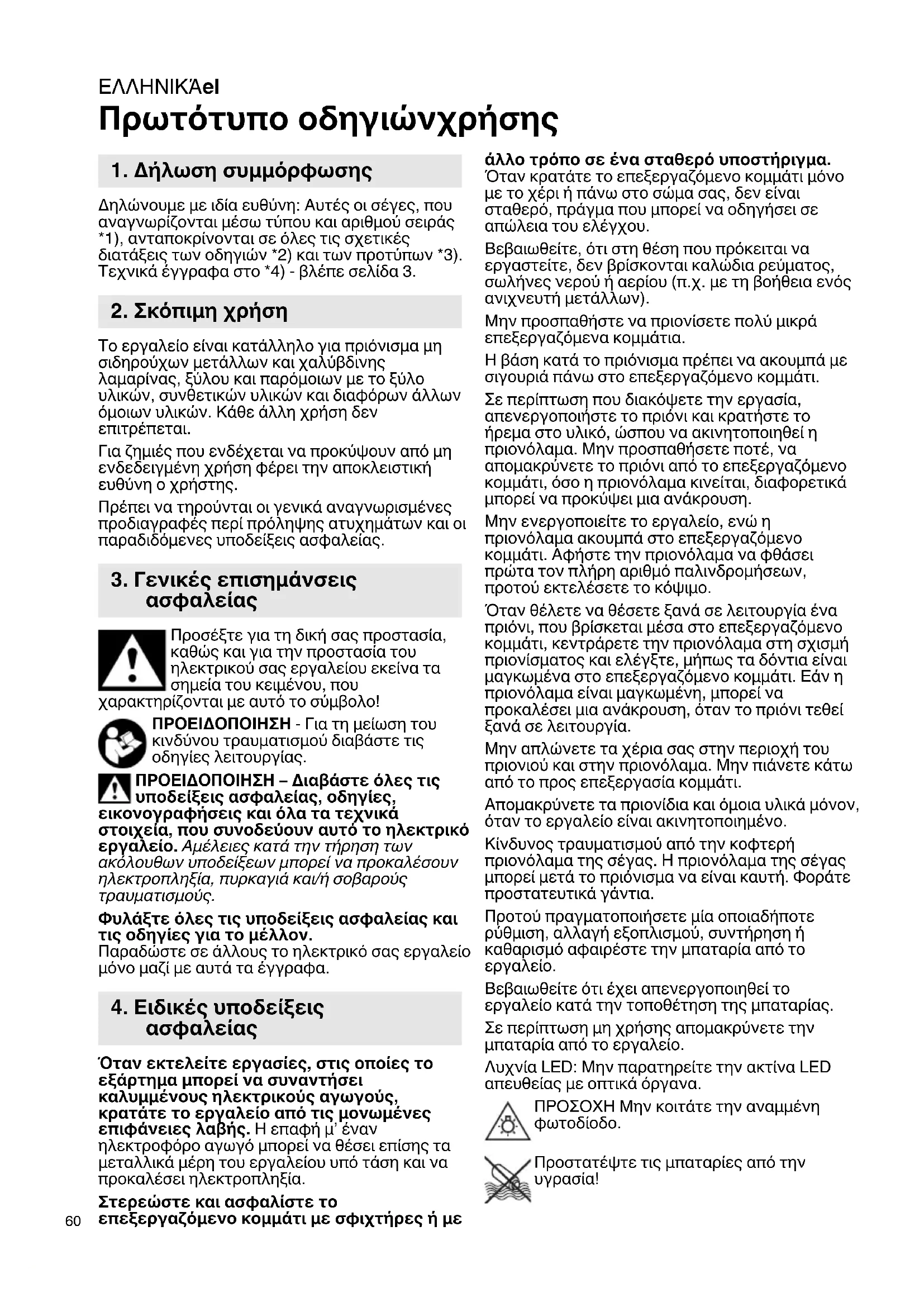 Πρωτότυπο οδηγιώνχρήσης Δηλώνουμε με ιδία ευθύνη: Αυτές οι σέγες, που αναγνωρίζονται μέσω τύπου και αριθμού σειράς *1), ανταποκρίνονται σε όλες τις σχετικές διατάξεις των οδηγιών *2) και των προτύπων *3). Τεχνικά έγγραφα στο *4) - βλέπε σελίδα 3. Το εργαλείο είναι κατάλληλο για πριόνισμα μη σιδηρούχων μετάλλων και χαλύβδινης λαμαρίνας, ξύλου και παρόμοιων με το ξύλο υλικών, συνθετικών υλικών και διαφόρων άλλων όμοιων υλικών. Κάθε άλλη χρήση δεν επιτρέπεται. Για ζημιές που ενδέχεται να προκύψουν από μη ενδεδειγμένη χρήση φέρει την αποκλειστική ευθύνη ο χρήστης. Πρέπει να τηρούνται οι γενικά αναγνωρισμένες προδιαγραφές περί πρόληψης ατυχημάτων και οι παραδιδόμενες υποδείξεις ασφαλείας. Προσέξτε για τη δική σας προστασία, καθώς και για την προστασία του ηλεκτρικού σας εργαλείου εκείνα τα σημεία του κειμένου, που χαρακτηρίζονται με αυτό το σύμβολο! ΠΡΟΕΙΔΟΠΟΙΗΣΗ - Για τη μείωση του κινδύνου τραυματισμού διαβάστε τις οδηγίες λειτουργίας. ΠΡΟΕΙΔΟΠΟΙΗΣΗ – Διαβάστε όλες τις υποδείξεις ασφαλείας, οδηγίες, εικονογραφήσεις και όλα τα τεχνικά στοιχεία, που συνοδεύουν αυτό το ηλεκτρικό εργαλείο. Αμέλειες κατά την τήρηση των ακόλουθων υποδείξεων μπορεί να προκαλέσουν ηλεκτροπληξία, πυρκαγιά και/ή σοβαρούς τραυματισμούς. Φυλάξτε όλες τις υποδείξεις ασφαλείας και τις οδηγίες για το μέλλον. Παραδώστε σε άλλους το ηλεκτρικό σας εργαλείο μόνο μαζί με αυτά τα έγγραφα. Όταν εκτελείτε εργασίες, στις οποίες το εξάρτημα μπορεί να συναντήσει καλυμμένους ηλεκτρικούς αγωγούς, κρατάτε το εργαλείο από τις μονωμένες επιφάνειες λαβής. Η επαφή μ’ έναν ηλεκτροφόρο αγωγό μπορεί να θέσει επίσης τα μεταλλικά μέρη του εργαλείου υπό τάση και να προκαλέσει ηλεκτροπληξία. Στερεώστε και ασφαλίστε το επεξεργαζόμενο κομμάτι με σφιχτήρες ή με άλλο τρόπο σε ένα σταθερό υποστήριγμα. Όταν κρατάτε το επεξεργαζόμενο κομμάτι μόνο με το χέρι ή πάνω στο σώμα σας, δεν είναι σταθερό, πράγμα που μπορεί να οδηγήσει σε απώλεια του ελέγχου. Βεβαιωθείτε, ότι στη θέση που πρόκειται να εργαστείτε, δεν βρίσκονται καλώδια ρεύματος, σωλήνες νερού ή αερίου (π.χ. με τη βοήθεια ενός ανιχνευτή μετάλλων). Μην προσπαθήστε να πριονίσετε πολύ μικρά επεξεργαζόμενα κομμάτια. Η βάση κατά το πριόνισμα πρέπει να ακουμπά με σιγουριά πάνω στο επεξεργαζόμενο κομμάτι. Σε περίπτωση που διακόψετε την εργασία, απενεργοποιήστε το πριόνι και κρατήστε το ήρεμα στο υλικό, ώσπου να ακινητοποιηθεί η πριονόλαμα. Μην προσπαθήσετε ποτέ, να απομακρύνετε το πριόνι από το επεξεργαζόμενο κομμάτι, όσο η πριονόλαμα κινείται, διαφορετικά μπορεί να προκύψει μια ανάκρουση. Μην ενεργοποιείτε το εργαλείο, ενώ η πριονόλαμα ακουμπά στο επεξεργαζόμενο κομμάτι. Αφήστε την πριονόλαμα να φθάσει πρώτα τον πλήρη αριθμό παλινδρομήσεων, προτού εκτελέσετε το κόψιμο. Όταν θέλετε να θέσετε ξανά σε λειτουργία ένα πριόνι, που βρίσκεται μέσα στο επεξεργαζόμενο κομμάτι, κεντράρετε την πριονόλαμα στη σχισμή πριονίσματος και ελέγξτε, μήπως τα δόντια είναι μαγκωμένα στο επεξεργαζόμενο κομμάτι. Εάν η πριονόλαμα είναι μαγκωμένη, μπορεί να προκαλέσει μια ανάκρουση, όταν το πριόνι τεθεί ξανά σε λειτουργία. Μην απλώνετε τα χέρια σας στην περιοχή του πριονιού και στην πριονόλαμα. Μην πιάνετε κάτω από το προς επεξεργασία κομμάτι. Απομακρύνετε τα πριονίδια και όμοια υλικά μόνον, όταν το εργαλείο είναι ακινητοποιημένο. Κίνδυνος τραυματισμού από τη