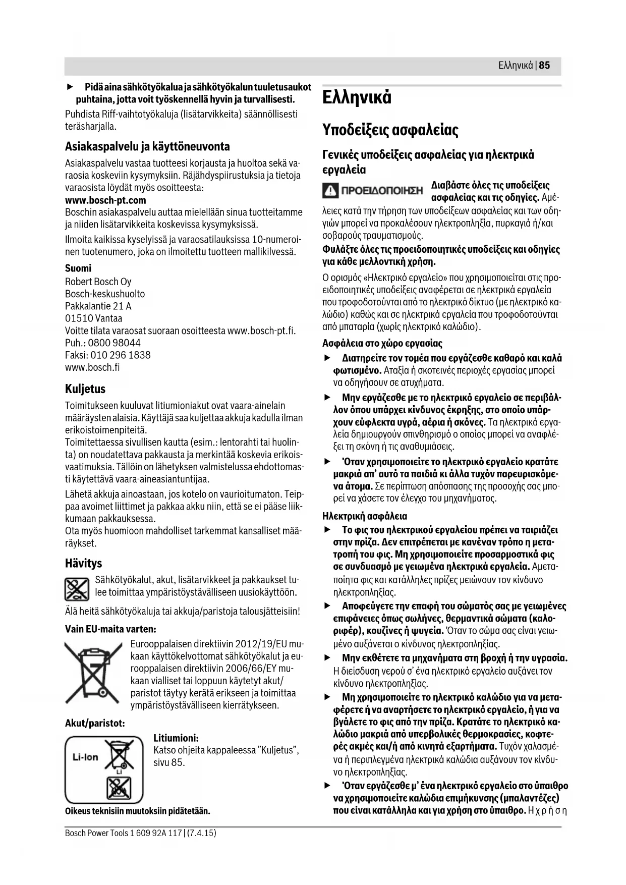 Χρησιμοποιείτε στα ηλεκτρικά εργαλεία μόνο μπαταρίες που προορίζονται γι’ αυτά. Η χρήση άλλων μπαταριών μπο- ρεί να οδηγήσει σε τραυματισμούς και να δημιουργήσει κίν- δυνο πυρκαγιάς. Κρατάτε τις μπαταρίες που δε χρησιμοποιείτε μακριά από συνδετήρες χαρτιών, νομίσματα, κλειδιά, καρφιά, βίδες κι άλλα μικρά μεταλλικά αντικείμενα που μπορούν να βραχυκυκλώσουν τις επαφές της μπαταρίας. Ένα βραχυκύκλωμα των επαφών της μπαταρίας μπορεί να προκα- λέσει τραυματισμούς ή φωτιά. Μια τυχόν εσφαλμένη χρήση μπορεί να οδηγήσει σε δι- αρροή υγρών από την μπαταρία. Αποφεύγετε κάθε επα- φή μ’ αυτά. Σε περίπτωση τυχαίας επαφής ξεπλύνετε κα- λά με νερό. Σε περίπτωση που τα υγρά θα έρθουν σε επα- φή με τα μάτια, πρέπει να ζητήσετε επίσης και ιατρική βοήθεια. Διαρρέοντα υγρά μπαταρίας μπορεί να οδηγήσουν σε ερεθισμούς του δέρματος ή σε εγκαύματα. OBJ_BUCH-1808-002.book Page 86 Tuesday, April 7, 2015 4:33 PMΕλληνικά | 87 Bosch Power Tools 1 609 92A 117 | (7.4.15) Service Δώστε το ηλεκτρικό εργαλείο σας για επισκευή από άρι- στα εκπαιδευμένο προσωπικό και με γνήσια ανταλλακτι- κά. Έτσι εξασφαλίζετε τη διατήρηση της ασφάλειας του μη-