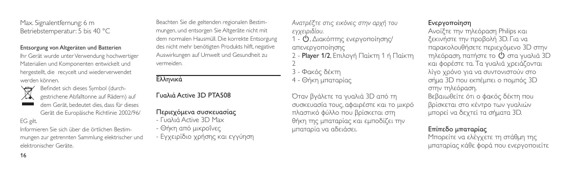 • Les parents doivent surveiller leurs enfants pendant le visionnage en 3D et s’assurer qu’ils ne présentent aucun des symptômes mentionnés ci-dessus. La 3D n’est pas recommandée pour les enfants de moins de 6 ans, leur système visuel n’étant pas complètement développé. • N’utilisez pas les lunettes 3D autrement que pour regarder la télévision en 3D. Spécifications Système 3D : lunettes Active 3D Type de batterie : CR2032 Système de transmission : IR (infrarouge) Distance maximale du signal : 6 m Le symbole de la poubelle barrée sur un produit indique que ce dernier est conforme à la directive européenne 2002/96/CE. Veuillez vous renseigner sur votre système local de gestion des déchets d’équipements électriques et électroniques. Veillez à respecter la réglementation en vigueur et ne mettez pas vos anciens produits au rebut avec vos déchets ménagers. La mise au rebut citoyenne