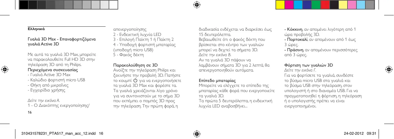 - Funda de microfibra - Manual Vea la ilustración A. 1 - A interruptor de encendido/apagado 2 - Indicador LED Nivel de la batería Puede comprobar el nivel de la batería al encender las gafas de 3D. Durante los primeros 5 segundos el indicador LED parpadea . . . - Rojo: si queda menos de una hora de visualización 3D - Naranja: quedan entre una y tres horas - Verde: quedan más de tres horas. Este producto ha sido diseñado y fabricado con materiales y componentes de alta calidad que se pueden reciclar y volver a utilizar. Cuando aparece este símbolo de cubo de basura tachado en un producto, significa que cumple la Directiva europea 2002/96/ EC. Infórmese acerca del sistema de reciclaje de productos eléctricos y electrónicos de su localidad.