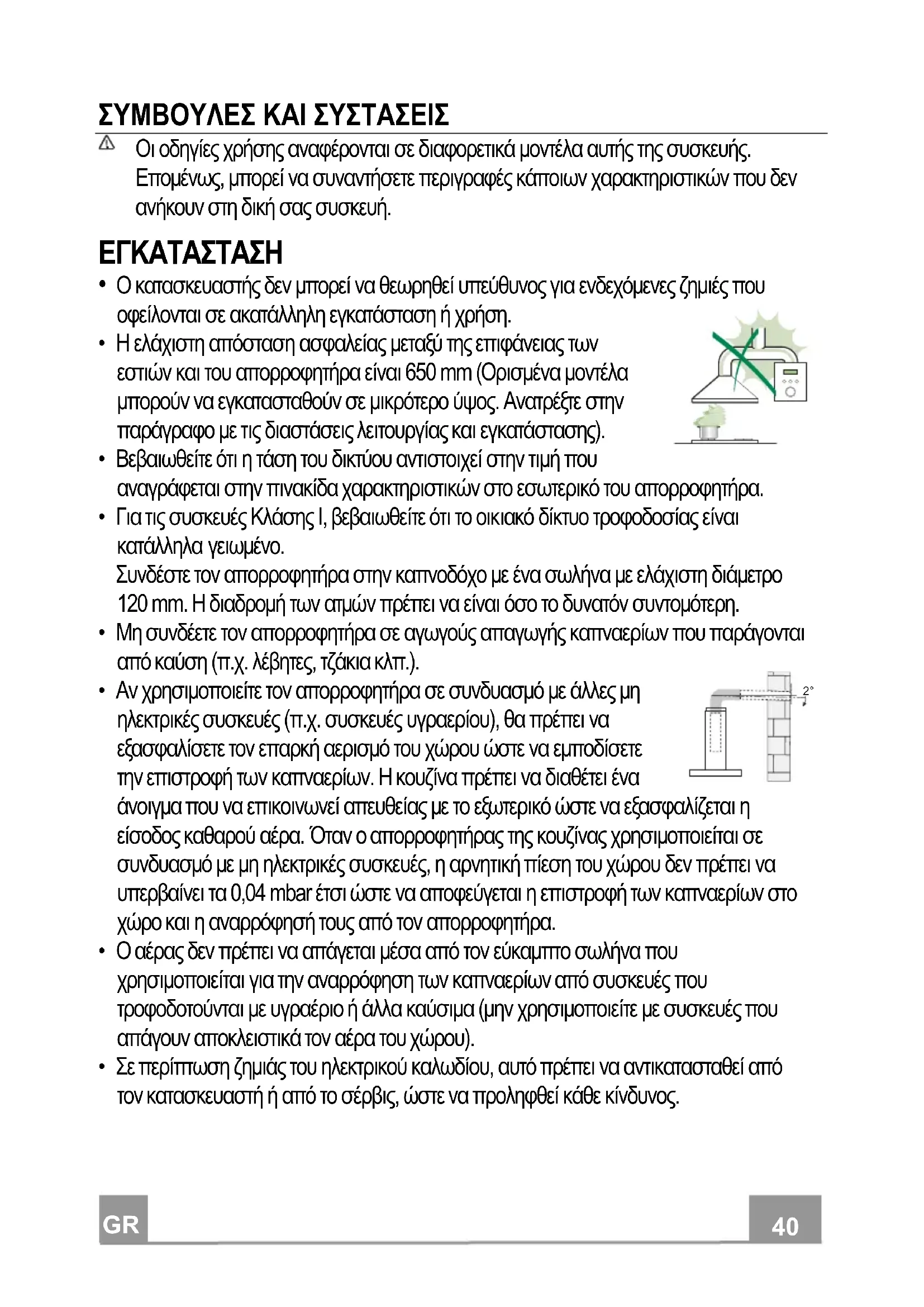• Για τις συσκευές Κλάσης Ι, βεβαιωθείτε ότι το οικιακό δίκτυο τροφοδοσίας είναι κατάλληλα γειωμένο. Συνδέστε τον απορροφητήρα στην καπνοδόχο με ένα σωλήνα με ελάχιστη διάμετρο 120 mm. Η διαδρομή των ατμών πρέπει να είναι όσο το δυνατόν συντομότερη.