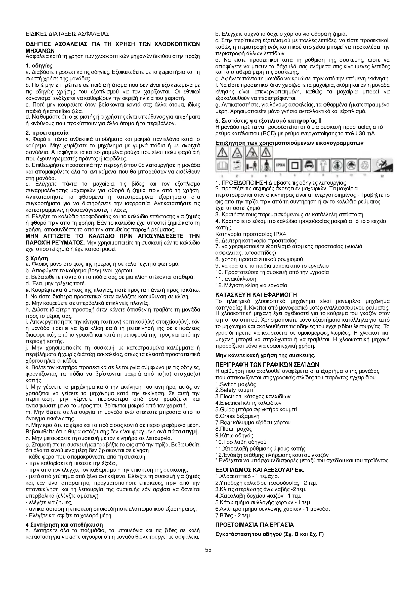 a. Διαβάστε προσεκτικά τις οδηγίες. Εξοικειωθείτε με τα χειριστήρια και τη σωστή χρήση της μονάδας. b. Ποτέ μην επιτρέπετε σε παιδιά ή άτομα που δεν είναι εξοικειωμένα με τις οδηγίες χρήσης του εξοπλισμού να τον χειρίζονται. Οι εθνικοί κανονισμοί ενδέχεται να καθορίζουν την ακριβή ηλικία του χειριστή. c. Ποτέ μην κουρεύετε όταν βρίσκονται κοντά σας άλλα άτομα, ιδίως παιδιά ή κατοικίδια ζώα. d. Να θυμάστε ότι ο χειριστής ή ο χρήστης είναι υπεύθυνος για ατυχήματα ή κινδύνους που προκύπτουν για άλλα άτομα ή το περιβάλλον.