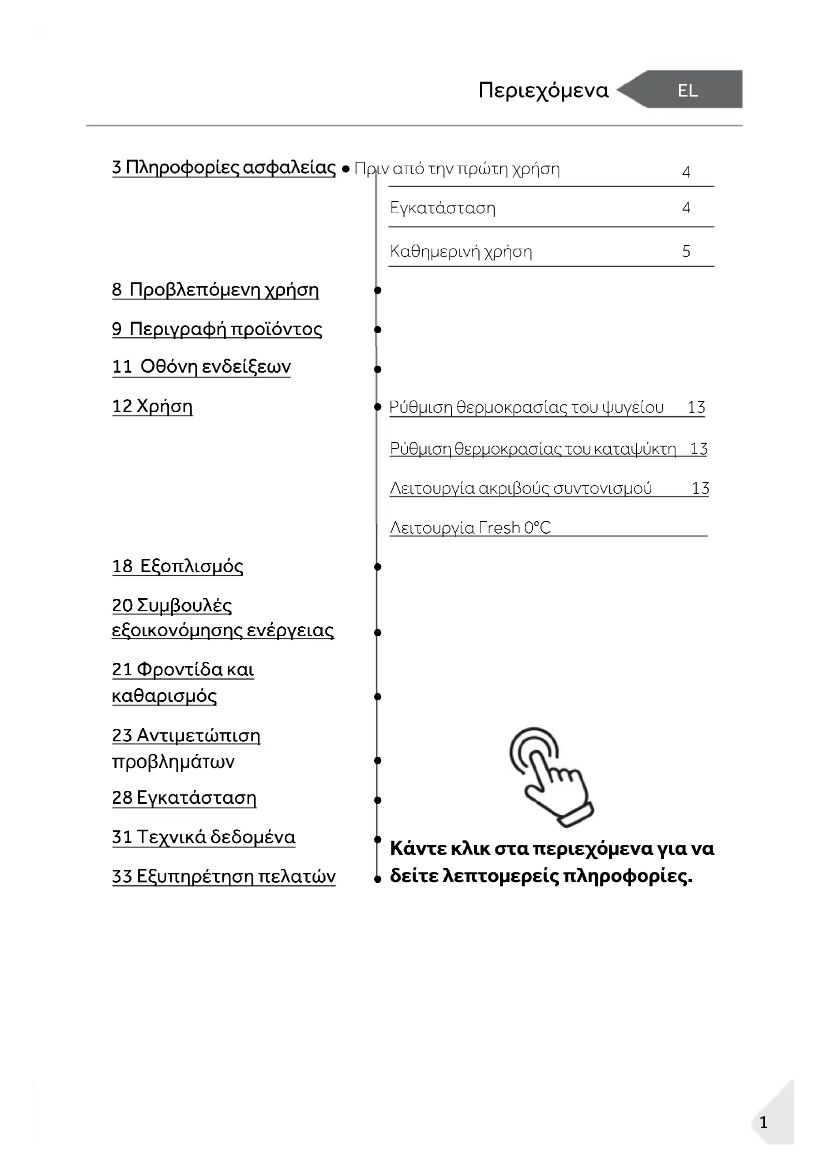 Κάντε κλικ στα περιεχόμενα για να δείτε λεπτομερείς πληροφορίες. 18 Εξοπλισμός 20 Συμβουλές εξοικονόμησης ενέργειας
