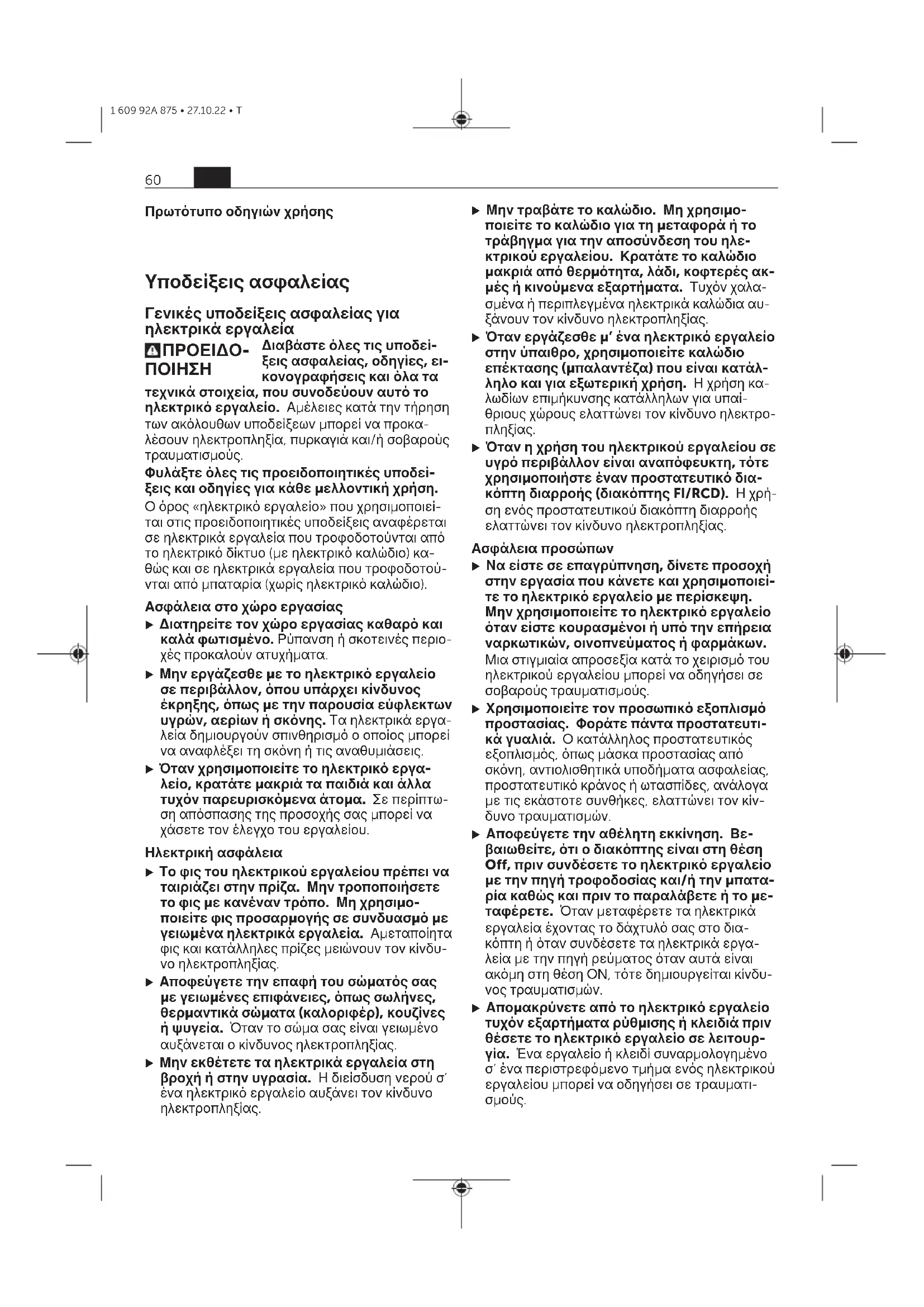 Διαβάστε όλες τις υποδεί- ξεις ασφαλείας, οδηγίες, ει- κονογραφήσεις και όλα τα τεχνικά στοιχεία, που συνοδεύουν αυτό το ηλεκτρικό εργαλείο. Αμέλειες κατά την τήρηση των ακόλουθων υποδείξεων μπορεί να προκα- λέσουν ηλεκτροπληξία, πυρκαγιά και/ή σοβαρούς τραυματισμούς. Φυλάξτε όλες τις προειδοποιητικές υποδεί- ξεις και οδηγίες για κάθε μελλοντική χρήση. Ο όρος «ηλεκτρικό εργαλείο» που χρησιμοποιεί- ται στις προειδοποιητικές υποδείξεις αναφέρεται σε ηλεκτρικά εργαλεία που τροφοδοτούνται από το ηλεκτρικό δίκτυο (με ηλεκτρικό καλώδιο) κα- θώς και σε ηλεκτρικά εργαλεία που τροφοδοτού- νται από μπαταρία (χωρίς ηλεκτρικό καλώδιο). Ασφάλεια στο χώρο εργασίαςΕλληνικά u Διατηρείτε τον χώρο εργασίας καθαρό και καλά φωτισμένο. Ρύπανση ή σκοτεινές περιο- χές προκαλούν ατυχήματα. u Μην εργάζεσθε με το ηλεκτρικό εργαλείο σε περιβάλλον, όπου υπάρχει κίνδυνος έκρηξης, όπως με την παρουσία εύφλεκτων υγρών, αερίων ή σκόνης. Τα ηλεκτρικά εργα- λεία δημιουργούν σπινθηρισμό ο οποίος μπορεί να αναφλέξει τη σκόνη ή τις αναθυμιάσεις. u Όταν χρησιμοποιείτε το ηλεκτρικό εργα- λείο, κρατάτε μακριά τα παιδιά και άλλα τυχόν παρευρισκόμενα άτομα. Σε περίπτω- ση απόσπασης της προσοχής σας μπορεί να χάσετε τον έλεγχο του εργαλείου. Ηλεκτρική ασφάλειαΕλληνικά u Το φις του ηλεκτρικού εργαλείου πρέπει να ταιριάζει στην πρίζα. Μην τροποποιήσετε το φις με κανέναν τρόπο. Μη χρησιμο- ποιείτε φις προσαρμογής σε συνδυασμό με γειωμένα ηλεκτρικά εργαλεία. Αμεταποίητα φις και κατάλληλες πρίζες μειώνουν τον κίνδυ- νο ηλεκτροπληξίας. u Αποφεύγετε την επαφή του σώματός σας με γειωμένες επιφάνειες, όπως σωλήνες, θερμαντικά σώματα (καλοριφέρ), κουζίνες ή ψυγεία. Όταν το σώμα σας είναι γειωμένο αυξάνεται ο κίνδυνος ηλεκτροπληξίας. u Μην εκθέτετε τα ηλεκτρικά εργαλεία στη βροχή ή στην υγρασία. Η διείσδυση νερού σ’ ένα ηλεκτρικό εργαλείο αυξάνει τον κίνδυνο ηλεκτροπληξίας. u Μην τραβάτε το καλώδιο. Μη χρησιμο- ποιείτε το καλώδιο για τη μεταφορά ή το τράβηγμα για την αποσύνδεση του ηλε- κτρικού εργαλείου. Κρατάτε το καλώδιο μακριά από θερμότητα, λάδι, κοφτερές ακ- μές ή κινούμενα εξαρτήματα. Τυχόν χαλα- σμένα ή περιπλεγμένα ηλεκτρικά καλώδια αυ- ξάνουν τον κίνδυνο ηλεκτροπληξίας. u Όταν εργάζεσθε μ’ ένα ηλεκτρικό εργαλείο στην ύπαιθρο, χρησιμοποιείτε καλώδιο επέκτασης (μπαλαντέζα) που είναι κατάλ- ληλο και για εξωτερική χρήση. Ηχρήση κα- λωδίων επιμήκυνσης κατάλληλων για υπαί- θριους χώρους ελαττώνει τον κίνδυνο ηλεκτρο-