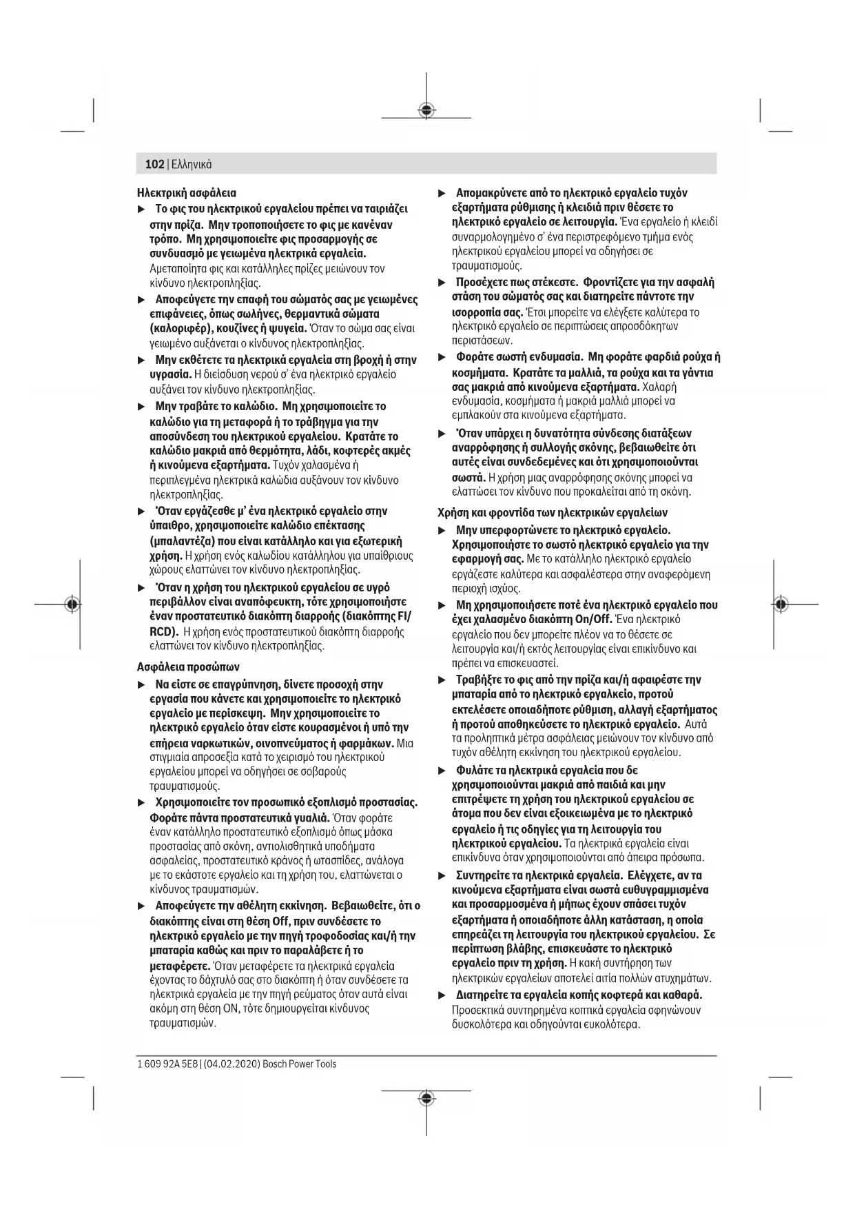 u Μην εργάζεστε με το ηλεκτρικό εργαλείο σε περιβάλλον, όπου υπάρχει κίνδυνος έκρηξης, όπως με την παρουσία εύφλεκτων υγρών, αερίων ή σκόνης. Τα ηλεκτρικά εργαλεία δημιουργούν σπινθηρισμό ο οποίος μπορεί να αναφλέξει τη σκόνη ή τις αναθυμιάσεις. u Όταν χρησιμοποιείτε το ηλεκτρικό εργαλείο, κρατάτε μακριά τα παιδιά και άλλα τυχόν παρευρισκόμενα άτομα. Σε περίπτωση απόσπασης της προσοχής σας μπορεί να χάσετε τον έλεγχο του εργαλείου. Bosch Power Tools 1 609 92A 5E8 | (04.02.2020)102 | Ελληνικά Ηλεκτρική ασφάλεια u Το φις του ηλεκτρικού εργαλείου πρέπει να ταιριάζει στην πρίζα. Μην τροποποιήσετε το φις με κανέναν τρόπο. Μη χρησιμοποιείτε φις προσαρμογής σε συνδυασμό με γειωμένα ηλεκτρικά εργαλεία. Αμεταποίητα φις και κατάλληλες πρίζες μειώνουν τον κίνδυνο ηλεκτροπληξίας. u Αποφεύγετε την επαφή του σώματός σας με γειωμένες επιφάνειες, όπως σωλήνες, θερμαντικά σώματα (καλοριφέρ), κουζίνες ή ψυγεία. Όταν το σώμα σας είναι γειωμένο αυξάνεται ο κίνδυνος ηλεκτροπληξίας. u Μην εκθέτετε τα ηλεκτρικά εργαλεία στη βροχή ή στην υγρασία. Η διείσδυση νερού σ’ ένα ηλεκτρικό εργαλείο αυξάνει τον κίνδυνο ηλεκτροπληξίας. u Μην τραβάτε το καλώδιο. Μη χρησιμοποιείτε το καλώδιο για τη μεταφορά ή το τράβηγμα για την αποσύνδεση του ηλεκτρικού εργαλείου. Κρατάτε το καλώδιο μακριά από θερμότητα, λάδι, κοφτερές ακμές ή κινούμενα εξαρτήματα. Τυχόν χαλασμένα ή περιπλεγμένα ηλεκτρικά καλώδια αυξάνουν τον κίνδυνο ηλεκτροπληξίας. u Όταν εργάζεσθε μ’ ένα ηλεκτρικό εργαλείο στην ύπαιθρο, χρησιμοποιείτε καλώδιο επέκτασης (μπαλαντέζα) που είναι κατάλληλο και για εξωτερική χρήση. Ηχρήση ενός καλωδίου κατάλληλου για υπαίθριους χώρους ελαττώνει τον κίνδυνο ηλεκτροπληξίας. u Όταν η χρήση του ηλεκτρικού εργαλείου σε υγρό περιβάλλον είναι αναπόφευκτη, τότε χρησιμοποιήστε έναν προστατευτικό διακόπτη διαρροής (διακόπτηςFI/ RCD). Ηχρήση ενός προστατευτικού διακόπτη διαρροής ελαττώνει τον κίνδυνο ηλεκτροπληξίας. Ασφάλεια προσώπων u Να είστε σε επαγρύπνηση, δίνετε προσοχή στην εργασία που κάνετε και χρησιμοποιείτε το ηλεκτρικό εργαλείο με περίσκεψη. Μην χρησιμοποιείτε το ηλεκτρικό εργαλείο όταν είστε κουρασμένοι ή υπό την επήρεια ναρκωτικών, οινοπνεύματος ή φαρμάκων. Μια στιγμιαία απροσεξία κατά το χειρισμό του ηλεκτρικού εργαλείου μπορεί να οδηγήσει σε σοβαρούς τραυματισμούς. u Χρησιμοποιείτε τον προσωπικό εξοπλισμό προστασίας. Φοράτε πάντα προστατευτικά γυαλιά. Όταν φοράτε έναν κατάλληλο προστατευτικό εξοπλισμό όπως μάσκα προστασίας από σκόνη, αντιολισθητικά υποδήματα ασφαλείας, προστατευτικό κράνος ή ωτασπίδες, ανάλογα με το εκάστοτε εργαλείο και τη χρήση του, ελαττώνεται ο κίνδυνος τραυματισμών. u Αποφεύγετε την αθέλητη εκκίνηση. Βεβαιωθείτε, ότι ο διακόπτης είναι στη θέση Off, πριν συνδέσετε το ηλεκτρικό εργαλείο με την πηγή τροφοδοσίας και/ή την μπαταρία καθώς και πριν το παραλάβετε ή το μεταφέρετε. Όταν μεταφέρετε τα ηλεκτρικά εργαλεία έχοντας το δάχτυλό σας στο διακόπτη ή όταν συνδέσετε τα ηλεκτρικά εργαλεία με την πηγή ρεύματος όταν αυτά είναι ακόμη στη θέση ΟΝ, τότε δημιουργείται κίνδυνος τραυματισμών. u Απομακρύνετε από το ηλεκτρικό εργαλείο τυχόν εξαρτήματα ρύθμισης ή κλειδιά πριν θέσετε το ηλεκτρικό εργαλείο σε λειτουργία. Ένα εργαλείο ή κλειδί συναρμολογημένο σ’ ένα περιστρεφόμενο τμήμα ενός ηλεκτρικού εργαλείου μπορεί να οδηγήσει σε τραυματισμούς. u Προσέχετε πως 