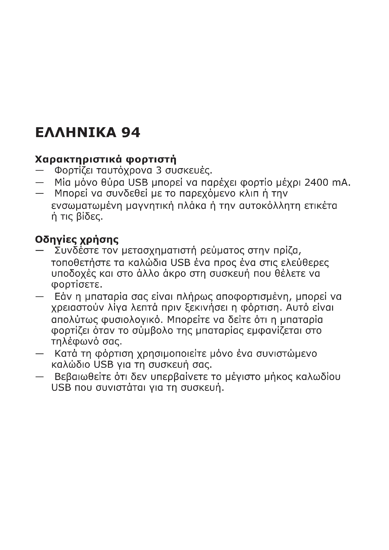 — Εάν η μπαταρία σας είναι πλήρως αποφορτισμένη, μπορεί να χρειαστούν λίγα λεπτά πριν ξεκινήσει η φόρτιση. Αυτό είναι απολύτως φυσιολογικό. Μπορείτε να δείτε ότι η μπαταρία φορτίζει όταν το σύμβολο της μπαταρίας εμφανίζεται στο τηλέφωνό σας. — Κατά τη φόρτιση χρησιμοποιείτε μόνο ένα συνιστώμενο καλώδιο USB για τη συσκευή σας. — Βεβαιωθείτε ότι δεν υπερβαίνετε το μέγιστο μήκος καλωδίου USB που συνιστάται για τη συσκευή.95 Τι πρέπει να γνωρίζετε — Το μήκος και η ποιότητα του καλωδίου USB επηρεάζουν την ταχύτητα φόρτισης και την απόδοση. — Οι συσκευές μπορεί να θερμανθούν κατά τη φόρτιση. Αυτό είναι απολύτως φυσιολογικό και θα κρυώσουν σταδιακά πάλι μόλις φορτιστούν πλήρως. — Ο χρόνος φόρτισης ενδέχεται να διαφέρει ανάλογα με τη χωρητικότητα της μπαταρίας, το επίπεδο φόρτισης, την ηλικία της μπαταρίας και τη θερμοκρασία στη γύρω περιοχή. — Θερμοκρασία αποθήκευσης φορτιστή: -20°C έως 25°C. — Θερμοκρασία λειτουργίας φορτιστή: 0°C έως 40°C. Αποσυνδέστε τον φορτιστή από την πηγή τροφοδοσίας πριν τον καθαρισμό και όταν δε χρησιμοποιείται. Για να καθαρίσετε τον φορτιστή, σκουπίστε με ένα ελαφρά βρεγμένο πανί. Ποτέ μη βυθίζετε τον φορτιστή στο νερό. Συνιστώμενα προληπτικά μέτρα και τεχνικά δεδομένα, δείτε το πίσω μέρος του φορτιστή. Αποθηκεύστε αυτές τις οδηγίες για μελλοντική χρήση.96 ΠΡΟΕΙΔΟΠΟΙΗΣΗ: — Η πρίζα πρέπει να βρίσκεται κοντά στον εξοπλισμό και να είναι εύκολα προσβάσιμη. — Χρησιμοποιείτε μόνο σε μέρη χωρίς υγρασία. — Τα παιδιά θα πρέπει να επιβλέπονται ώστε να εξασφαλίζεται ότι δεν παίζουν με το προϊόν. — Εάν το καλώδιο έχει φθαρεί, η συσκευή πρέπει να καταστραφεί. — Μη χρησιμοποιείτε ποτέ ένα φθαρμένο ή ελαττωματικό καλώδιο USB για τη φόρτιση, καθώς αυτό μπορεί να καταστρέψει τη συσκευή σας. Επισκευή προϊόντος Μην προσπαθήσετε να επισκευάσετε αυτό το προϊόν μόνοι σας, καθώς το άνοιγμα ή η αφαίρεση καλυμμάτων μπορεί να σας εκθέσει σε επικίνδυνα επίπεδα τάσης ή άλλους κινδύνους.97 ΤΕΧΝΙΚΑ ΔΕΔΟΜΕΝΑ Τύπος: E1605 LÖRBY Είσοδος: 24V DC Έξοδος: 5V DC Για εσωτερική χρήση μόνο Μέγιστο συνολικό φορτίο: 3400 mA Μέγιστο φορτίο ανά θύρα USB: 2400 mA Μέγιστο μήκος καλωδίου USB: 1,5 m Κατασκευαστής: IKEA of Sweden AB Διεύθυνση: Ταχ. θυρίδα 702, SE-343 81 Älmhult, ΣΟΥΗΔΙΑ Το σύμβολο με το διαγραμμένο τροχήλατο κάδο υποδεικνύει ότι το προϊόν χρειάζεται ειδική διαχείριση απόρριψης αποβλήτων. Το προϊόν πρέπει να ανακυκλωθεί σύμφωνα με τους τοπικούς περιβαλλοντικούς κανονισμούς. Διαχωρίζοντας ένα προϊόν με αυτό το σύμβολο, συμβάλλετε στη μείωση του όγκου των αποβλήτων που στέλνονται στα αποτεφρωτήρια ή στους χώρους υγειονομικής ταφής και μειώνετε τις αρνητικές συνέπειες στην υγεία και το περιβάλλον. Για περισσότερες πληροφορίες, απευθυνθείτε σε ένα κατάστημα ΙΚΕΑ.РУССКИЙ 98 Характеристики зарядного устройства — Обеспечивает одновременную зарядку 3 устройств. — Один USB-разъем может давать ток нагрузки до 2400 мА. — Можно закрепить с помощью прилагающегося зажима, интегрированного магнита, двустороннего скотча или