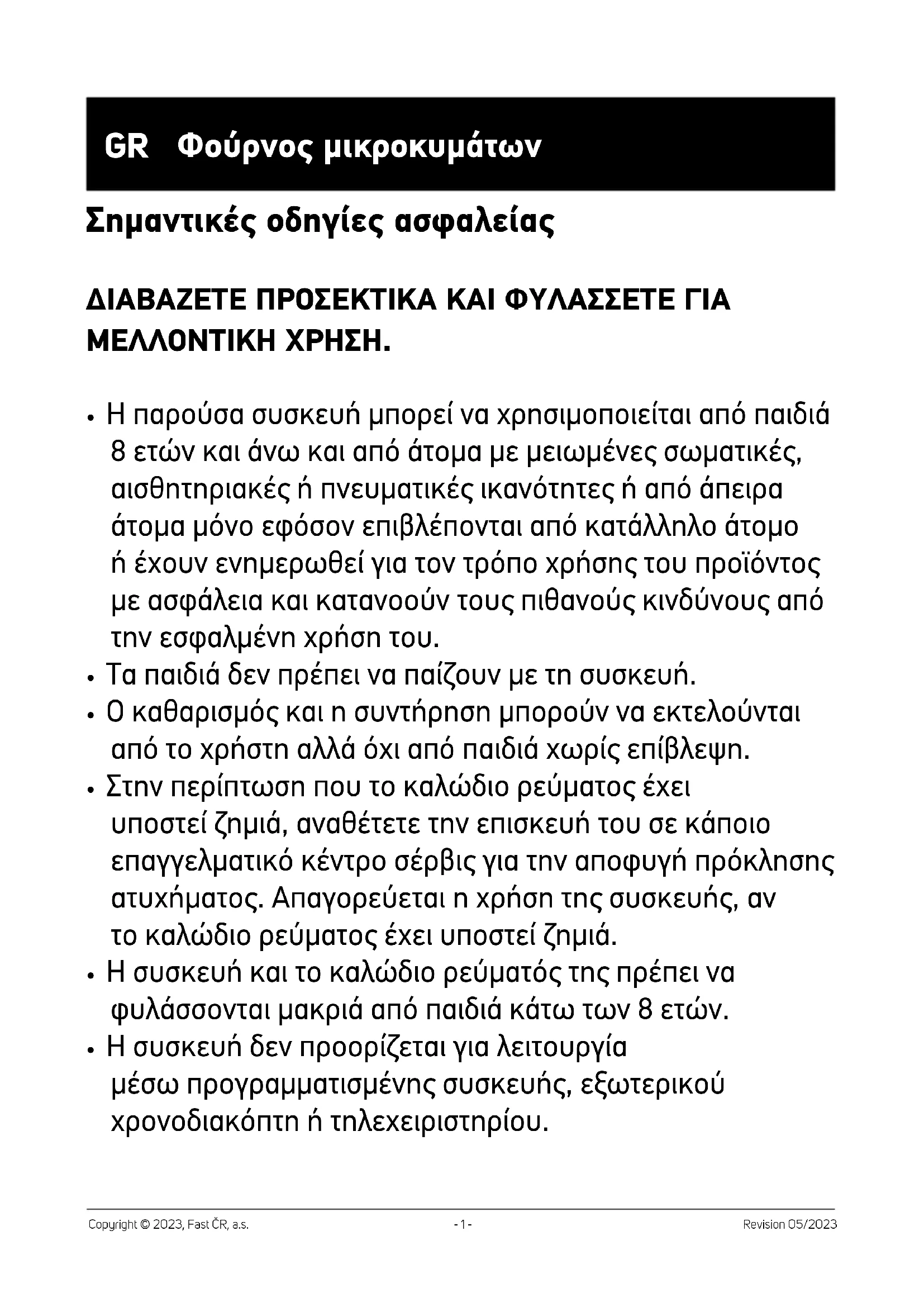 - Η συσκευή δεν προορίζεται για λειτουργία μέσω προγραμματισμένης συσκευής, εξωτερικού χρονοδιακόπτη ή τηλεχειριστηρίου.- 2 - Revision 05/2023 Copyright © 2023, Fast ČR, a.s.