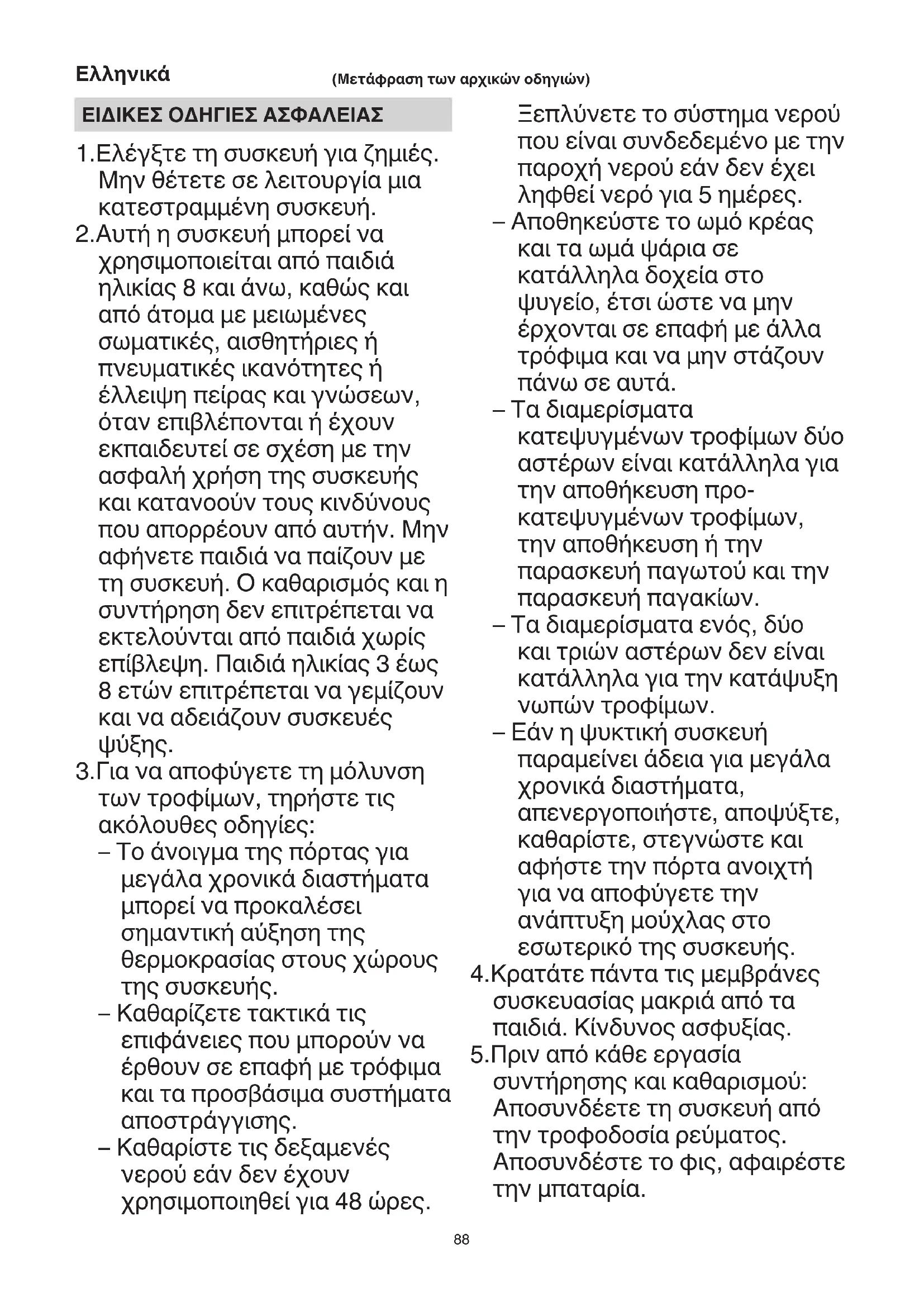 ΕΙΔΙΚΕΣ ΟΔΗΓΙΕΣ ΑΣΦΑΛΕΙΑΣ 1.Ελέγξτε τη συσκευή για ζημιές. Μην θέτετε σε λειτουργία μια κατεστραμμένη συσκευή. 2.Αυτή η συσκευή μπορεί να χρησιμοποιείται από παιδιά ηλικίας 8 και άνω, καθώς και από άτομα με μειωμένες σωματικές, αισθητήριες ή πνευματικές ικανότητες ή έλλειψη πείρας και γνώσεων, όταν επιβλέπονται ή έχουν εκπαιδευτεί σε σχέση με την ασφαλή χρήση της συσκευής και κατανοούν τους κινδύνους που απορρέουν από αυτήν. Μην αφήνετε παιδιά να παίζουν με τη συσκευή. Ο καθαρισμός και η συντήρηση δεν επιτρέπεται να εκτελούνται από παιδιά χωρίς επίβλεψη. Παιδιά ηλικίας 3 έως 8 ετών επιτρέπεται να γεμίζουν και να αδειάζουν συσκευές