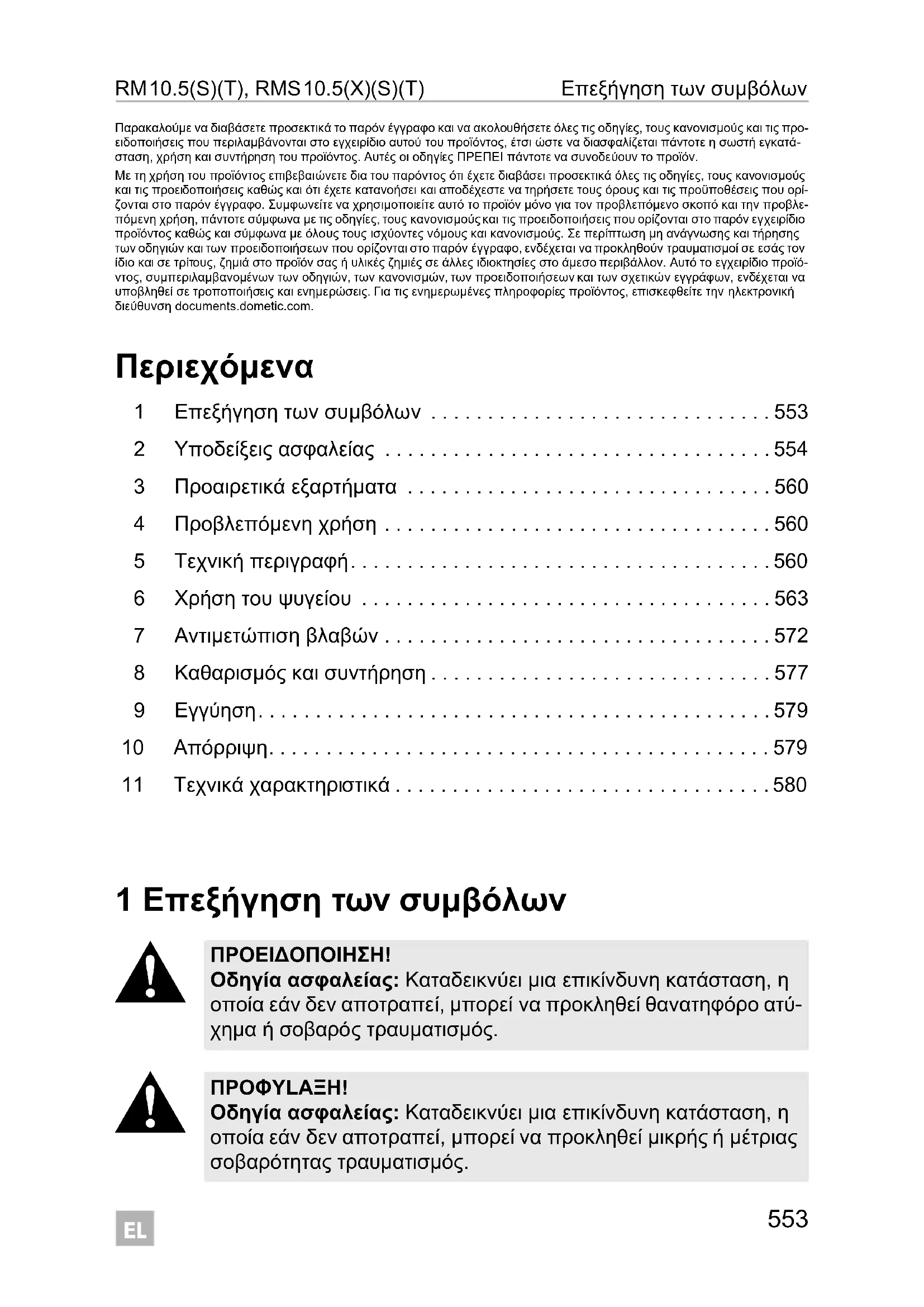 - Παρακαλούμε να διαβάσετε προσεκτικά το παρόν έγγραφο και να ακολουθήσετε όλες τις οδηγίες, τους κανονισμούς και τις προ- ειδοποιήσεις που περιλαμβάνονται στο εγχειρίδιο αυτού του προϊόντος, έτσι ώστε να διασφαλίζεται πάντοτε η σωστή εγκατά- σταση, χρήση και συντήρηση του προϊόντος. Αυτές οι οδηγίες ΠΡΕΠΕΙ πάντοτε να συνοδεύουν το προϊόν. Με τη χρήση του προϊόντος επιβεβαιώνετε δια του παρόντος ότι έχετε διαβάσει προσεκτικά όλες τις οδηγίες, τους κανονισμούς και τις προειδοποιήσεις καθώς και ότι έχετε κατανοήσει και αποδέχεστε να τηρήσετε τους όρους και τις προϋποθέσεις που ορί- ζονται στο παρόν έγγραφο. Συμφωνείτε να χρησιμοποιείτε αυτό το προϊόν μόνο για τον προβλεπόμενο σκοπό και την προβλε- πόμενη χρήση, πάντοτε σύμφωνα με τις οδηγίες, τους κανονισμούς και τις προειδοποιήσεις που ορίζονται στο παρόν εγχειρίδιο προϊόντος καθώς και σύμφωνα με όλους τους ισχύοντες νόμους και κανονισμούς. Σε περίπτωση μη ανάγνωσης και τήρησης των οδηγιών και των προειδοποιήσεων που ορίζονται στο παρόν έγγραφο, ενδέχεται να προκληθούν τραυματισμοί σε εσάς τον ίδιο και σε τρίτους, ζημιά στο προϊόν σας ή υλικές ζημιές σε άλλες ιδιοκτησίες στο άμεσο περιβάλλον. Αυτό το εγχειρίδιο προϊό- ντος, συμπεριλαμβανομένων των οδηγιών, των κανονισμών, των προειδοποιήσεων και των σχετικών εγγράφων, ενδέχεται να υποβληθεί σε τροποποιήσεις και ενημερώσεις. Για τις ενημερωμένες πληροφορίες προϊόντος, επισκεφθείτε την ηλεκτρονική διεύθυνση documents.dometic.com. Περιεχόμενα 1 Επεξήγηση των συμβόλων p. 553