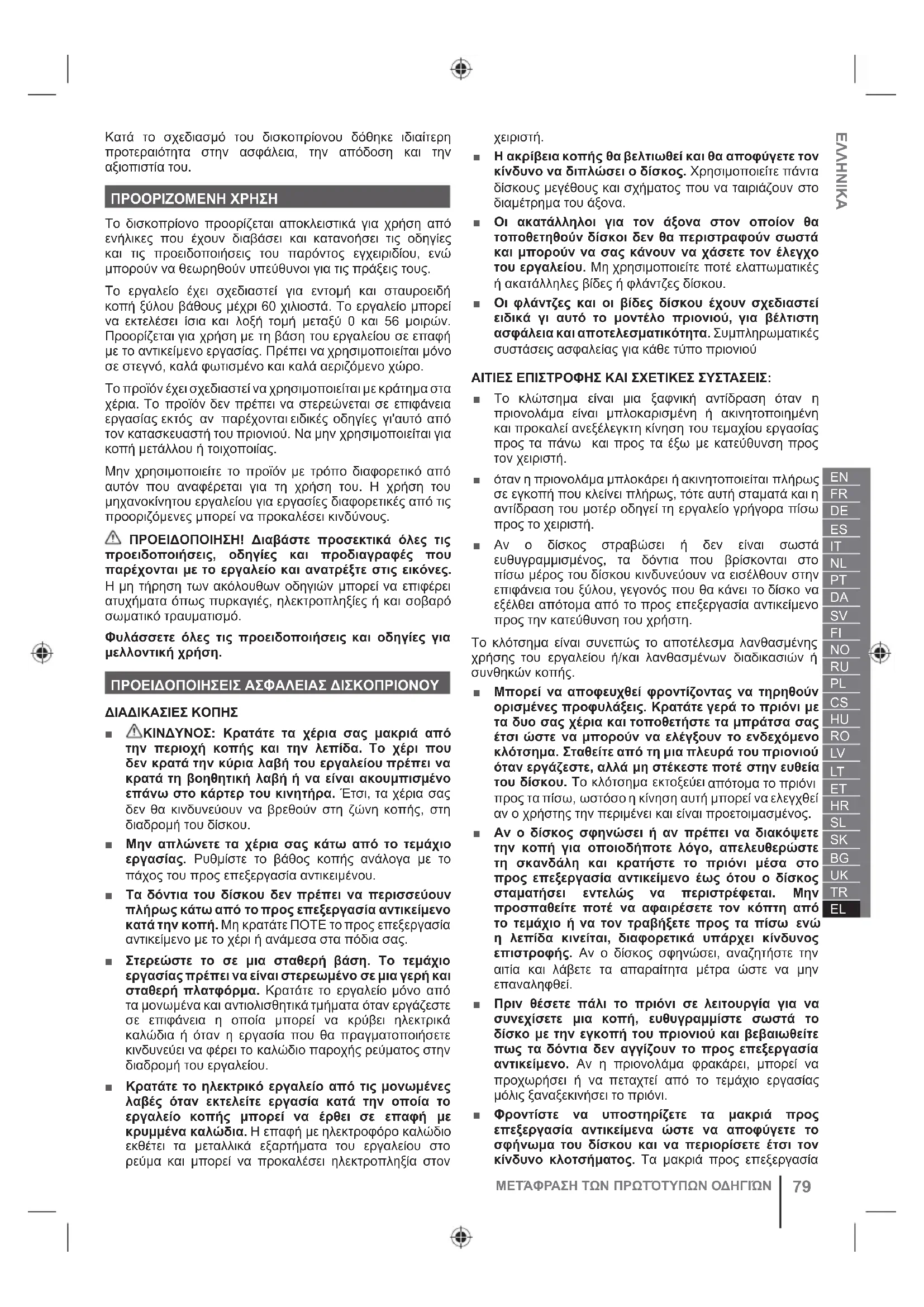 matlarΚατά το σχεδιασμό του δισκοπρίονου δόθηκε ιδιαίτερη προτεραιότητα στην ασφάλεια, την απόδοση και την αξιοπιστία του. ΠΡΟΟΡΙΖΟΜΕΝΗ ΧΡΗΣΗ Το δισκοπρίονο προορίζεται αποκλειστικά για χρήση από ενήλικες που έχουν διαβάσει και κατανοήσει τις οδηγίες και τις προειδοποιήσεις του παρόντος εγχειριδίου, ενώ μπορούν να θεωρηθούν υπεύθυνοι για τις πράξεις τους. To εργαλείο έχει σχεδιαστεί για εντομή και σταυροειδή κοπή ξύλου βάθους μέχρι 60 χιλιοστά. To εργαλείο μπορεί να εκτελέσει ίσια και λοξή τομή μεταξύ 0 και 56 μοιρών. Προορίζεται για χρήση με τη βάση του εργαλείου σε επαφή με το αντικείμενο εργασίας. Πρέπει να χρησιμοποιείται μόνο σε στεγνό, καλά φωτισμένο και καλά αεριζόμενο χώρο. Το προϊόν έχει σχεδιαστεί να χρησιμοποιείται με κράτημα στα χέρια. Το προϊόν δεν πρέπει να στερεώνεται σε επιφάνεια εργασίας εκτός αν παρέχονται ειδικές οδηγίες γι'αυτό από τον κατασκευαστή του πριονιού. Να μην χρησιμοποιείται για κοπή μετάλλου ή τοιχοποιίας. Μην χρησιμοποιείτε το προϊόν με τρόπο διαφορετικό από αυτόν που αναφέρεται για τη χρήση του. Η χρήση του μηχανοκίνητου εργαλείου για εργασίες διαφορετικές από τις προοριζόμενες μπορεί να προκαλέσει κινδύνους. ΠΡΟΕΙΔΟΠΟΙΗΣΗ! Διαβάστε προσεκτικά όλες τις προειδοποιήσεις, οδηγίες και προδιαγραφές που παρέχονται με το εργαλείο και ανατρέξτε στις εικόνες. Η μη τήρηση των ακόλουθων οδηγιών μπορεί να επιφέρει ατυχήματα όπως πυρκαγιές, ηλεκτροπληξίες ή και σοβαρό σωματικό τραυματισμό. Φυλάσσετε όλες τις προειδοποιήσεις και οδηγίες για μελλοντική χρήση. ΠΡΟΕΙΔΟΠΟΙΗΣΕΙΣ ΑΣΦΑΛΕΙΑΣ ΔΙΣΚΟΠΡΙΟΝΟΥ ΔΙΑΔΙΚΑΣΙΕΣ ΚΟΠΗΣ ■ ΚΙΝΔΥΝΟΣ: Κρατάτε τα χέρια σας μακριά από την περιοχή κοπής και την λεπίδα. Το χέρι που δεν κρατά την κύρια λαβή του εργαλείου πρέπει να κρατά τη βοηθητική λαβή ή να είναι ακουμπισμένο επάνω στο κάρτερ του κινητήρα. Έτσι, τα χέρια σας δεν θα κινδυνεύουν να βρεθούν στη ζώνη κοπής,