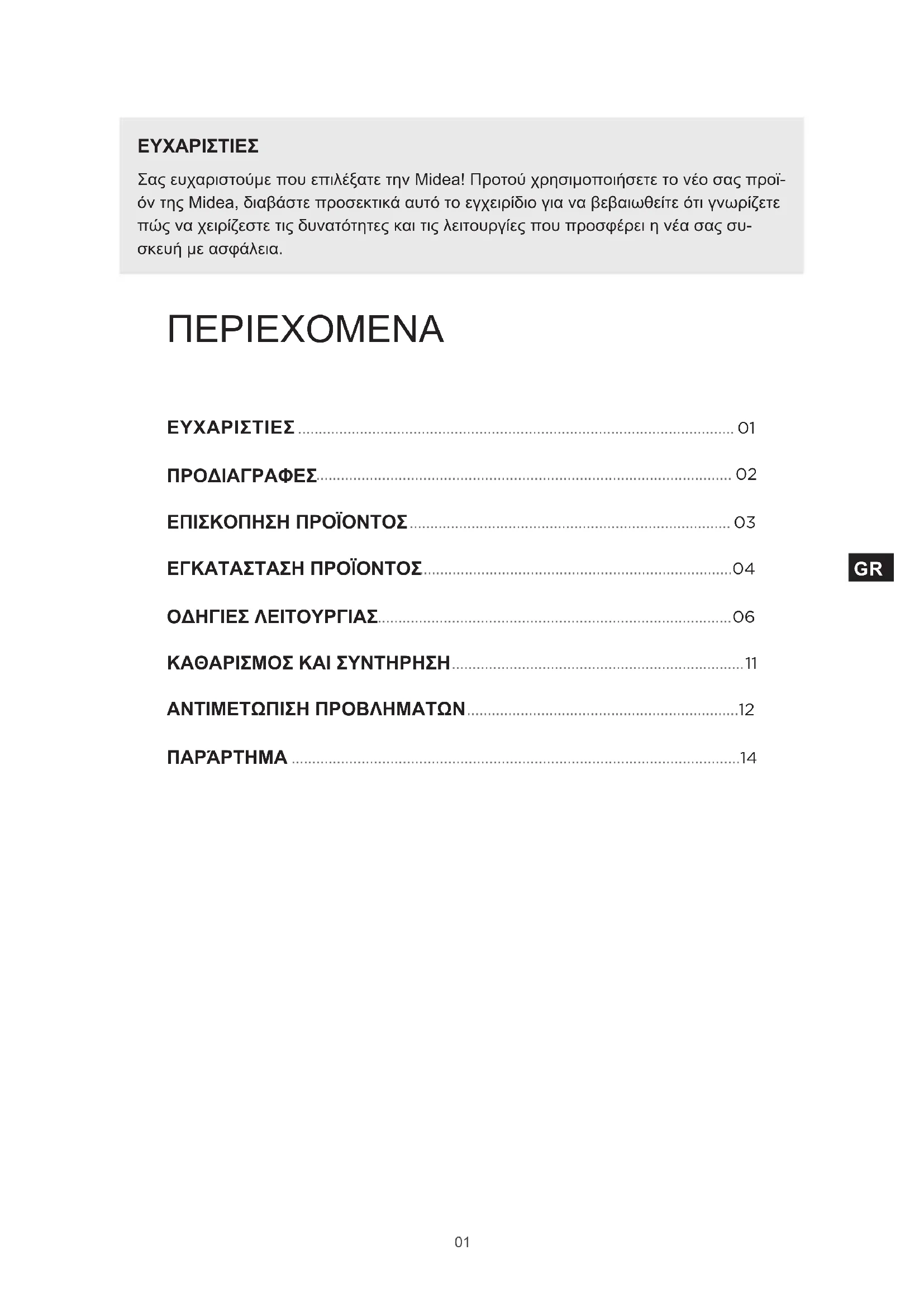 ΕΥΧΑΡΙΣΤΙΕΣ Σας ευχαριστούμε που επιλέξατε την Midea! Προτού χρησιμοποιήσετε το νέο σας προϊ- όν της Midea, διαβάστε προσεκτικά αυτό το εγχειρίδιο για να βεβαιωθείτε ότι γνωρίζετε πώς να χειρίζεστε τις δυνατότητες και τις λειτουργίες που προσφέρει η νέα σας συ- σκευή με ασφάλεια. ΠΕΡΙΕΧΟΜΕΝΑ ΕΥΧΑΡΙΣΤΙΕΣ