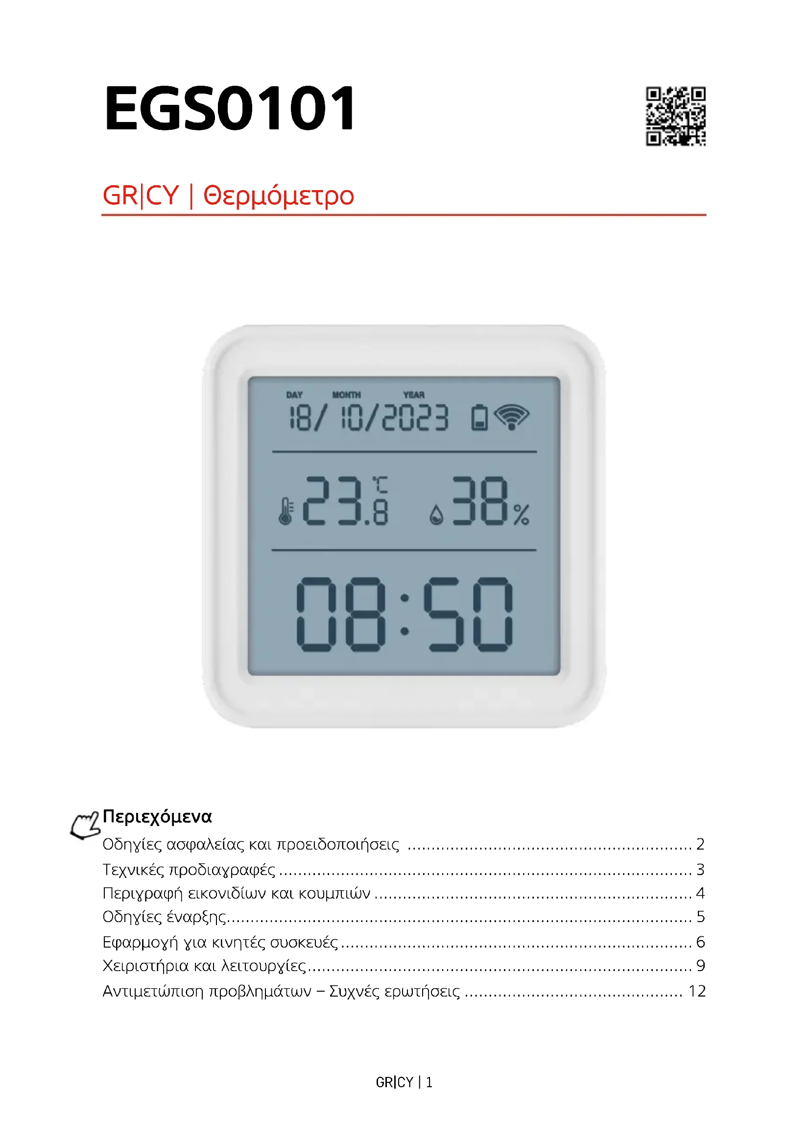 - O termómetro não está ligado à rede Wi-Fi; verique a funcionalidade da rede.GR|CY | 1 EGS0101 GR|CY | Θερμόμετρο Περιεχόμενα Οδηγίες ασφαλείας και προειδοποιήσεις ............................................................ 2 Τεχνικές προδιαγραφές ....................................................................................... 3 Περιγραφή εικονιδίων και κουμπιών ................................................................... 4 Οδηγίες έναρξης .................................................................................................. 5 Εφαρμογή για κινητές συσκευές .......................................................................... 6 Χειριστήρια και λειτουργίες ................................................................................. 9 Αντιμετώπιση προβλημάτων – Συχνές ερωτήσεις .............................................. 12GR|CY | 2 Οδηγίες ασφαλείας και προειδοποιήσεις Διαβάστε το εγχειρίδιο χρήστη πριν χρησιμοποιήσετε τη συσκευή. Ακολουθείτε τις οδηγίες ασφαλείας του εγχειριδίου.