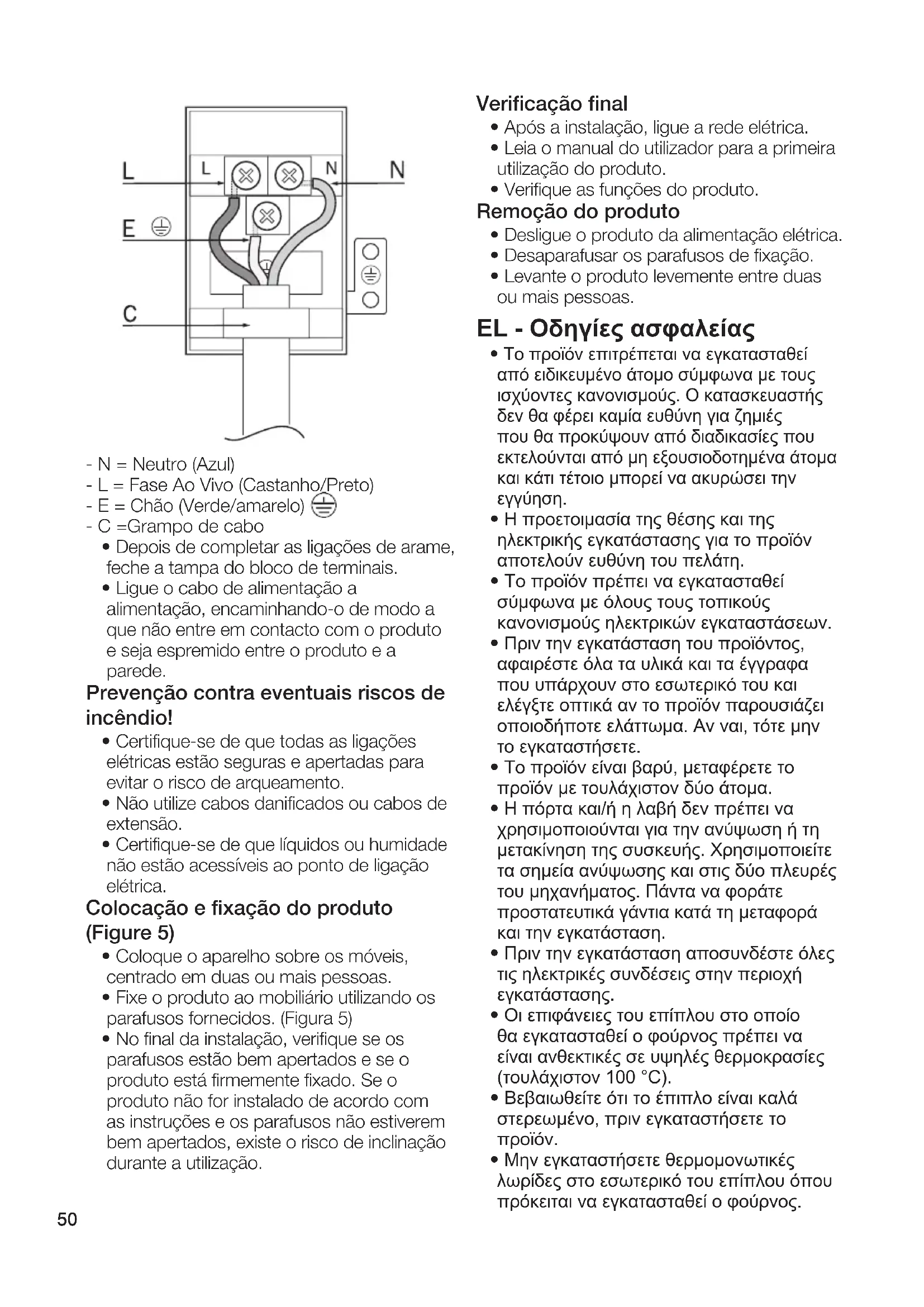 - Κατά την καλωδίωση πρέπει να εξασφαλίζεται η συμμόρφωση με τους εθνικούς / τοπικούς ηλεκτρικούς κανονισμούς και να χρησιμοποιείτε πρίζα / γραμμή και φις κατάλληλο για τον φούρνο. Αν τα όρια ισχύος του προϊόντος υπερβαίνουν την ικανότητα ρεύματος του φις και της πρίζας / γραμμής, πρέπει52 να συνδέσετε το προϊόν απευθείας στη σταθερή ηλεκτρική εγκατάσταση χωρίς να χρησιμοποιήσετε το φις και την πρίζα /