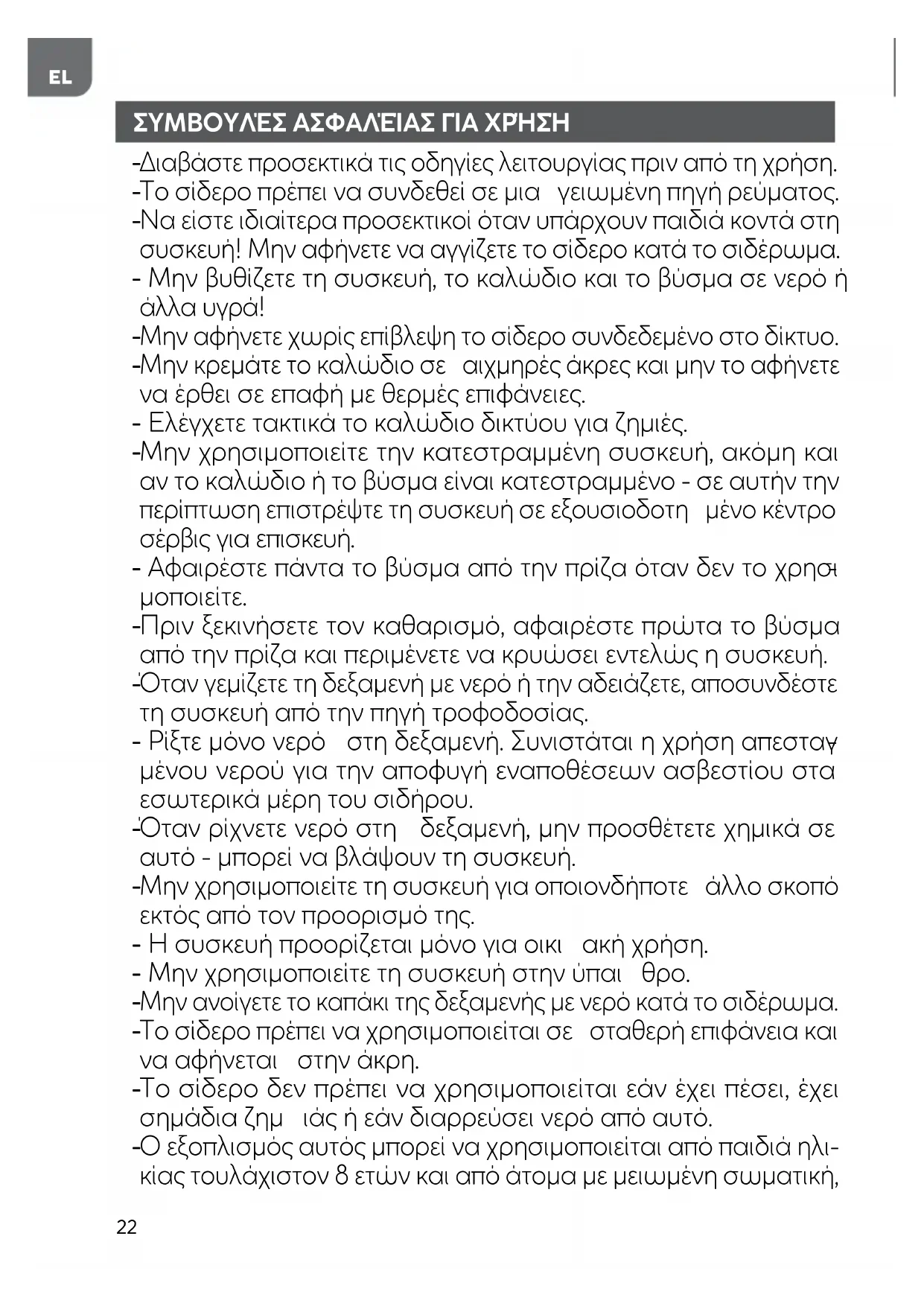μένου νερού για την αποφυγή εναποθέσεων ασβεστίου στα εσωτερικά μέρη του σιδήρου.