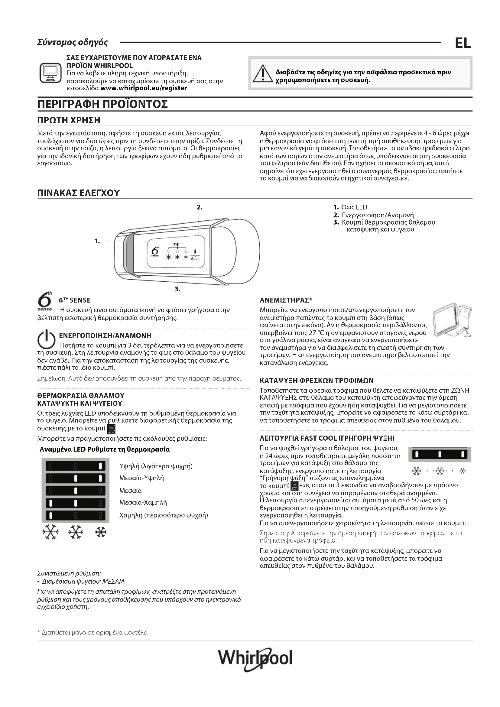 - Desligue a ventoinha (caso exista) de acordo com o procedimento descrito no parágrafo "VENTOINHA".EL Σύντομος οδηγός ΣΑΣ ΕΥΧΑΡΙΣΤΟΥΜΕ ΠΟΥ ΑΓΟΡΑΣΑΤΕ ΕΝΑ ΠΡΟΪΟΝ WHIRLPOOL Για να λάβετε πλήρη τεχνική υποστήριξη, παρακαλούμε να καταχωρίσετε τη συσκευή σας στην ιστοσελίδα www . whirlpool . eu/ register Διαβάστε τις οδηγίες για την ασφάλεια προσεκτικά πριν χρησιμοποιήσετε τη συσκευή. ΠΕΡΙΓΡΑΦΉ ΠΡΟΪΟΝΤΟΣ ΠΡΏΤΉ ΧΡΉΣΉ Μετά την εγκατάσταση, αφήστε τη συσκευή εκτός λειτουργίας τουλάχιστον για δύο ώρες πριν τη συνδέσετε στην πρίζα. Συνδέστε τη συσκευή στην πρίζα, η λειτουργία ξεκινά αυτόματα. Οι θερμοκρασίες για την ιδανική διατήρηση των τροφίμων έχουν ήδη ρυθμιστεί από το εργοστάσιο. Αφού ενεργοποιήσετε τη συσκευή, πρέπει να περιμένετε 4 - 6 ώρες μέχρι η θερμοκρασία να φτάσει στη σωστή τιμή αποθήκευσης τροφίμων για μια κανονικά γεμάτη συσκευή. Τοποθετήστε το αντιβακτηριδιακό φίλτρο κατά των οσμών στον ανεμιστήρα όπως υποδεικνύεται στη συσκευασία του φίλτρου (εάν διατίθεται). Εάν ηχήσει το ακουστικό σήμα, αυτό σημαίνει ότι έχει ενεργοποιηθεί ο συναγερμός θερμοκρασίας: πατήστε το κουμπί για να διακοπούν οι ηχητικοί συναγερμοί. ΠΙΝΑΚΑΣ ΕΛΕΓΧΟΥ