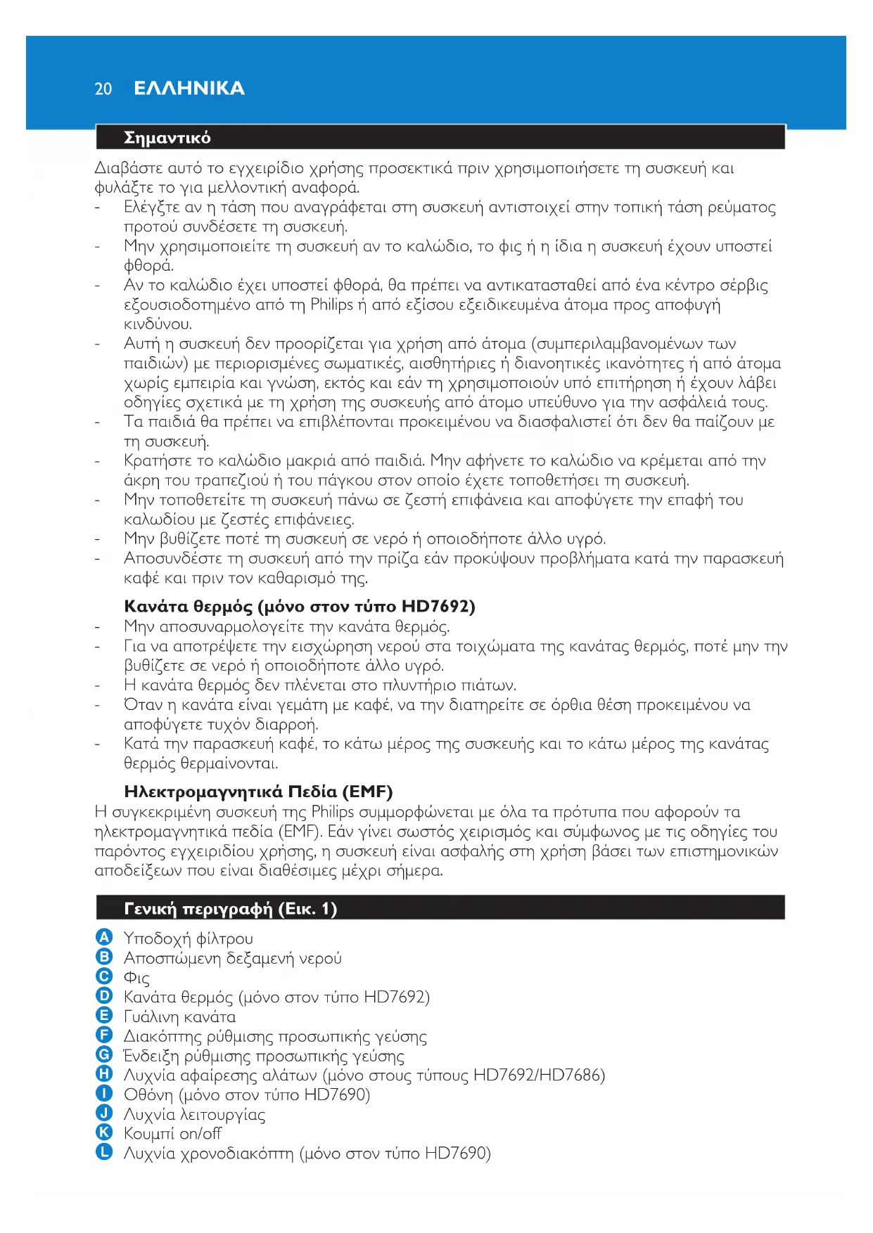 A Υποδοχή φίλτρου B Αποσπώμενη δεξαμενή νερού C Φις D Κανάτα θερμός (μόνο στον τύπο HD7692) E Γυάλινη κανάτα F Διακόπτης ρύθμισης προσωπικής γεύσης G Ένδειξη ρύθμισης προσωπικής γεύσης H Λυχνία αφαίρεσης αλάτων (μόνο στους τύπους HD7692/HD7686) I Οθόνη (μόνο στον τύπο HD7690) J Λυχνία λειτουργίας K Κουμπί on/off L Λυχνία χρονοδιακόπτη (μόνο στον τύπο HD7690)
