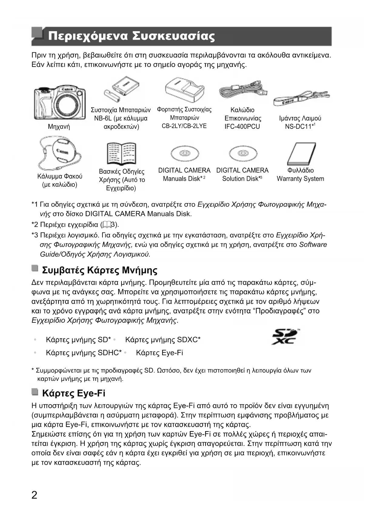 Περιεχόμενα Συσκευασίας Πριν τη χρήση, βεβαιωθείτε ότι στη συσκευασία περιλαμβάνονται τα ακόλουθα αντικείμενα. Εάν λείπει κάτι, επικοινωνήστε με το σημείο αγοράς της μηχανής. ΜηχανήΣυστοιχία Μπαταριών NB-6L (με κάλυμμα ακροδεκτών)Φορτιστής Συστοιχίας ΜπαταριώνCB-2LY/CB-2LYEΚαλώδιο ΕπικοινωνίαςIFC-400PCUΙμάντας ΛαιμούNS-DC11* Κάλυμμα Φακού(με καλώδιο)Βασικές Οδηγίες Χρήσης (Αυτό το Εγχειρίδιο)DIGITAL CAMERAManuals Disk* DIGITAL CAMERASolution Disk* Φυλλάδιο Warranty System *1 Για οδηγίες σχετικά με τη σύνδεση, ανατρέξτε στο Εγχειρίδιο Χρήσης Φωτογραφικής Μηχα- νής στο δίσκο DIGITAL CAMERA Manuals Disk. *2 Περιέχει εγχειρίδια (= 3). *3 Περιέχει λογισμικό. Για οδηγίες σχετικά με την εγκατάσταση, ανατρέξτε στο Εγχειρίδιο Χρή- σης Φωτογραφικής Μηχανής, ενώ για οδηγίες σχετικά με τη χρήση, ανατρέξτε στο Software Guide/Οδηγός Χρήσης Λογισμικού. ΣυμβατέςΚάρτεςΜνήμης Δεν περιλαμβάνεται κάρτα μνήμης. Προμηθευτείτε μία από τις παρακάτω κάρτες, σύμ- φωνα με τις ανάγκες σας. Μπορείτε να χρησιμοποιήσετε τις παρακάτω κάρτες μνήμης, ανεξάρτητα από τη χωρητικότητά τους. Για λεπτομέρειες σχετικά με τον αριθμό λήψεων και το χρόνο εγγραφής ανά κάρτα μνήμης, ανατρέξτε στην ενότητα “Προδιαγραφές” στο Εγχειρίδιο Χρήσης Φωτογραφικής Μηχανής.