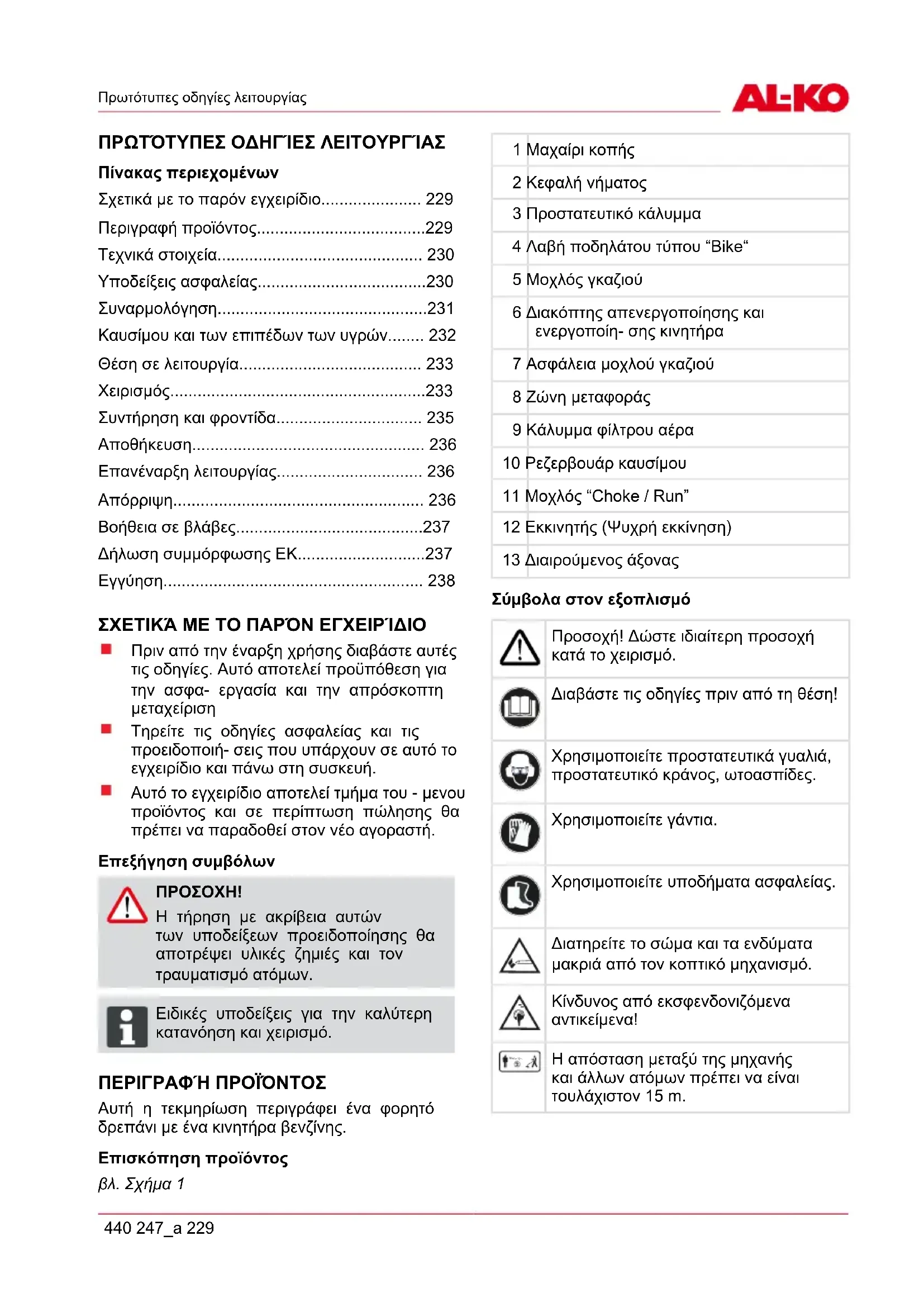 Η τήρηση με ακρίβεια αυτών των υποδείξεων προειδοποίησης θα αποτρέψει υλικές ζημιές και τον τραυματισμό ατόμων. ADVICE Ειδικές υποδείξεις για την καλύτερη κατανόηση και χειρισμό. ΠΕΡΙΓΡΑΦΉ ΠΡΟΪΌΝΤΟΣ Αυτή η τεκμηρίωση περιγράφει ένα φορητό δρεπάνι με ένα κινητήρα βενζίνης. Επισκόπηση προϊόντος βλ. Σχήμα 1 1 Μαχαίρι κοπής 2 Κεφαλή νήματος 3 Προστατευτικό κάλυμμα 4 Λαβή ποδηλάτου τύπου “Bike“ 5 Μοχλός γκαζιού 6 Διακόπτης απενεργοποίησης και ενεργοποίη- σης κινητήρα 7 Ασφάλεια μοχλού γκαζιού 8 Ζώνη μεταφοράς 9 Κάλυμμα φίλτρου αέρα 10 Ρεζερβουάρ καυσίμου 11 Μοχλός “Choke / Run” 12 Εκκινητής (Ψυχρή εκκίνηση) 13 Διαιρούμενος άξονας Σύμβολα στον εξοπλισμό Προσοχή! Δώστε ιδιαίτερη προσοχή κατά το χειρισμό. Διαβάστε τις οδηγίες πριν από τη θέση! Χρησιμοποιείτε προστατευτικά γυαλιά, προστατευτικό κράνος, ωτοασπίδες. Χρησιμοποιείτε γάντια. Χρησιμοποιείτε υποδήματα ασφαλείας. Διατηρείτε το σώμα και τα ενδύματα μακριά από τον κοπτικό μηχανισμό. Κίνδυνος από εκσφενδονιζόμενα αντικείμενα! 15m(50ft) Η απόσταση μεταξύ της μηχανής και άλλων ατόμων πρέπει να είναι τουλάχιστον 15 m.el Περιγραφή προϊόντος 230 BC 4535 II-S Μηχανισμοί ασφαλείας και προστασίας Διακοπή κινδύνου Σε περίπτωση κινδύνου ρυθμίστε το διακόπτη ανάφλεξης στη θέση „STOP“. Προφυλακτήρας για κτυπήματα πέτρας Προστατεύει το χρήστη από εκσφενδονιζόμενα αντικείμενα. Το ενσωματωμένο μαχαίρι κόβει το νήμα κοπής στο επι- τρεπτό μήκος.