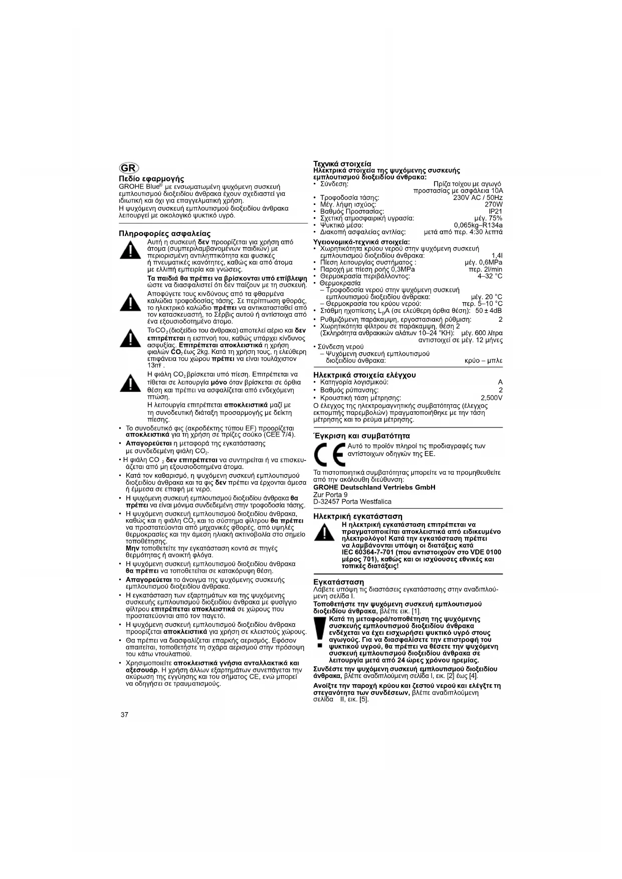 - Κρουστική τάση µέτρησης:2,500V Ο έλεγχος της ηλεκτροµαγνητικής συµβατότητας (έλεγχος εκποµπής παρεµβολών) πραγµατοποιήθηκε µε την τάση µέτρησης και το ρεύµα µέτρησης. Έγκριση και συµβατότητα Τα πιστοποιητικά συµβατότητας µπορείτε να τα προµηθευθείτε από την ακόλουθη διεύθυνση: GROHE Deutschland Vertriebs GmbH Zur Porta 9 D-32457 Porta Westfalica Ηλεκτρική εγκατάσταση Η ηλεκτρική εγκατάσταση επιτρέπεται να πραγµατοποιείται αποκλειστικά από ειδικευµένο ηλεκτρολόγο! Κατά την εγκατάσταση πρέπει να λαµβάνονται υπόψη οι διατάξεις κατά IEC 60364-7-701 (που αντιστοιχούν στο VDE 0100 µέρος 701), καθώς και οι ισχύουσες εθνικές και τοπικές διατάξεις! Εγκατάσταση Λάβετε υπόψη τις διαστάσεις εγκατάστασης στην αναδιπλού- µενη σελίδα I. Τοποθετήστε την ψυχόµενη συσκευή εµπλουτισµού διοξειδίου άνθρακα, βλέπε εικ. [1]. Κατά τη µεταφορά/τοποθέτηση της ψυχόµενης συσκευής εµπλουτισµού διοξειδίου άνθρακα ενδέχεται να έχει εισχωρήσει ψυκτικό υγρό στους αγωγούς. Για να διασφαλίσετε την επιστροφή του ψυκτικού υγρού, θα πρέπει να θέσετε την ψυχόµενη συσκευή εµπλουτισµού διοξειδίου άνθρακα σε λειτουργία µετά από 24 ώρες χρόνου ηρεµίας. Συνδέστε την ψυχόµενη συσκευή εµπλουτισµού διοξειδίου άνθρακα, βλέπε αναδιπλούµενη σελίδα I, εικ. [2] έως [4]. Ανοίξτε την παροχή κρύου και ζεστού νερού και ελέγξτε τη στεγανότητα των συνδέσεων, βλέπε αναδιπλούµενη σελίδα II, εικ. [5]. Αυτό το προϊόν πληροί τις προδιαγραφές των αντίστοιχων οδηγιών της ΕΕ.38 Συνδέστε µεταξύ τους τα εξαρτήµατα και την ψυχόµενη συσκευή εµπλουτισµού διοξειδίου άνθρακα, βλέπε εικ.[6]. Αποκαταστήστε την τροφοδοσία τάσης µέσω του φις, βλέπε εικ. [7]. Η ένδειξη στην οθόνη ανάβει και εµφανίζεται η υπολειπόµενη χωρητικότητα του φίλτρου σε ποσοστό επί τοις εκατό. Συνδέστε τη φιάλη CO