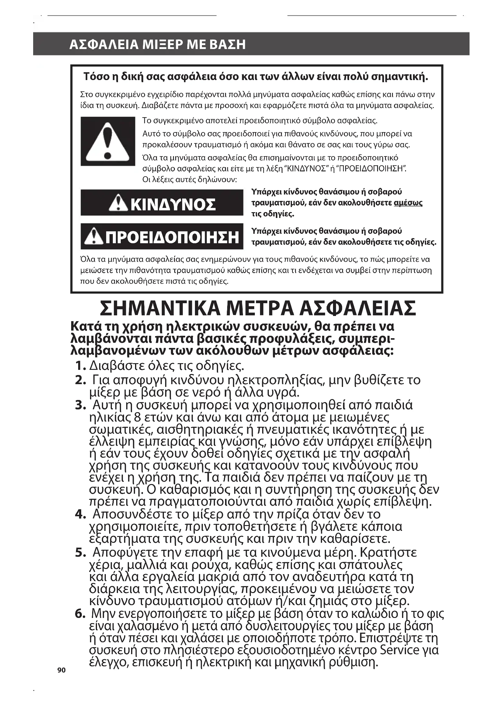 - Εξυπηρέτηση πελατών ΠΙΝΑΚΑΣ ΠΕΡΙΕΧΟΜΕΝΝ W10648168A_08_GR.indd 89 1/29/14 3:18 PM90 ΑΣΦΑΛΕΙΑ ΜΙΞΕΡ ΜΕ ΒΑΣΗΑΣΦΑΛΕΙΑ ΜΙΞΕΡ ΜΕ ΒΑΣΗ Τόσο η δική σας ασφάλεια όσο και των άλλων είναι πολύ σημαντική. Στο συγκεκριμένο εγχειρίδιο παρέχονται πολλά μηνύματα ασφαλείας καθώς επίσης και πάνω στην ίδια τη συσκευή. Διαβάζετε πάντα με προσοxή και εφαρμόζετε πιστά όλα τα μηνύματα ασφαλείας. Το συγκεκριμένο αποτελεί προειδοποιητικό σύμβολο ασφαλείας. Αυτό το σύμβολο σας προειδοποιεί για πιθανούς κινδύνους, που μπορεί να προκαλέσουν τραυματισμό ή ακόμα και θάνατο σε σας και τους γύρω σας. Όλα τα μηνύματα ασφαλείας θα επισημαίνονται με το προειδοποιητικό σύμβολο ασφαλείας και είτε με τη λέξη “ΚΙΝΔΥΝΟΣ” ή “ΠΡΟΕΙΔΟΠΟΙΗΣΗ”. Οι λέξεις αυτές δηλώνουν: Υπάρχει κίνδυνος θανάσιμου ή σοβαρού τραυματισμού, εάν δεν ακολουθήσετε αμέσως τις οδηγίες. Υπάρχει κίνδυνος θανάσιμου ή σοβαρού τραυματισμού, εάν δεν ακολουθήσετε τις οδηγίες. Όλα τα μηνύματα ασφαλείας σας ενημερώνουν για τους πιθανούς κινδύνους, το πώς μπορείτε να μειώσετε την πιθανότητα τραυματισμού καθώς επίσης και τι ενδέχεται να συμβεί στην περίπτωση που δεν ακολουθήσετε πιστά τις οδηγίες. p. 100