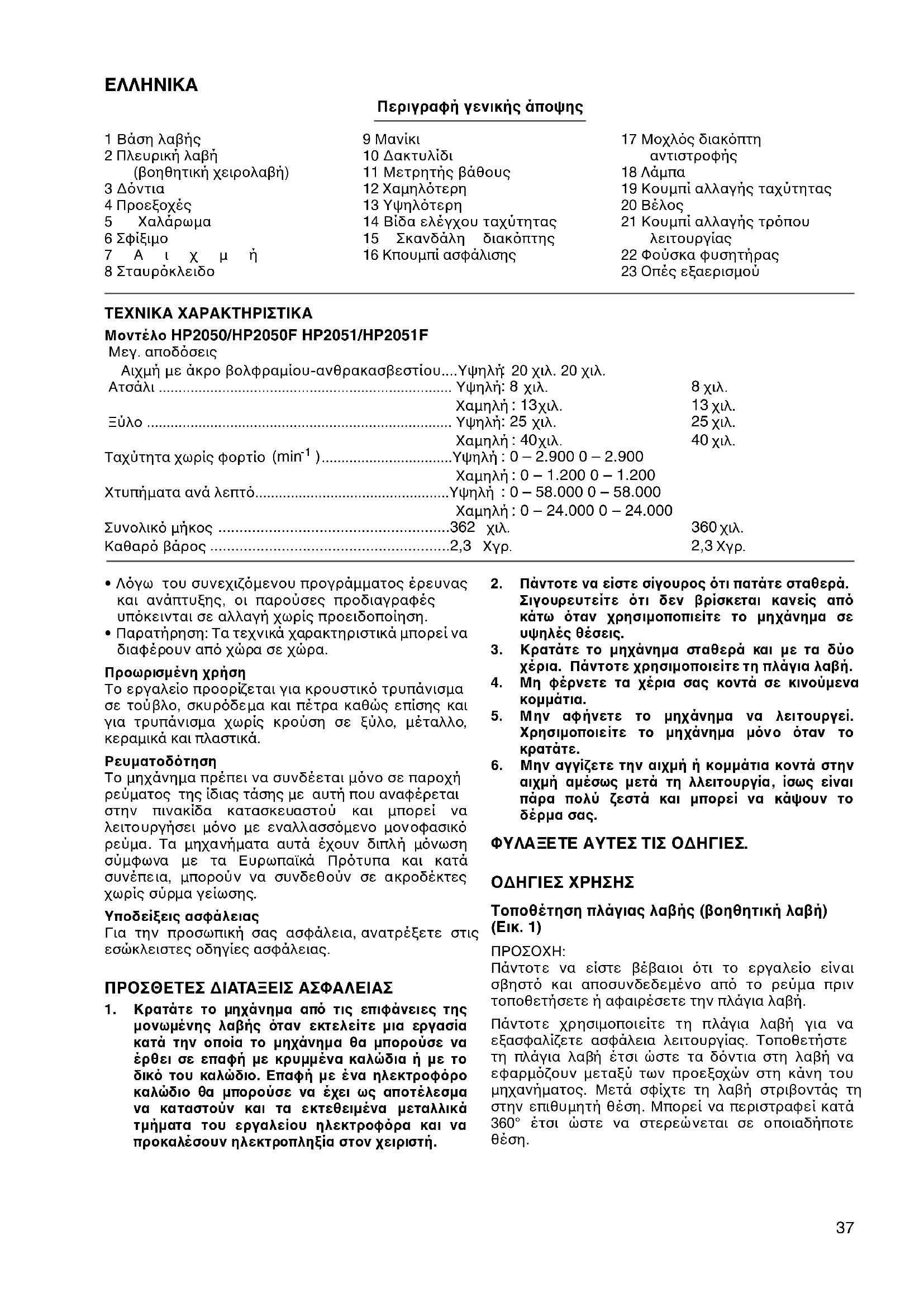 Περιγραφή γενικής άποψης 1 Βάση λαβής 2 Πλευρική λαβή (βοηθητική χειρολαβή) 3 ∆ντια 4 Προεξοχές 5 Χαλάρωµα 6 Σφίξιµο 7Αιχµή 8 Σταυρκλειδο 9 Μανίκι 10 ∆ακτυλίδι 11 Μετρητής βάθους 12 Χαµηλτερη 13 Υψηλτερη 14 Βίδα ελέγχου ταχύτητας 15 Σκανδάλη διακπτης 16 Κπουµπί ασφάλισης 17 Μοχλς διακπτη αντιστροφής 18 Λάµπα 19 Κουµπί αλλαγής ταχύτητας 20 Βέλος 21 Κουµπί αλλαγής τρπου λειτουργίας 22 Φούσκα φυσητήρας 23 Οπές εξαερισµού ΤΕΧΝΙΚΑ ΧΑΡΑΚΤΗΡΙΣΤΙΚΑ Μοντέλο HP2050/HP2050F HP2051/HP2051F Μεγ. αποδσεις Αιχµή µε άκρο βολφραµίου-ανθρακασβεστίου....Υψηλή