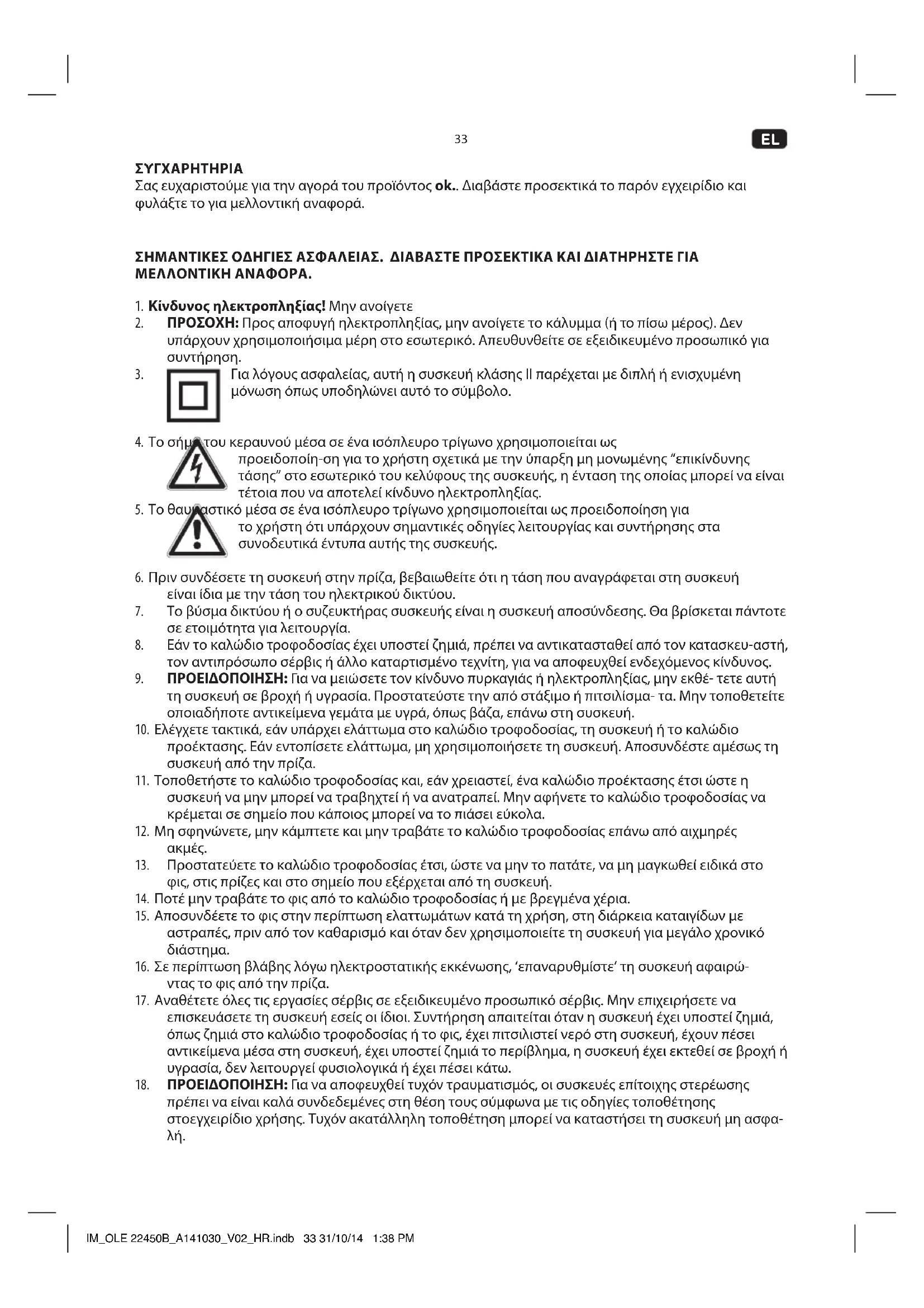 ΣΥΓΧΑΡΗΤΗΡΙΑ Σας ευχαριστούμε για την αγορά του προϊόντος ok.. Διαβάστε προσεκτικά το παρόν εγχειρίδιο και φυλάξτε το για μελλοντική αναφορά. ΣΗΜΑΝΤΙΚΕΣ ΟΔΗΓΙΕΣ ΑΣΦΑΛΕΙΑΣ. ΔΙΑΒΑΣΤΕ ΠΡΟΣΕΚΤΙΚΑ ΚΑΙ ΔΙΑΤΗΡΗΣΤΕ ΓΙΑ ΜΕΛΛΟΝΤΙΚΗ ΑΝΑΦΟΡΑ.