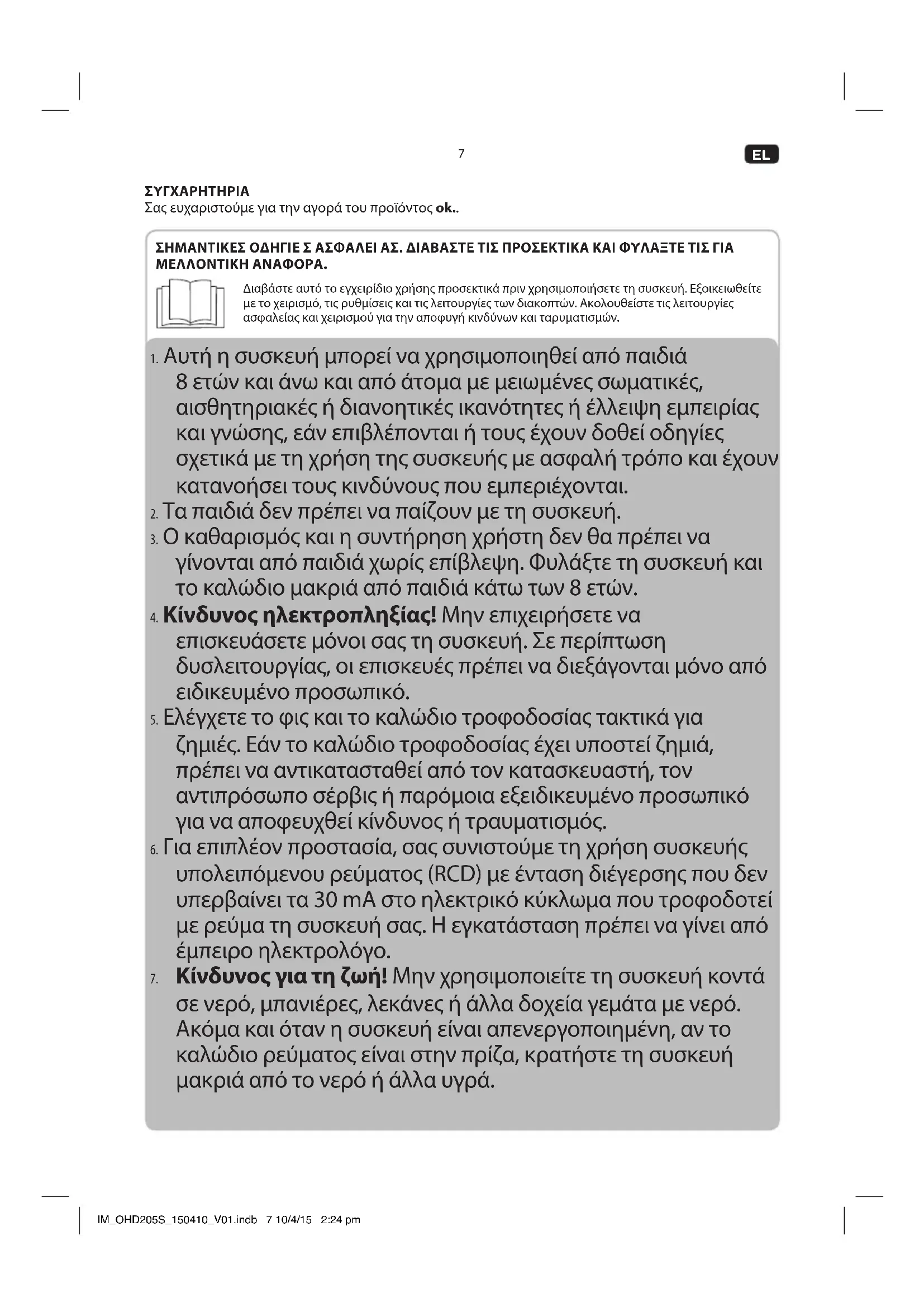 - O kaθαρισμός και η συντήρονη χρόστη δεν θα πρέπεινα γίνονται από παιδία χωρίς επίβλεψη. Φύλαξτε τη συσκεύŋ και το καλώδιο μακρία από παιδία κάτω τών 8 ετών.
