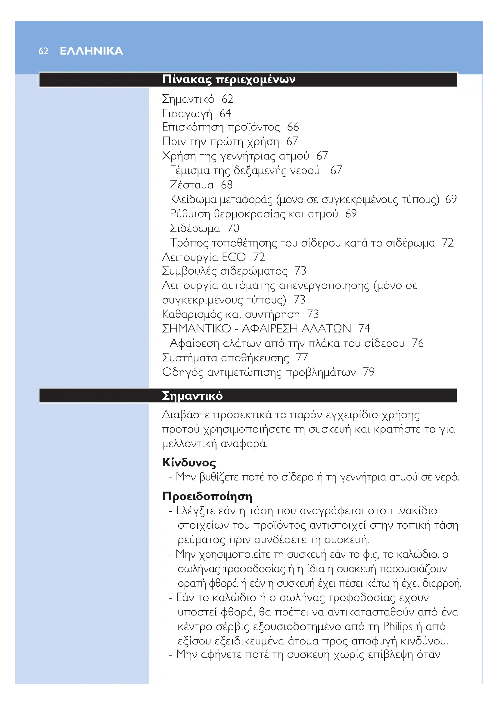 Ρύθμιση θερμοκρασίας και ατμού 69 Σιδέρωμα 70 Τρόπος τοποθέτησης του σίδερου κατά το σιδέρωμα 72 Λειτουργία ECO 72 Συμβουλές σιδερώματος 73 Λειτουργία αυτόματης απενεργοποίησης (μόνο σε συγκεκριμένους τύπους) 73 Καθαρισμός και συντήρηση 73 ΣΗΜΑΝΤΙΚΟ - ΑΦΑΙΡΕΣΗ ΑΛΑΤΩΝ 74 Αφαίρεση αλάτων από την πλάκα του σίδερου 76 Συστήματα αποθήκευσης 77 Οδηγός αντιμετώπισης προβλημάτων 79