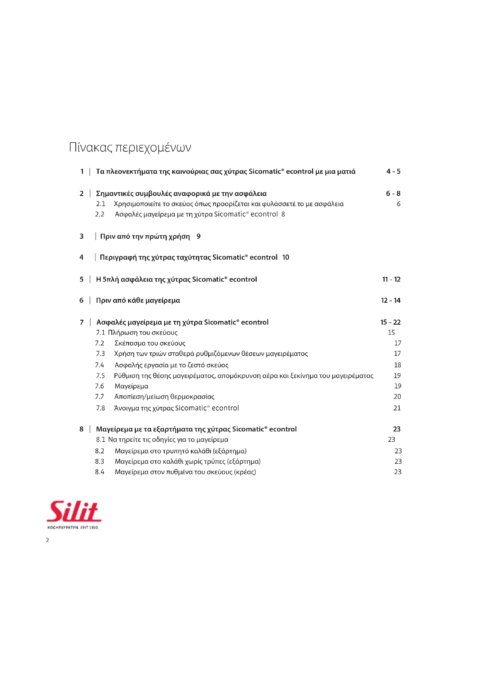 3 | Πριν από την πρώτη χρήση 9 4 | Περιγραφή της χύτρας ταχύτητας Sicomatic® econtrol 10 5 | Η 5πλή ασφάλεια της χύτρας Sicomatic® econtrol 11 - 12 6 | Πριν από κάθε μαγείρεμα 12 - 14 7 | Ασφαλές μαγείρεμα με τη χύτρα Sicomatic® econtrol 15 - 22