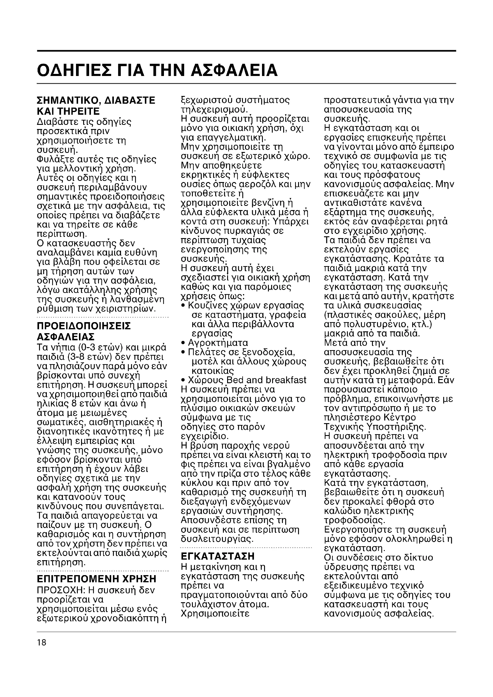 ΕΠΙΤΡΕΠΟΜΕΝΗ ΧΡΗΣΗ ΠΡΟΣΟΧΗ: Η συσκευή δεν προορίζεται να χρησιμοποιείται μέσω εν$ς εξωτερικού χρονοδιακ$πτη ή ξεχωριστού συστήματος τηλεχειρισμού. Η συσκευή αυτή προορίζεται μ$νο για οικιακή χρήση, $χι για επαγγελματική. Μην χρησιμοποιείτε τη συσκευή σε εξωτερικ$ χώρο. Μην αποθηκεύετε εκρηκτικές ή εύφλεκτες ουσίες $πως αεροζ$λ και μην τοποθετείτε ή χρησιμοποιείτε βενζίνη ή άλλα εύφλεκτα υλικά μέσα ή κοντά στη συσκευή: Υπάρχει κίνδυνος πυρκαγιάς σε περίπτωση τυχαίας ενεργοποίησης της