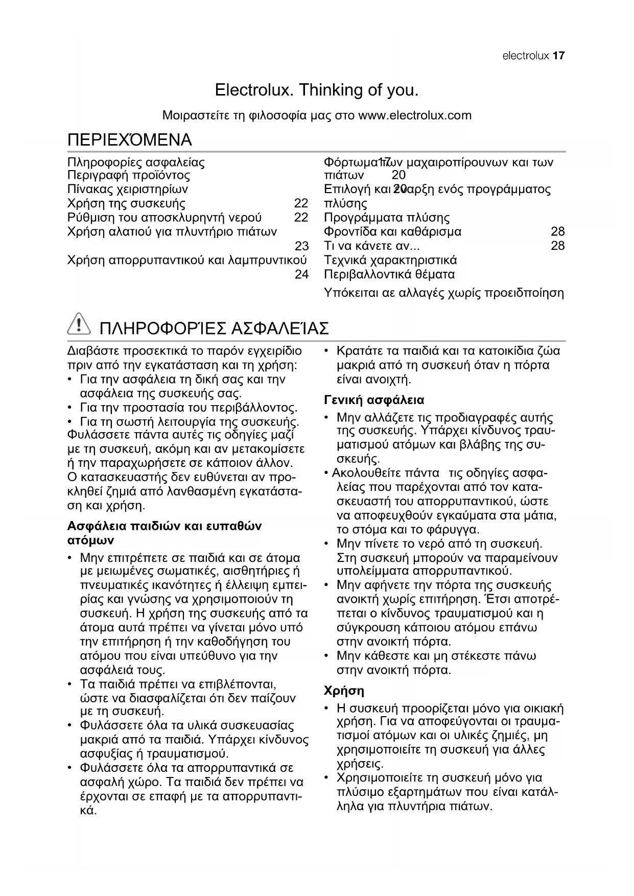 Φόρτωμα των μαχαιροπίρουνων και των πιάτων 25 Επιλογή και έναρξη ενός προγράμματος πλύσης 26 Προγράμματα πλύσης 27 Φροντίδα και καθάρισμα 28 Τι να κάνετε αν... 28 Τεχνικά χαρακτηριστικά 31 Περιβαλλοντικά θέματα 31 Υπόκειται αε αλλαγές χωρίς προειδποίηση ΠΛΗΡΟΦΟΡΊΕΣ ΑΣΦΑΛΕΊΑΣ Διαβάστε προσεκτικά το παρόν εγχειρίδιο πριν από την εγκατάσταση και τη χρήση: