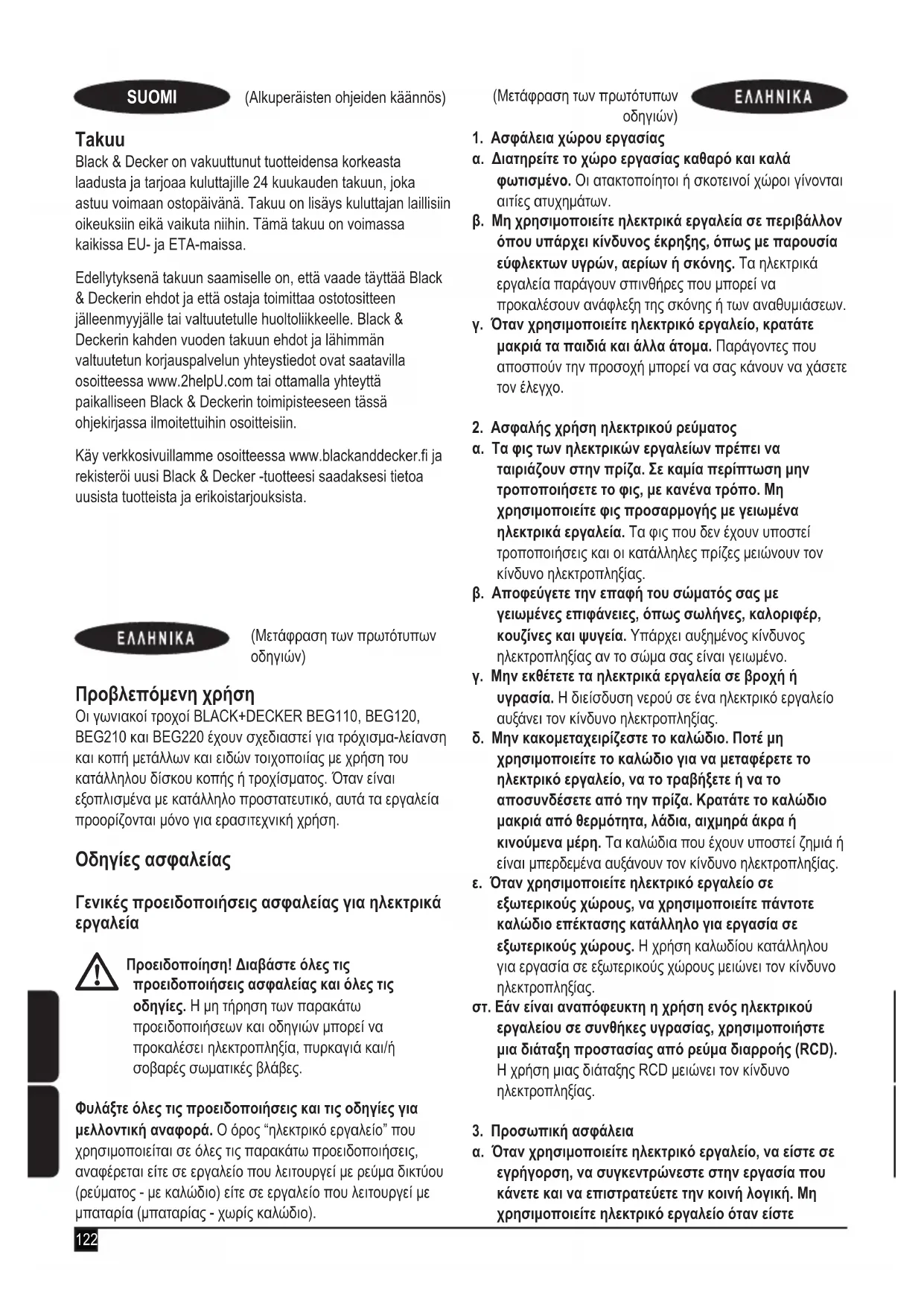 Προβλεπόμενη χρήση Οι γωνιακοί τροχοί BLACK+DECKER BEG110, BEG120, BEG210 και BEG220 έχουν σχεδιαστεί για τρόχισμα-λείανση και κοπή μετάλλων και ειδών τοιχοποιίας με χρήση του κατάλληλου δίσκου κοπής ή τροχίσματος. Όταν είναι εξοπλισμένα με κατάλληλο προστατευτικό, αυτά τα εργαλεία προορίζονται μόνο για ερασιτεχνική χρήση. Οδηγίες ασφαλείας Γενικές προειδοποιήσεις ασφαλείας για ηλεκτρικά