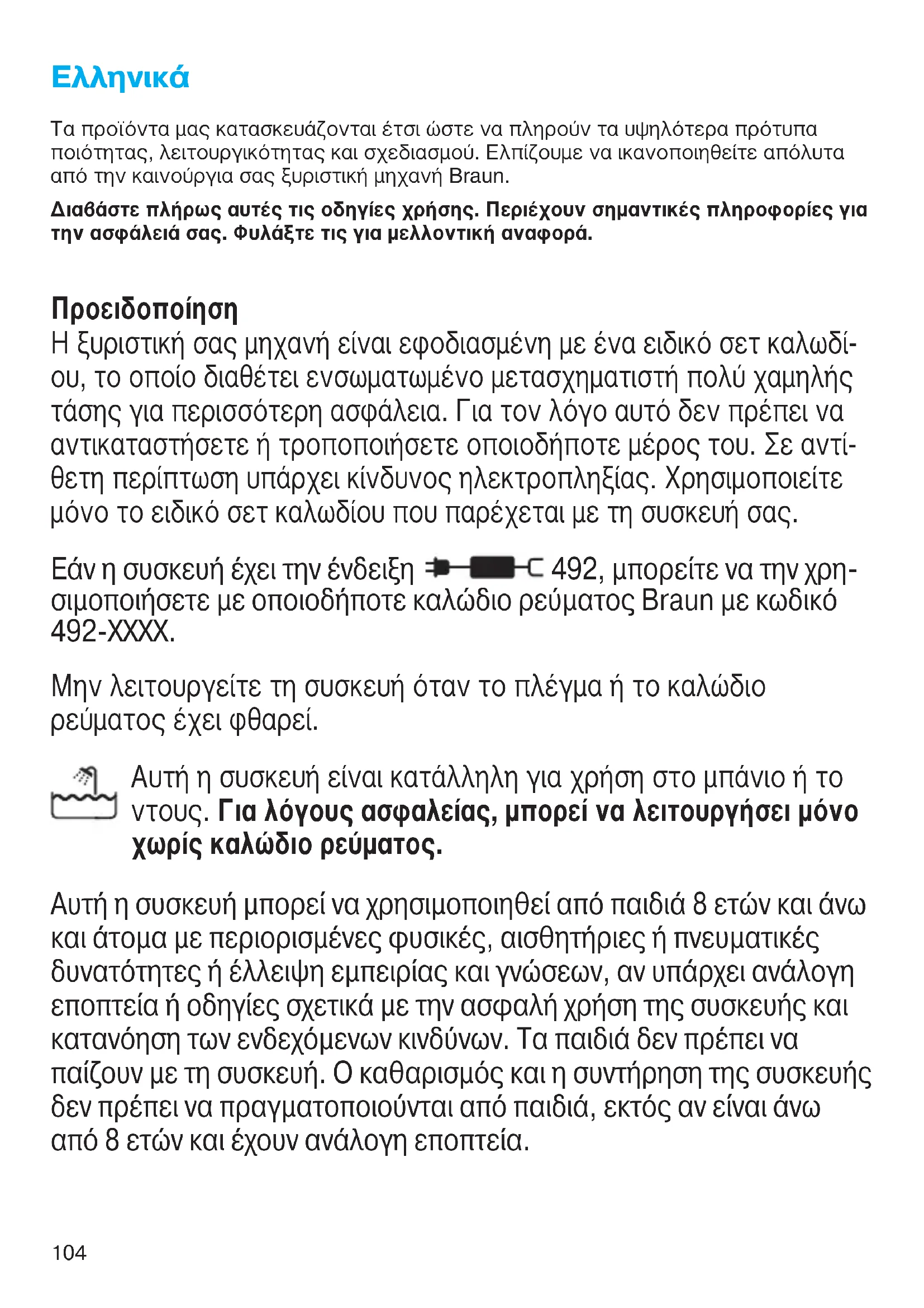 Τα προϊόντα μας κατασκευάζονται έτσι ώστε να πληρούν τα υψηλότερα πρότυπα ποιότητας, λειτουργικότητας και σχεδιασμού. Ελπίζουμε να ικανοποιηθείτε απόλυτα από την καινούργια σας ξυριστική μηχανή Braun. Διαβάστε πλήρως αυτές τις οδηγίες χρήσης. Περιέχουν σημαντικές πληροφορίες για την ασφάλειά σας. Φυλάξτε τις για μελλοντική αναφορά. Προειδοποίηση Η ξυριστική σας μηχανή είναι εφοδιασμένη με ένα ειδικό σετ καλωδί- ου, το οποίο διαθέτει ενσωματωμένο μετασχηματιστή πολύ χαμηλής τάσης για περισσότερη ασφάλεια. Για τον λόγο αυτό δεν πρέπει να αντικαταστήσετε ή τροποποιήσετε οποιοδήποτε μέρος του. Σε αντί- θετη περίπτωση υπάρχει κίνδυνος ηλεκτροπληξίας. Χρησιμοποιείτε μόνο το ειδικό σετ καλωδίου που παρέχεται με τη συσκευή σας. Εάν η συσκευή έχει την ένδειξη 492, μπορείτε να την χρη- σιμοποιήσετε με οποιοδήποτε καλώδιο ρεύματος Braun με κωδικό 492-ΧΧΧΧ. Μην λειτουργείτε τη συσκευή όταν το πλέγμα ή το καλώδιο ρεύματος έχει φθαρεί. Αυτή η συσκευή είναι κατάλληλη για χρήση στο μπάνιο ή το ντους. Για λόγους ασφαλείας, μπορεί να λειτουργήσει μόνο χωρίς καλώδιο ρεύματος. Αυτή η συσκευή μπορεί να χρησιμοποιηθεί από παιδιά 8 ετών και άνω και άτομα με περιορισμένες φυσικές, αισθητήριες ή πνευματικές δυνατότητες ή έλλειψη εμπειρίας και γνώσεων, αν υπάρχει ανάλογη εποπτεία ή οδηγίες σχετικά με την ασφαλή χρήση της συσκευής και κατανόηση των ενδεχόμενων κινδύνων. Τα παιδιά δεν πρέπει να παίζουν με τη συσκευή. Ο καθαρισμός και η συντήρηση της συσκευής δεν πρέπει να πραγματοποιούνται από παιδιά, εκτός αν είναι άνω από 8 ετών και έχουν ανάλογη εποπτεία. 91153500_Series_7-8_Solo_EURO_S6-140.indd 10491153500_Series_7-8_Solo_EURO_S6-140.indd 104 28.11.16 13:4228.11.16 13:42 CSS APPROVED Effective Date 30Nov2016 GMT - Printed 04Jan2017 Page 103 of 139105