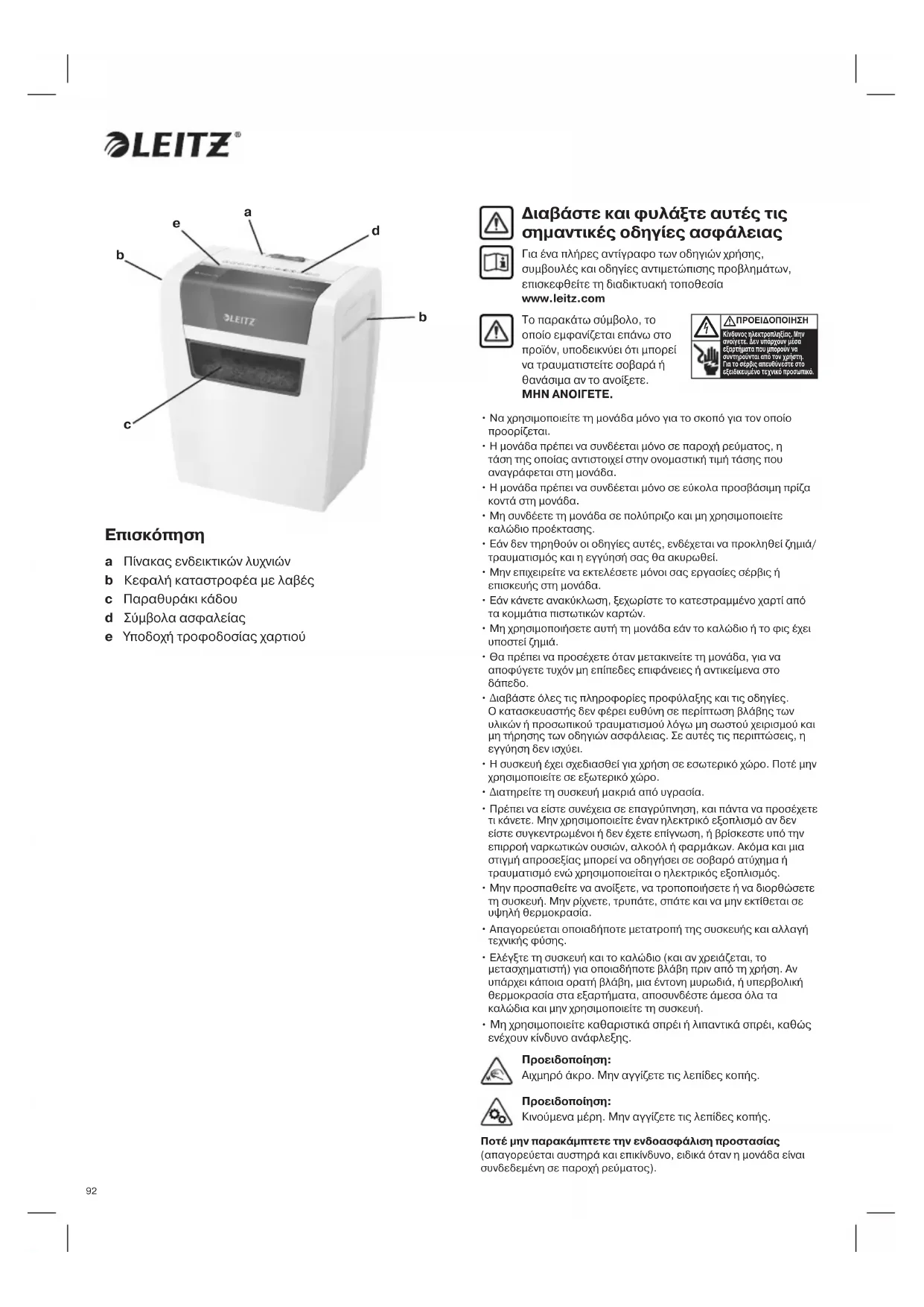 - Μη χρησιμοποιείτε καθαριστικά σπρέι ή λιπαντικά σπρέι, καθώς ενέχουν κίνδυνο ανάφλεξης. Διαβάστε και φυλάξτε αυτές τις σημαντικές οδηγίες ασφάλειας Για ένα πλήρες αντίγραφο των οδηγιών χρήσης, συμβουλές και οδηγίες αντιμετώπισης προβλημάτων, επισκεφθείτε τη διαδικτυακή τοποθεσία www.leitz.com Το παρακάτω σύμβολο, το οποίο εμφανίζεται επάνω στο προϊόν, υποδεικνύει ότι μπορεί να τραυματιστείτε σοβαρά ή θανάσιμα αν το ανοίξετε. ΜΗΝ ΑΝΟΙΓΕΤΕ. Κίνδυνος ηλεκτροπληξίας. Μην ανοίγετε. Δεν υπάρχουν μέσα εξαρτήματα που μπορούν να συντηρούνται από τον χρήστη. Για το σέρβις απευθύνεστε στο εξειδικευμένο τεχνικό προσωπικό. ΠΡΟΕΙΔΟΠΟΙΗΣΗ