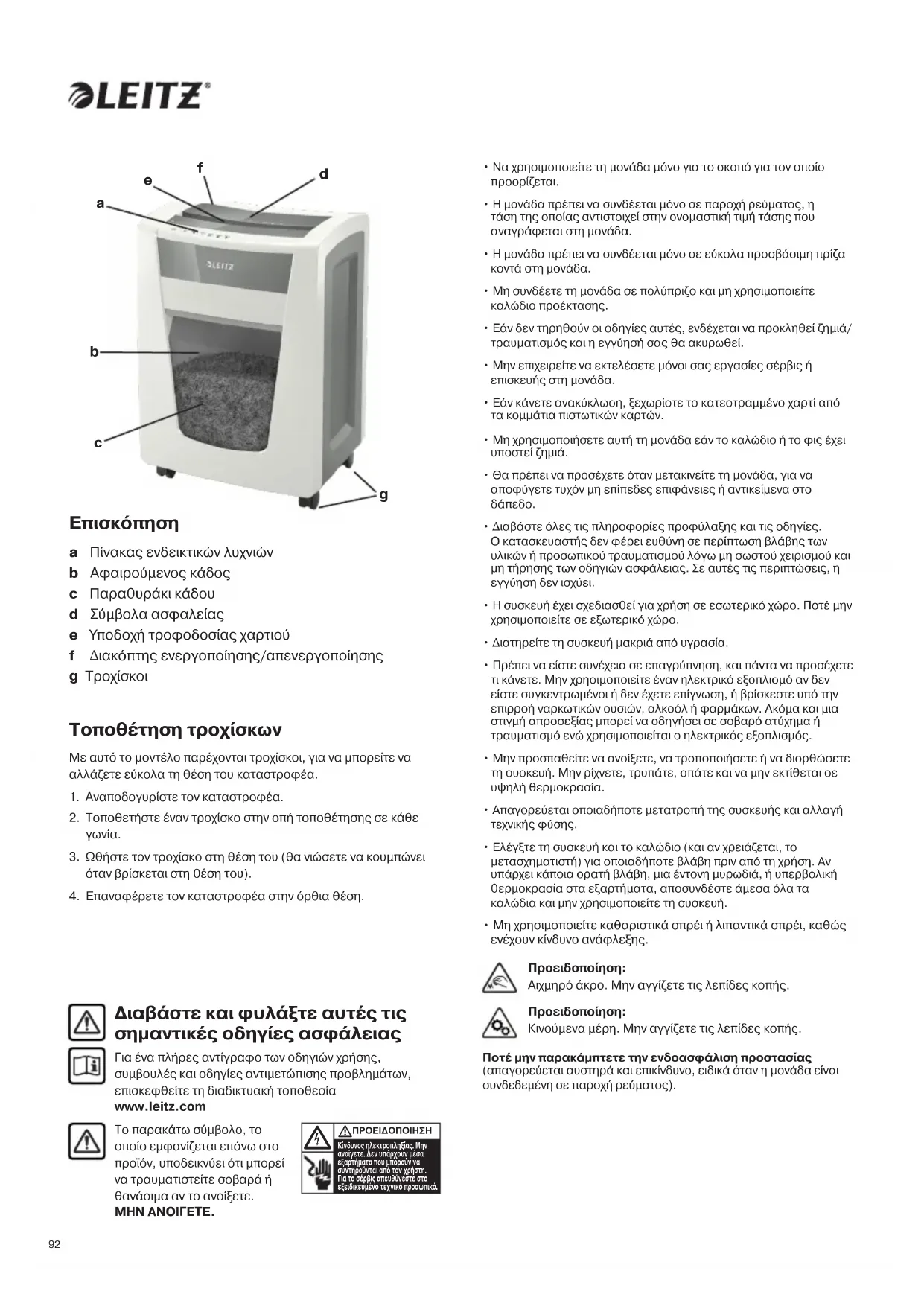 - Μη χρησιμοποιείτε καθαριστικά σπρέι ή λιπαντικά σπρέι, καθώς ενέχουν κίνδυνο ανάφλεξης. Διαβάστε και φυλάξτε αυτές τις σημαντικές οδηγίες ασφάλειας Για ένα πλήρες αντίγραφο των οδηγιών χρήσης, συμβουλές και οδηγίες αντιμετώπισης προβλημάτων, επισκεφθείτε τη διαδικτυακή τοποθεσία www.leitz.com Το παρακάτω σύμβολο, το οποίο εμφανίζεται επάνω στο προϊόν, υποδεικνύει ότι μπορεί να τραυματιστείτε σοβαρά ή θανάσιμα αν το ανοίξετε. ΜΗΝ ΑΝΟΙΓΕΤΕ. Κίνδυνος ηλεκτροπληξίας. Μην ανοίγετε. Δεν υπάρχουν μέσα εξαρτήματα που μπορούν να συντηρούνται από τον χρήστη. Για το σέρβις απευθύνεστε στο εξειδικευμένο τεχνικό προσωπικό. ΠΡΟΕΙΔΟΠΟΙΗΣΗ