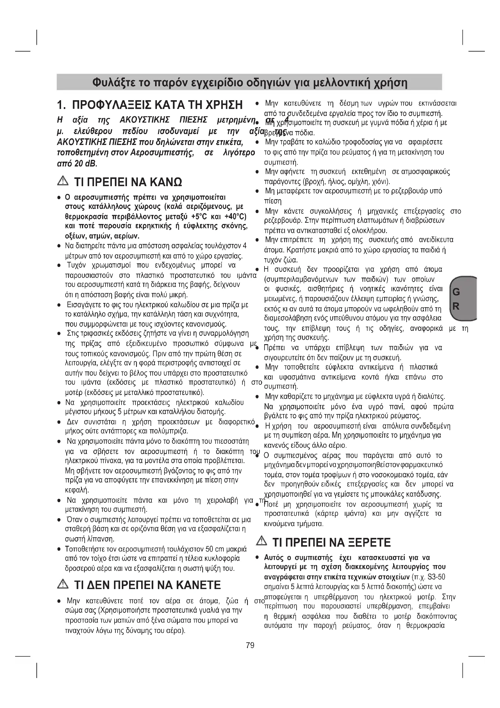 Η αξία της ΑΚΟΥΣΤΙΚΗΣ ΠΙΕΣΗΣ μετρημένη σε 4 μ. ελεύθερου πεδίου ισοδυναμεί με την αξία της ΑΚΟΥΣΤΙΚΗΣΠΙΕΣΗΣπουδηλώνεταιστηνετικέτα, τοποθετημένηστονΑεροσυμπιεστής, σε λιγότερο από20dB. ΤΙ ΠΡΕΠΕΙ ΝΑ ΚΑΝΩ ● Ο αεροσυμπιεστής πρέπει να χρησιμοποιείται στους κατάλληλους χώρους (καλά αεριζόμενους, με θερμοκρασία περιβάλλοντος μεταξύ +5°C και +40°C) και ποτέ παρουσία εκρηκτικής ή εύφλεκτης σκόνης, οξέων, ατμών, αερίων.