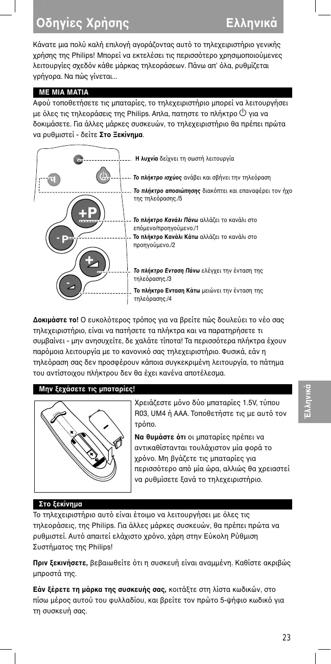 Το πλήκτρο Ενταση Πάνω ελέγχει την ένταση της τηλερασης./3 Το πλήκτρο Ενταση Κάτω µειώνει την ένταση της τηλερασης./4 Μην ξεχάσετε τις µπαταρίες! Χρειάζεστε µνο δύο µπαταρίες 1.5V, τύπου R03, UM4 ή ΑΑΑ. Τοποθετήστε τις µε αυτ τον Να θυµάστε )τι οι µπαταρίες πρέπει να αντικαθίστανται τουλάχιστον µία φορά το χρνο. Μη βγάζετε τις µπαταρίες για περισστερο απ µία ώρα, αλλιώς θα χρειαστεί να ρυθµίσετε ξανά το τηλεχειριστήριο. Στο ξεκίνηµα Το τηλεχειριστήριο αυτ είναι έτοιµο να λειτουργήσει µε λες τις τηλεοράσεις, της Philips. Για άλλες µάρκες συσκευών, θα πρέπει πρώτα να ρυθµιστεί. Αυτ απαιτεί ελάχιστο χρνο, χάρη στην Εύκολη Ρύθµιση Συστήµατος της Philips! Πριν ξεκινήσετε, βεβαιωθείτε τι η συσκευή είναι αναµµένη. Καθίστε ακριβώς µπροστά της. Εάν ξέρετε τη µάρκα της συσκευής σας, κοιτάξτε στη λίστα κωδικών, στο πίσω µέρος αυτού του φυλλαδίου, και βρείτε τον πρώτο 5-ψήφιο κωδικ για τη συσκευή σας.