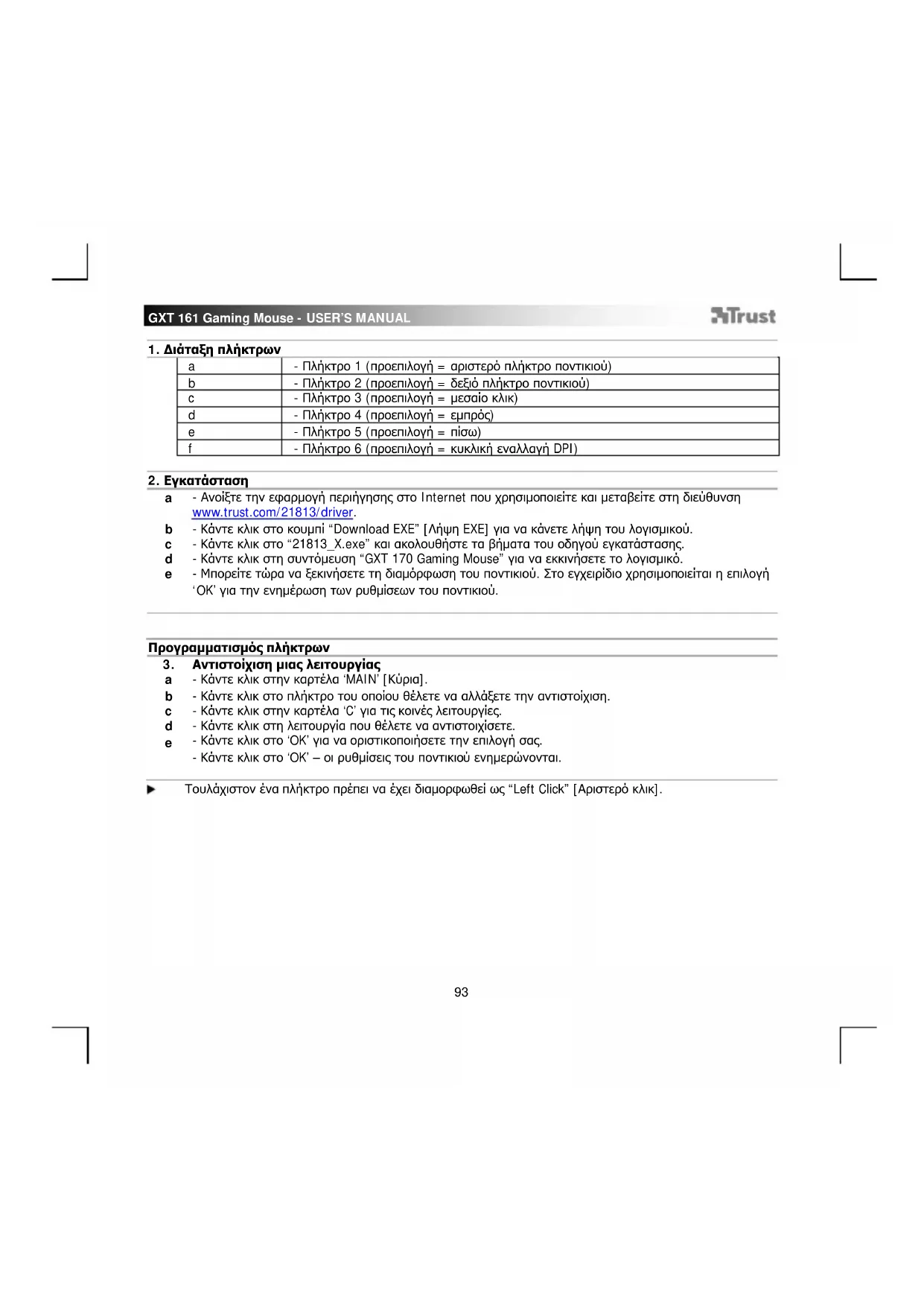 Τουλάχιστον ένα πλήκτρο πρέπει να έχει διαμορφωθεί ως “Left Click” [Αριστερό κλικ].GXT 161 Gaming Mouse - USER’S MANUAL