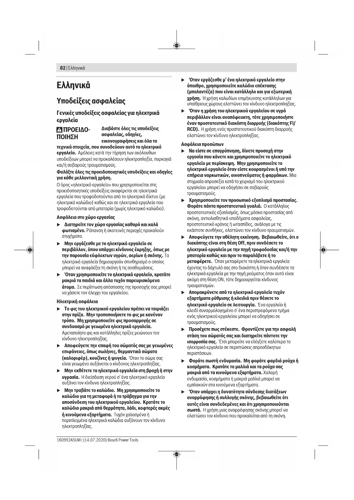 u Δώστε το ηλεκτρικό εργαλείο σας για συντήρηση από εξειδικευμένο προσωπικό, χρησιμοποιώντας μόνο γνήσια ανταλλακτικά. Έτσι εξασφαλίζετε τη διατήρηση της ασφάλειας του ηλεκτρικού εργαλείου. u Μη συντηρείτε ποτέ χαλασμένες μπαταρίες. Κάθε συντήρηση των μπαταριών πρέπει να πραγματοποιείται μόνο από τον κατασκευαστή ή από εξουσιοδοτημένα συνεργεία σέρβις πελατών. Υποδείξεις ασφαλείας για κρουστικά κατσαβίδια u Κρατάτε το ηλεκτρικό εργαλείο από τις μονωμένες επιφάνειες λαβής, όταν εκτελείτε μια εργασία, κατά την οποία η βίδα μπορεί να έρθει σε επαφή με κρυμμένη καλωδίωση. Η επαφή της βίδας με ένα ηλεκτροφόρο καλώδιο μπορεί να θέσει τα ακάλυπτα μεταλλικά μέρη του ηλεκτρικού εργαλείου υπό τάση και να προκαλέσουν ηλεκτροπληξία στον χειριστή. Bosch Power Tools 160992A5UW | (14.07.2020)84 | Ελληνικά u Χρησιμοποιείτε κατάλληλες συσκευές ανίχνευσης για να εντοπίσετε τυχόν μη ορατούς αγωγούς τροφοδοσίας ή συμβουλευτείτε την τοπική εταιρία παροχής ενέργειας. Ηεπαφή με ηλεκτρικούς αγωγούς μπορεί να οδηγήσει σε πυρκαγιά και ηλεκτροπληξία. Ηπρόκληση ζημιάς σ’ έναν αγωγό φωταερίου (γκαζιού) μπορεί να οδηγήσει σε έκρηξη. Το τρύπημα ενός υδροσωλήνα προκαλεί υλικές ζημιές. u Κρατάτε το ηλεκτρικό εργαλείο σταθερά. Κατά το σφίξιμο και λύσιμο των βιδών μπορούν να εμφανιστούν για λίγο υψηλές ροπές αντίδρασης. u Ασφαλίστε το επεξεργαζόμενο κομμάτι. Ένα επεξεργαζόμενο κομμάτι συγκρατιέται ασφαλέστερα με μια διάταξη σύσφιγξης ή με μια μέγγενη παρά με το χέρι σας. u Περιμένετε, μέχρι να ακινητοποιηθεί το ηλεκτρικό εργαλείο, προτού το εναποθέσετε. Το τοποθετημένο εξάρτημα μπορεί να σφηνώσει και να οδηγήσει στην απώλεια του ελέγχου του ηλεκτρικού εργαλείου. u Σε περίπτωση βλάβης ή/και αντικανονικής χρήσης της μπαταρίας μπορεί να εξέλθουν αναθυμιάσεις από την μπαταρία. Η μπαταρία μπορεί να αναφλεγεί ή να εκραγεί.Αφήστε να μπει φρέσκος αέρας και επισκεφτείτε έναν γιατρό σε περίπτωση που έχετε ενοχλήσεις. Οι αναθυμιάσεις μπορεί να ερεθίσουν τις αναπνευστικές