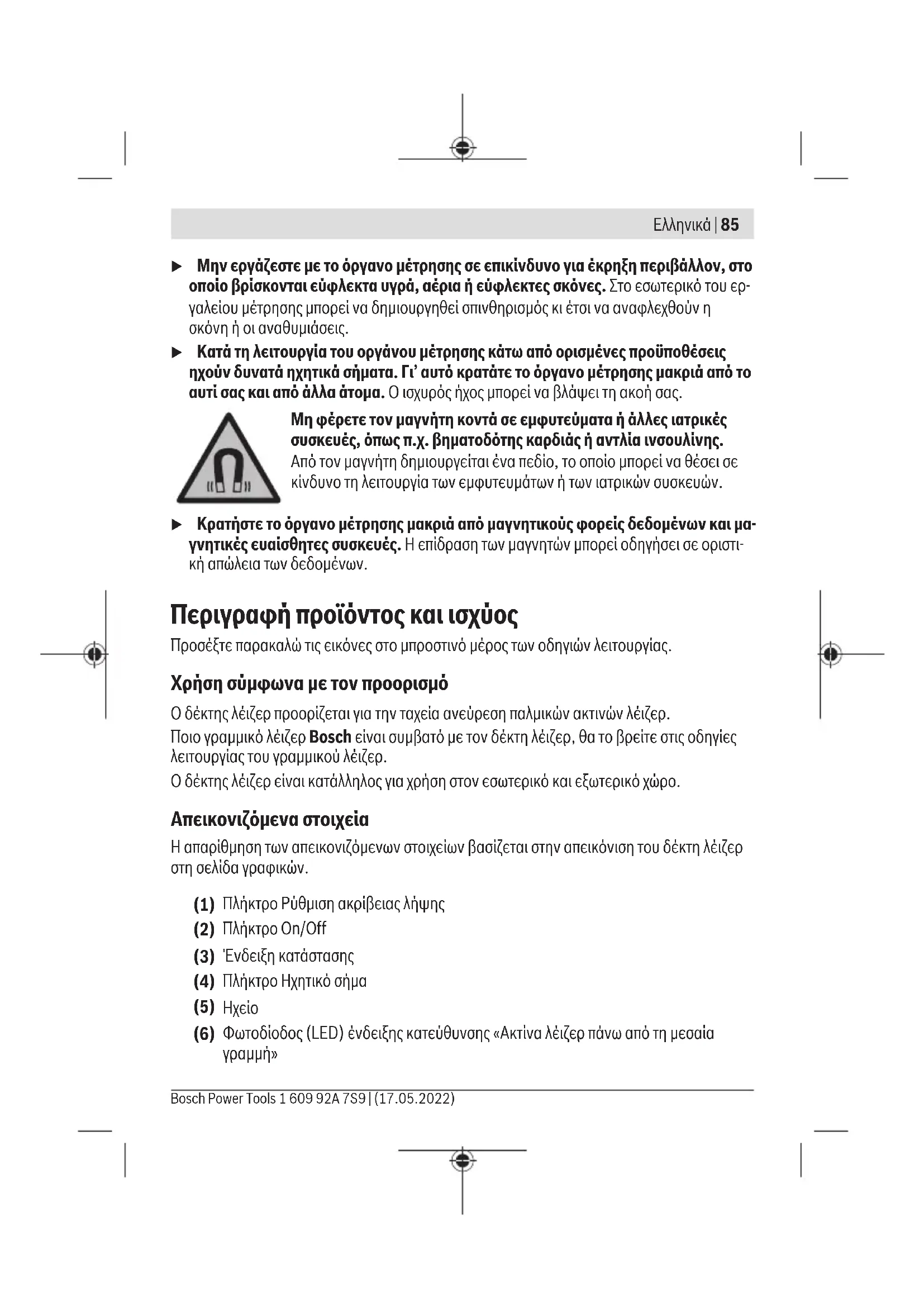 u Αναθέστε την επισκευή του οργάνου μέτρησης μόνο σε ειδικευμένο τεχνικό προ- σωπικό και μόνο με γνήσια ανταλλακτικά. Μ’ αυτόν τον τρόπο εξασφαλίζεται η διατή- ρηση της ασφαλούς λειτουργίας του εργαλείου μέτρησης. 1 609 92A 7S9 | (17.05.2022) Bosch Power ToolsΕλληνικά | 85 u Μην εργάζεστε με το όργανο μέτρησης σε επικίνδυνο για έκρηξη περιβάλλον, στο οποίο βρίσκονται εύφλεκτα υγρά, αέρια ή εύφλεκτες σκόνες. Στο εσωτερικό του ερ- γαλείου μέτρησης μπορεί να δημιουργηθεί σπινθηρισμός κι έτσι να αναφλεχθούν η σκόνη ή οι αναθυμιάσεις. u Κατά τη λειτουργία του οργάνου μέτρησης κάτω από ορισμένες προϋποθέσεις ηχούν δυνατά ηχητικά σήματα. Γι’ αυτό κρατάτε το όργανο μέτρησης μακριά από το αυτί σας και από άλλα άτομα. Ο ισχυρός ήχος μπορεί να βλάψει τη ακοή σας. Μη φέρετε τον μαγνήτη κοντά σε εμφυτεύματα ή άλλες ιατρικές συσκευές, όπως π.χ. βηματοδότης καρδιάς ή αντλία ινσουλίνης. Από τον μαγνήτηδημιουργείται ένα πεδίο, το οποίο μπορεί να θέσει σε κίνδυνο τη λειτουργία των εμφυτευμάτων ή των ιατρικών συσκευών. u Κρατήστε το όργανο μέτρησης μακριά από μαγνητικούς φορείς δεδομένων και μα- γνητικές ευαίσθητες συσκευές. Η επίδραση των μαγνητών μπορεί οδηγήσει σε οριστι- κή απώλεια των δεδομένων. Περιγραφή προϊόντος και ισχύος Προσέξτε παρακαλώ τις εικόνες στο μπροστινό μέρος των οδηγιών λειτουργίας. Χρήση σύμφωνα με τον προορισμό Ο δέκτης λέιζερ προορίζεται για την ταχεία ανεύρεση παλμικών ακτινών λέιζερ. Ποιο γραμμικό λέιζερBosch είναι συμβατό με τον δέκτη λέιζερ, θα το βρείτε στις οδηγίες λειτουργίας του γραμμικού λέιζερ. Ο δέκτης λέιζερ είναι κατάλληλος για χρήση στον εσωτερικό και εξωτερικό χώρο. Απεικονιζόμενα στοιχεία Η απαρίθμηση των απεικονιζόμενων στοιχείων βασίζεται στην απεικόνιση του δέκτη λέιζερ στη σελίδα γραφικών. (1) Πλήκτρο Ρύθμιση ακρίβειας λήψης (2) Πλήκτρο On/Off (3) Ένδειξη κατάστασης (4) Πλήκτρο Ηχητικό σήμα (5)