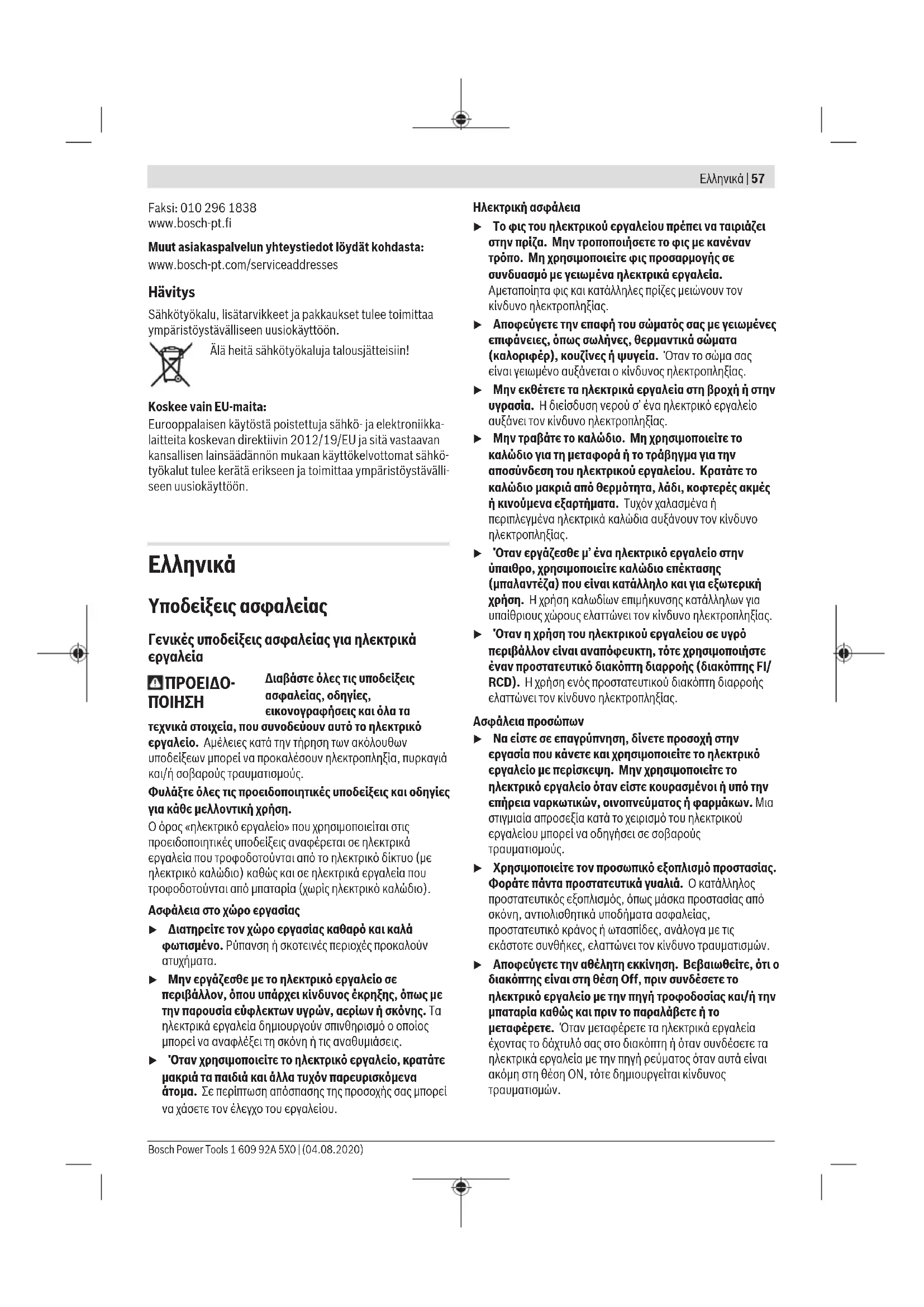 u Μην εργάζεσθε με το ηλεκτρικό εργαλείο σε περιβάλλον, όπου υπάρχει κίνδυνος έκρηξης, όπως με την παρουσία εύφλεκτων υγρών, αερίων ή σκόνης. Τα ηλεκτρικά εργαλεία δημιουργούν σπινθηρισμό ο οποίος μπορεί να αναφλέξει τη σκόνη ή τις αναθυμιάσεις. u Όταν χρησιμοποιείτε το ηλεκτρικό εργαλείο, κρατάτε μακριά τα παιδιά και άλλα τυχόν παρευρισκόμενα άτομα. Σε περίπτωση απόσπασης της προσοχής σας μπορεί να χάσετε τον έλεγχο του εργαλείου. Ηλεκτρική ασφάλεια u Το φις του ηλεκτρικού εργαλείου πρέπει να ταιριάζει στην πρίζα. Μην τροποποιήσετε το φις με κανέναν τρόπο. Μη χρησιμοποιείτε φις προσαρμογής σε συνδυασμό με γειωμένα ηλεκτρικά εργαλεία. Αμεταποίητα φις και κατάλληλες πρίζες μειώνουν τον κίνδυνο ηλεκτροπληξίας. u Αποφεύγετε την επαφή του σώματός σας με γειωμένες επιφάνειες, όπως σωλήνες, θερμαντικά σώματα (καλοριφέρ), κουζίνες ή ψυγεία. Όταν το σώμα σας είναι γειωμένο αυξάνεται ο κίνδυνος ηλεκτροπληξίας. u Μην εκθέτετε τα ηλεκτρικά εργαλεία στη βροχή ή στην υγρασία. Η διείσδυση νερού σ’ ένα ηλεκτρικό εργαλείο αυξάνει τον κίνδυνο ηλεκτροπληξίας. u Μην τραβάτε το καλώδιο. Μη χρησιμοποιείτε το καλώδιο για τη μεταφορά ή το τράβηγμα για την αποσύνδεση του ηλεκτρικού εργαλείου. Κρατάτε το καλώδιο μακριά από θερμότητα, λάδι, κοφτερές ακμές ή κινούμενα εξαρτήματα. Τυχόν χαλασμένα ή περιπλεγμένα ηλεκτρικά καλώδια αυξάνουν τον κίνδυνο ηλεκτροπληξίας. u Όταν εργάζεσθε μ’ ένα ηλεκτρικό εργαλείο στην ύπαιθρο, χρησιμοποιείτε καλώδιο επέκτασης (μπαλαντέζα) που είναι κατάλληλο και για εξωτερική χρήση. Ηχρήση καλωδίων επιμήκυνσης κατάλληλων για υπαίθριους χώρους ελαττώνει τον κίνδυνο ηλεκτροπληξίας. u Όταν η χρήση του ηλεκτρικού εργαλείου σε υγρό περιβάλλον είναι αναπόφευκτη, τότε χρησιμοποιήστε έναν προστατευτικό διακόπτη διαρροής (διακόπτηςFI/ RCD). Ηχρήση ενός προστατευτικού διακόπτη διαρροής ελαττώνει τον κίνδυνο ηλεκτροπληξίας. Ασφάλεια προσώπων u Να είστε σε επαγρύπνηση, δίνετε προσοχή στην εργασία που κάνετε και χρησιμοποιείτε το ηλεκτρικό εργαλείο με περίσκεψη. Μην χρησιμοποιείτε το ηλεκτρικό εργαλείο όταν είστε κουρασμένοι ή υπό την επήρεια ναρκωτικών, οινοπνεύματος ή φαρμάκων. Μια στιγμιαία απροσεξία κατά το χειρισμό του ηλεκτρικού εργαλείου μπορεί να οδηγήσει σε σοβαρούς τραυματισμούς. u Χρησιμοποιείτε τον προσωπικό εξοπλισμό προστασίας. Φοράτε πάντα προστατευτικά γυαλιά. Ο κατάλληλος προστατευτικός εξοπλισμός, όπως μάσκα προστασίας από σκόνη, αντιολισθητικά υποδήματα ασφαλείας, προστατευτικό κράνος ή ωτασπίδες, ανάλογα με τις εκάστοτε συνθήκες, ελαττώνει τον κίνδυνο τραυματισμών. u Αποφεύγετε την αθέλητη εκκίνηση. Βεβαιωθείτε, ότι ο διακόπτης είναι στη θέση Off, πριν συνδέσετε το ηλεκτρικό εργαλείο με την πηγή τροφοδοσίας και/ή την μπαταρία καθώς και πριν το παραλάβετε ή το μεταφέρετε. Όταν μεταφέρετε τα ηλεκτρικά εργαλεία έχοντας το δάχτυλό σας στο διακόπτη ή όταν συνδέσετε τα ηλεκτρικά εργαλεία με την πηγή ρεύματος όταν αυτά είναι ακόμη στη θέση ΟΝ, τότε δημιουργείται κίνδυνος τραυματισμών. Bosch Power Tools 1 609 92A 5X0 | (04.08.2020)58 | Ελληνικά u Απομακρύνετε από το ηλεκτρικό εργαλείο τυχόν εξαρτήματα ρύθμισης ή κλειδιά πριν θέσετε το ηλεκτρικό εργαλείο σε λειτουργία. Ένα εργαλείο ή κλειδί συναρμολογημένο σ’ ένα περιστρεφόμενο τμήμα ενός ηλεκτρικού εργαλείου μπορεί να οδηγήσει σε τραυματισμούς. u Προσέχετε πως στέκεστε. Φροντίζετε