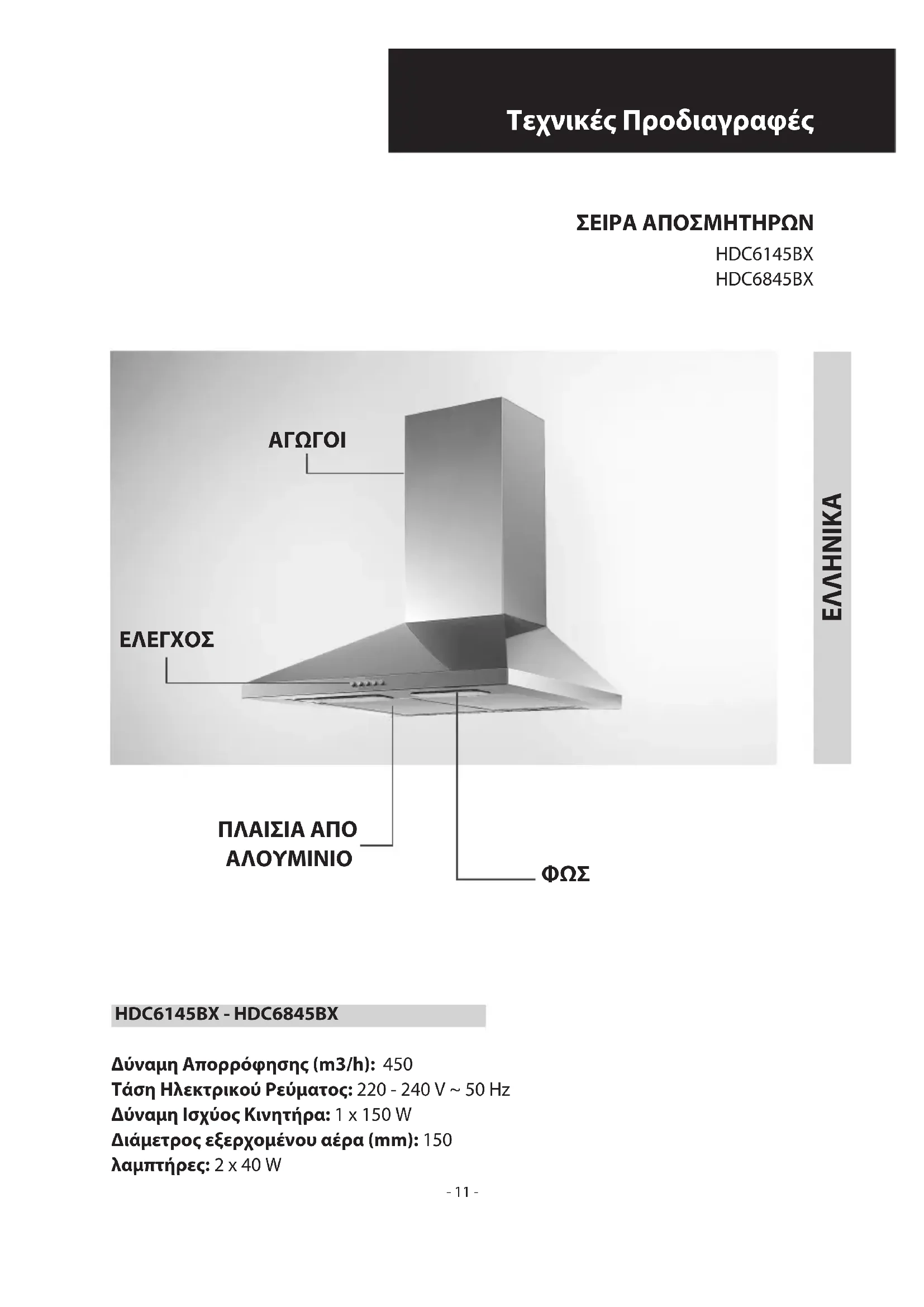 EΛΛHNIKA Τεχνικές Προδιαγραφές ΣΕΙΡΑ ΑΠΟΣΜΗΤΗΡΩΝ Δύναμη Απορρόφησης (m3/h): 450 Τάση Ηλεκτρικού Ρεύματος: 220 - 240 V ~ 50 Hz Δύναμη Ισχύος Κινητήρα: 1 x 150 W Διάμετρος εξερχομένου αέρα (mm): 150 λαμπτήρες: 2 x 40 W
