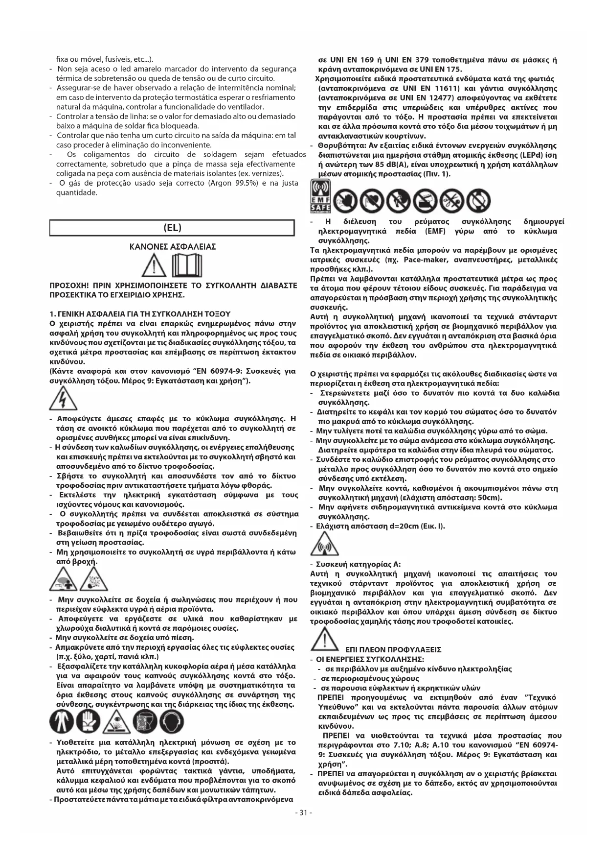 Αυτή η συγκολλητική μηχανή ικανοποιεί τα τεχνικά στάνταρντ προϊόντος για αποκλειστική χρήση σε βιομηχανικό περιβάλλον για επαγγελματικό σκοπό. Δεν εγγυάται η ανταπόκριση στα βασικά όρια που αφορούν την έκθεση του ανθρώπου στα ηλεκτρομαγνητικά πεδία σε οικιακό περιβάλλον. Ο χειριστής πρέπει να εφαρμόζει τις ακόλουθες διαδικασίες ώστε να περιορίζεται η έκθεση στα ηλεκτρομαγνητικά πεδία: - Στερεώνετετε μαζί όσο το δυνατόν πιο κοντά τα δυο καλώδια συγκόλλησης. - Διατηρείτε το κεφάλι και τον κορμό του σώματος όσο το δυνατόν πιο μακρυά από το κύκλωμα συγκόλλησης. - Μην τυλίγετε ποτέ τα καλώδια συγκόλλησης γύρω από το σώμα. - Μην συγκολλείτε με το σώμα ανάμεσα στο κύκλωμα συγκόλλησης. Διατηρείτε αμφότερα τα καλώδια στην ίδια πλευρά του σώματος. - Συνδέστε το καλώδιο επιστροφής του ρεύματος συγκόλλησης στο μέταλλο προς συγκόλληση όσο το δυνατόν πιο κοντά στο σημείο σύνδεσης υπό εκτέλεση. - Μην συγκολλείτε κοντά, καθισμένοι ή ακουμπισμένοι πάνω στη συγκολλητική μηχανή (ελάχιστη απόσταση: 50cm). - Μην αφήνετε σιδηρομαγνητικά αντικείμενα κοντά στο κύκλωμα συγκόλλησης. - Ελάχιστη απόσταση d=20cm (Εικ. I). - Συσκευή κατηγορίας A: Αυτή η συγκολλητική μηχανή ικανοποιεί τις απαιτήσεις του τεχνικού στάρνταντ προϊόντος για αποκλειστική χρήση σε βιομηχανικό περιβάλλον και για επαγγελματικό σκοπό. Δεν εγγυάται η ανταπόκριση στην ηλεκτρομαγνητική συμβατότητα σε οικιακό περιβάλλον και όπου υπάρχει άμεση σύνδεση σε δίκτυο τροφοδοσίας χαμηλής τάσης που τροφοδοτεί κατοικίες. ΕΠΙ ΠΛΕΟΝ ΠΡΟΦΥΛΑΞΕΙΣ - ΟΙ ΕΝΕΡΓΕΙΕΣ ΣΥΓΚΟΛΛΗΣΗΣ: - σε περιβάλλον με αυξημένο κίνδυνο ηλεκτροληξίας - σε περιορισμένους χώρους - σε παρουσια εύφλεκτων ή εκρηκτικών υλών ΠΡΕΠΕΙ προηγουμένως να εκτιμηθούν από έναν ”Τεχνικό Υπεύθυνο” και να εκτελούνται πάντα παρουσία άλλων ατόμων εκπαιδευμένων ως προς τις επεμβάσεις σε περίπτωση άμεσου